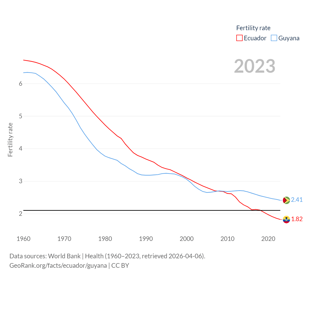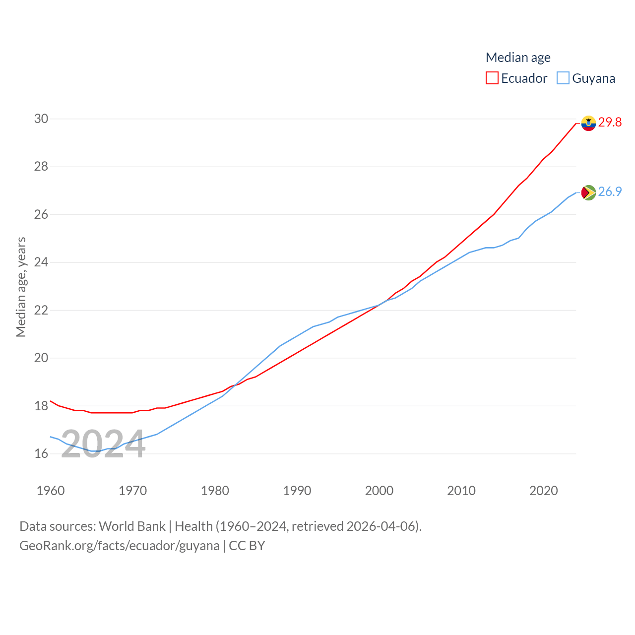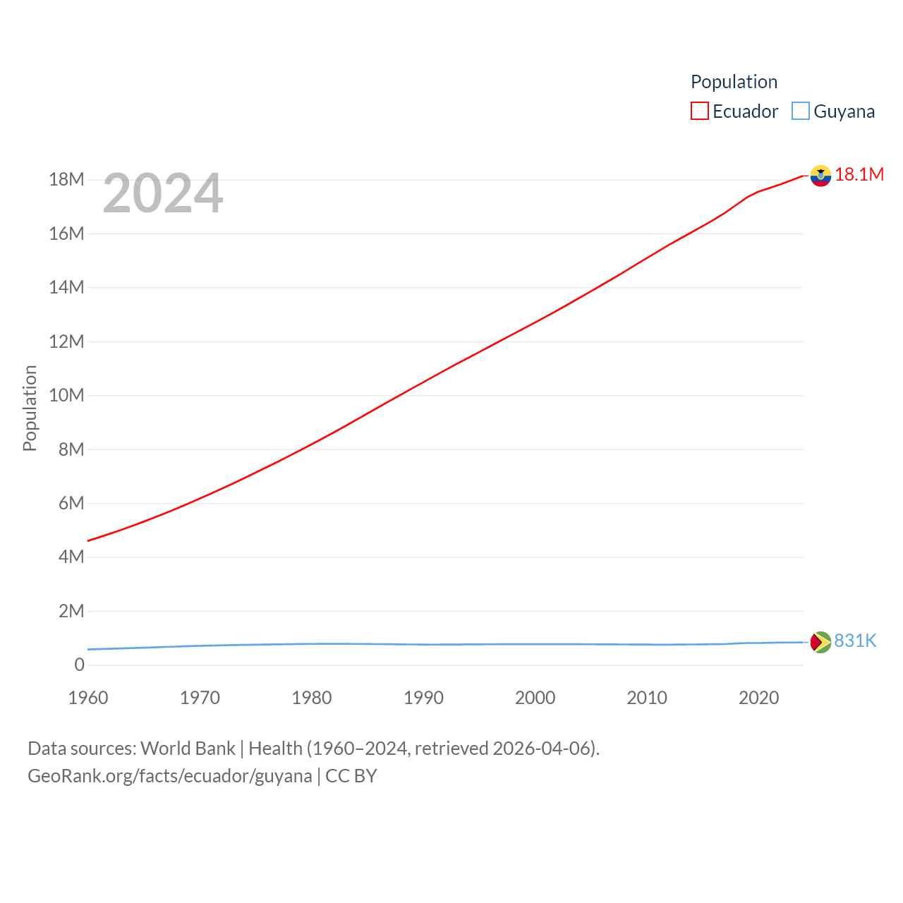 Ecuador has a population of 18.1M (ranked 71/197), compared with 831K in Guyana (ranked 161/197). Ecuador's land area is 95,892 sq mi versus 81,522 sq mi for Guyana (ranked 76th vs. 82nd).