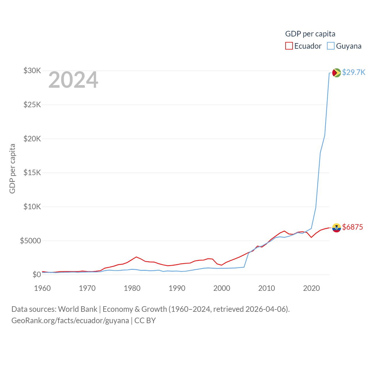 By GDP, Ecuador ranks 62/197 ($125B) and Guyana ranks 120/197 ($24.7B). By GDP per capita, Ecuador ranks 103/197 ($6,875), while Guyana ranks 41/197 ($29,675).