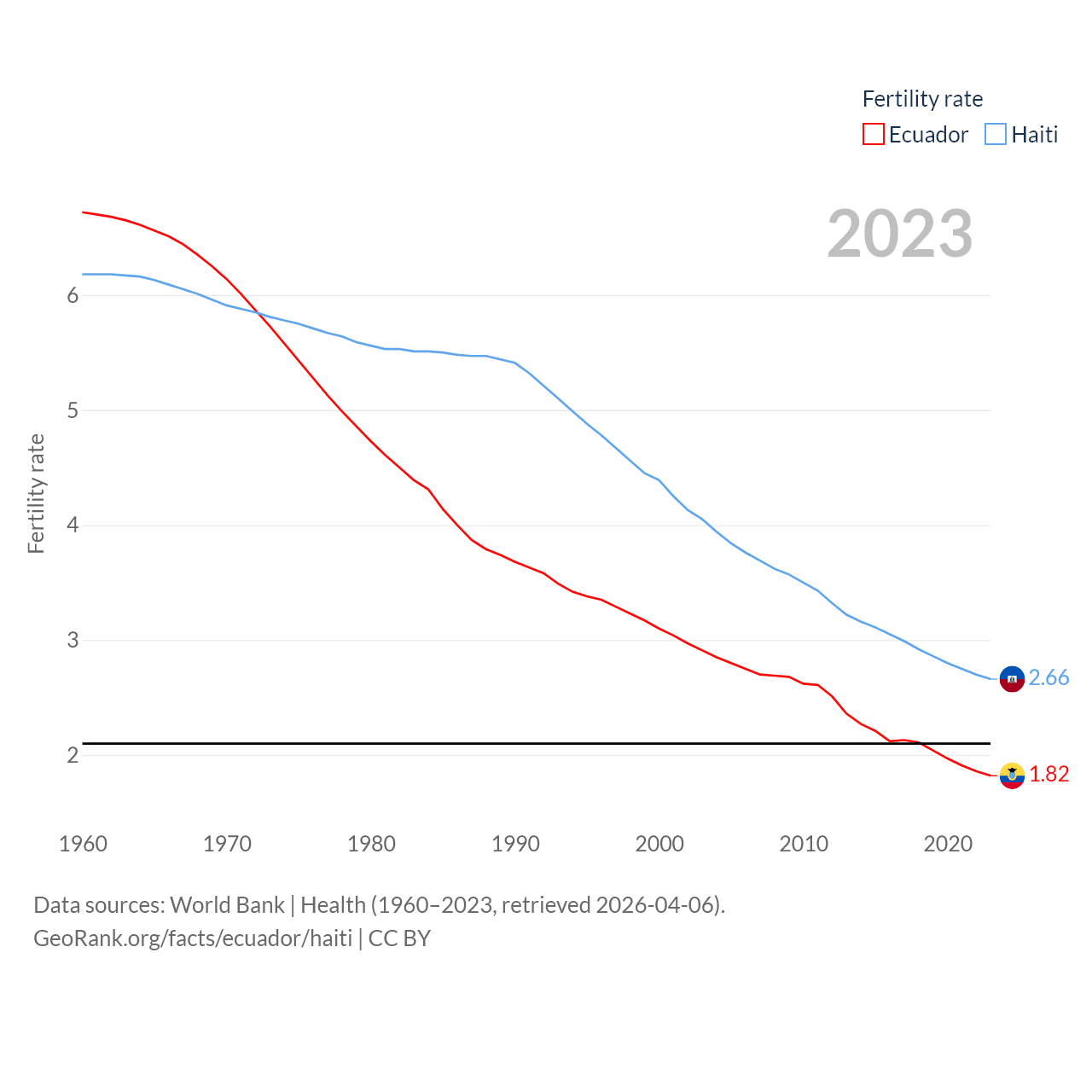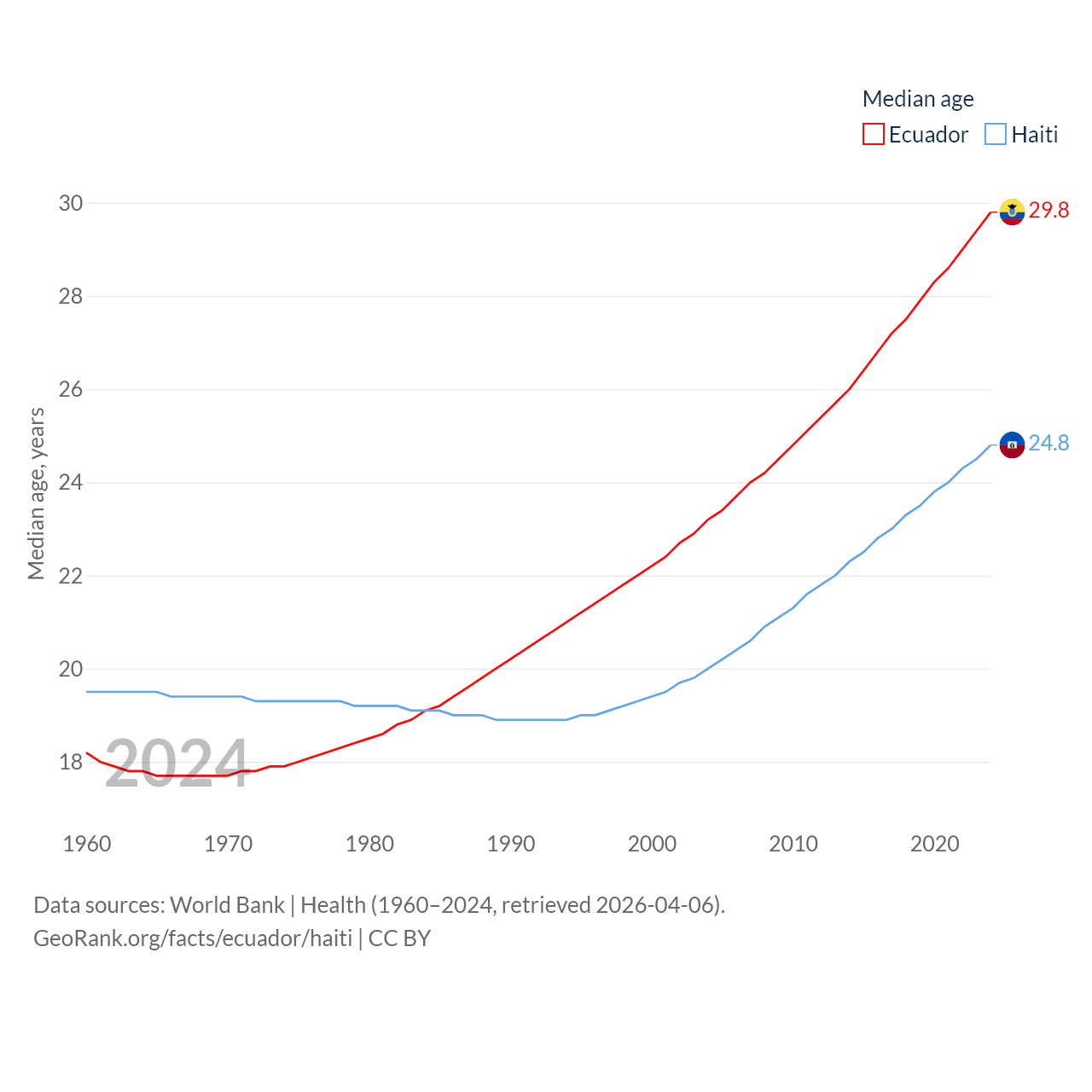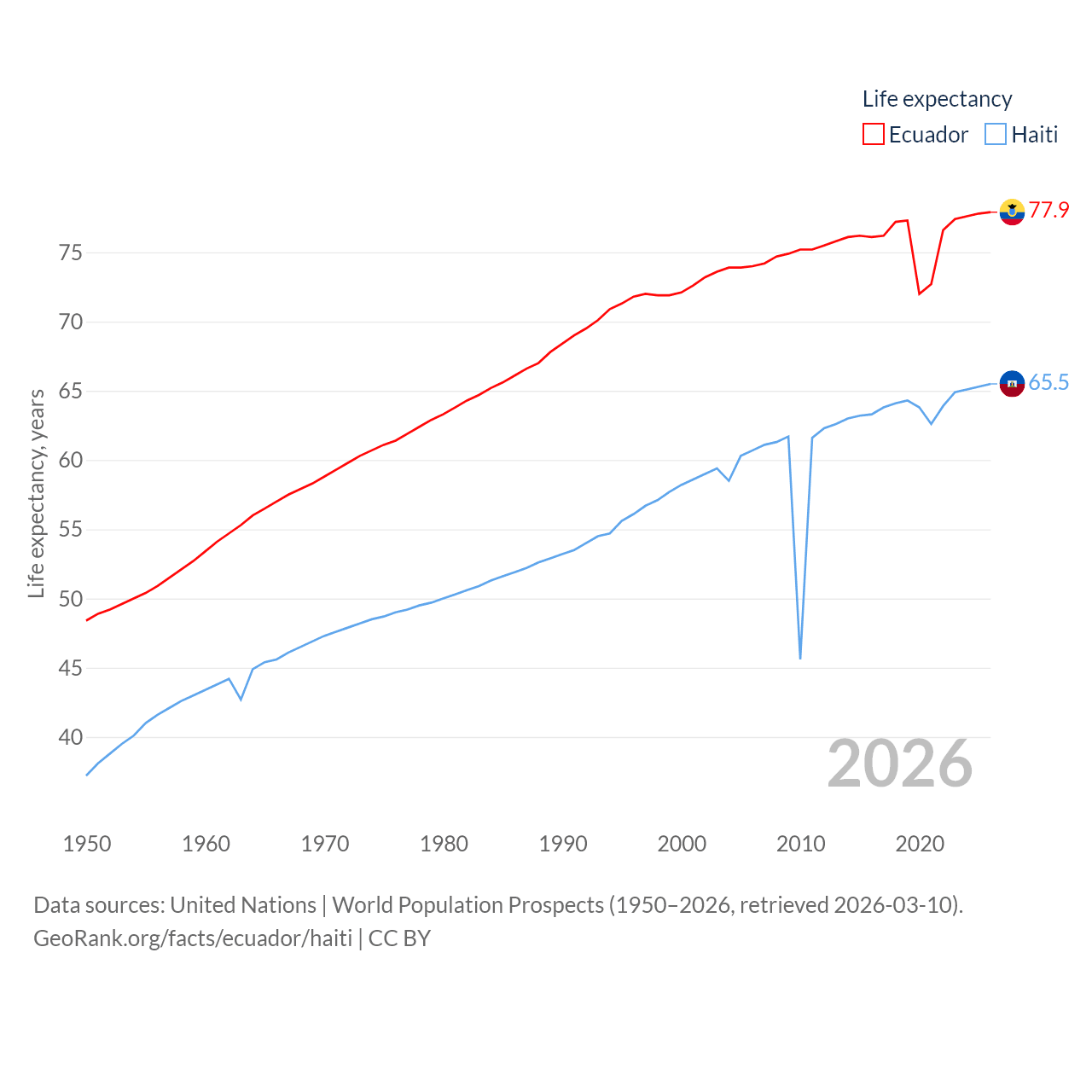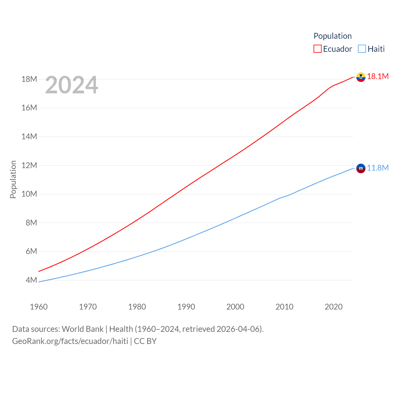 Ecuador has a population of 18.1M (ranked 71/197), compared with 11.8M in Haiti (ranked 83/197). Ecuador's land area is 95,892 sq mi versus 10,641 sq mi for Haiti (ranked 76th vs. 142nd).