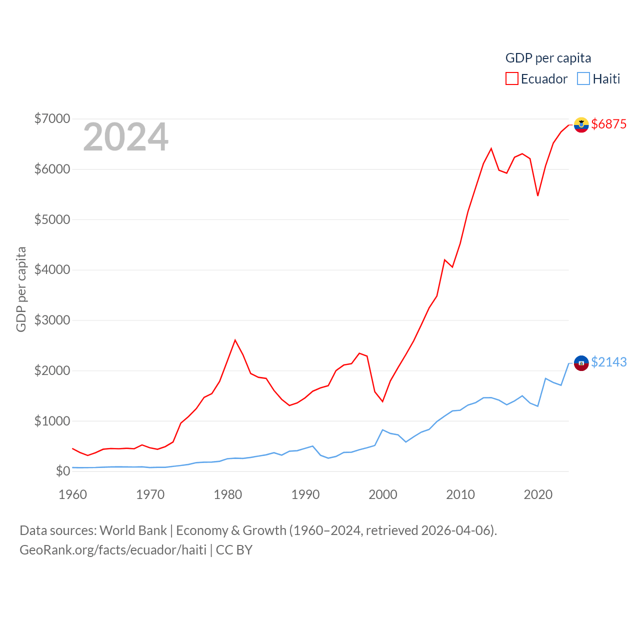 By GDP, Ecuador ranks 62/197 ($125B) and Haiti ranks 117/197 ($25.2B). By GDP per capita, Ecuador ranks 103/197 ($6,875), while Haiti ranks 153/197 ($2,143).
