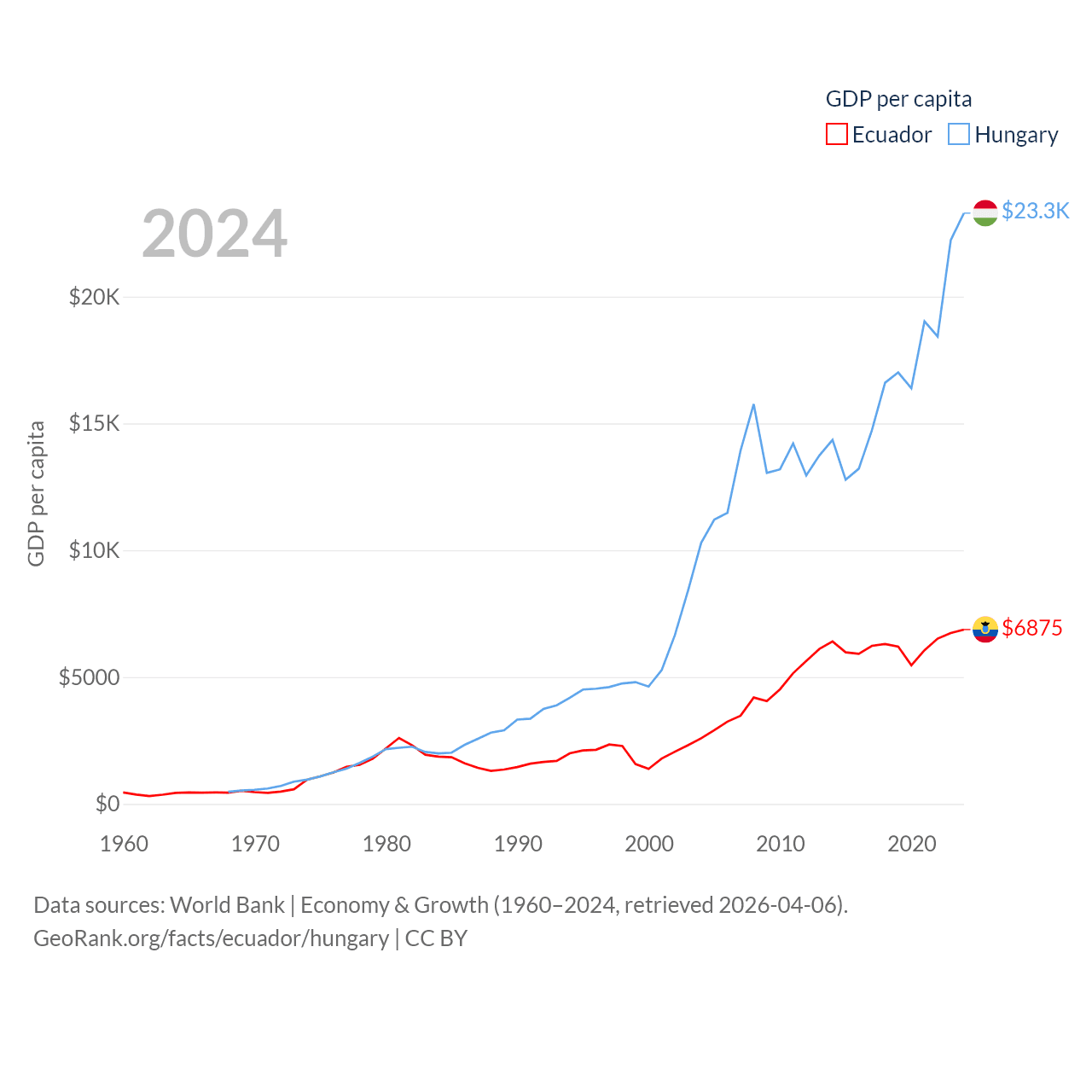 By GDP, Ecuador ranks 62/197 ($125B) and Hungary ranks 55/197 ($223B). By GDP per capita, Ecuador ranks 103/197 ($6,875), while Hungary ranks 55/197 ($23,292).
