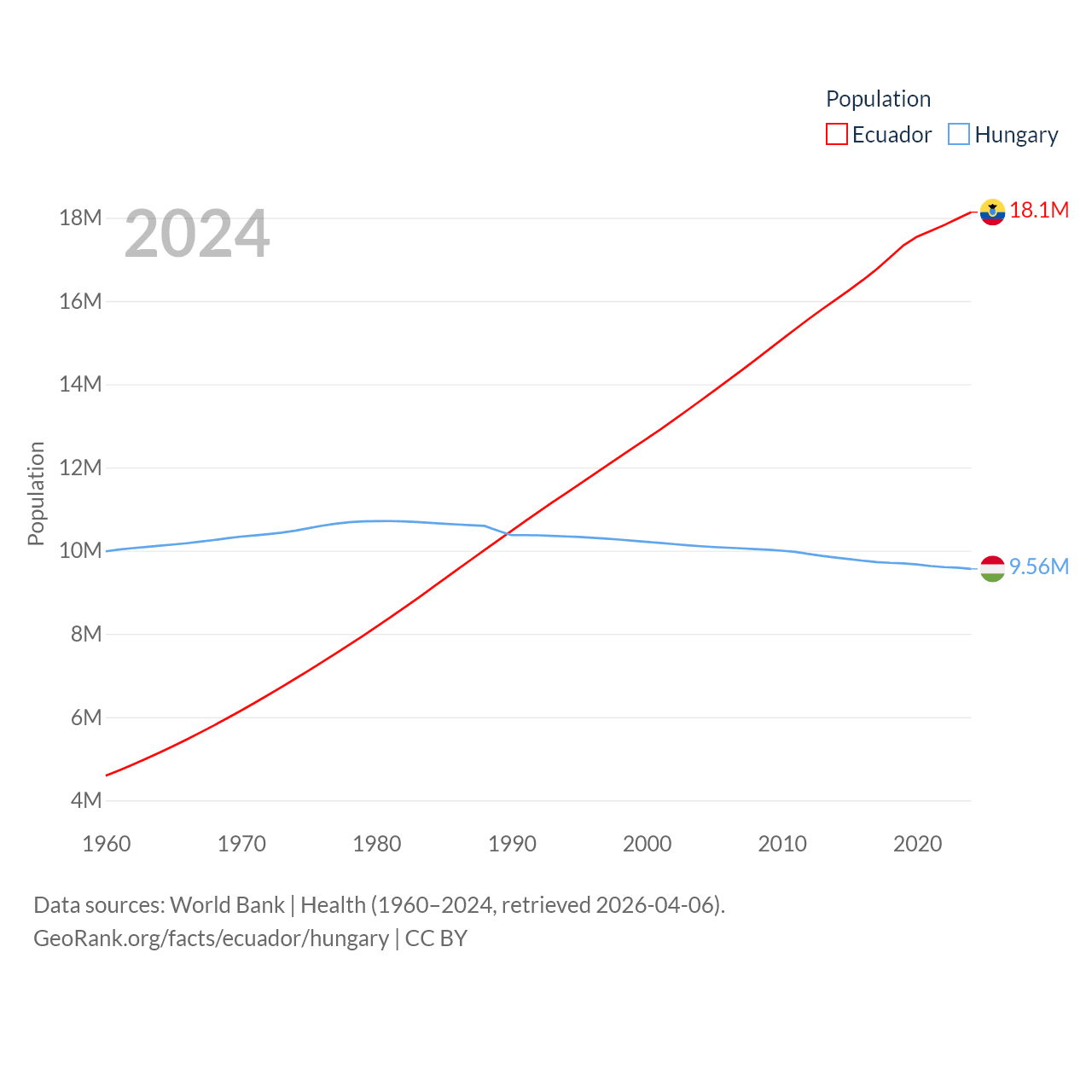 Ecuador has a population of 18.1M (ranked 71/197), compared with 9.56M in Hungary (ranked 97/197). Ecuador's land area is 95,892 sq mi versus 35,236 sq mi for Hungary (ranked 76th vs. 109th).