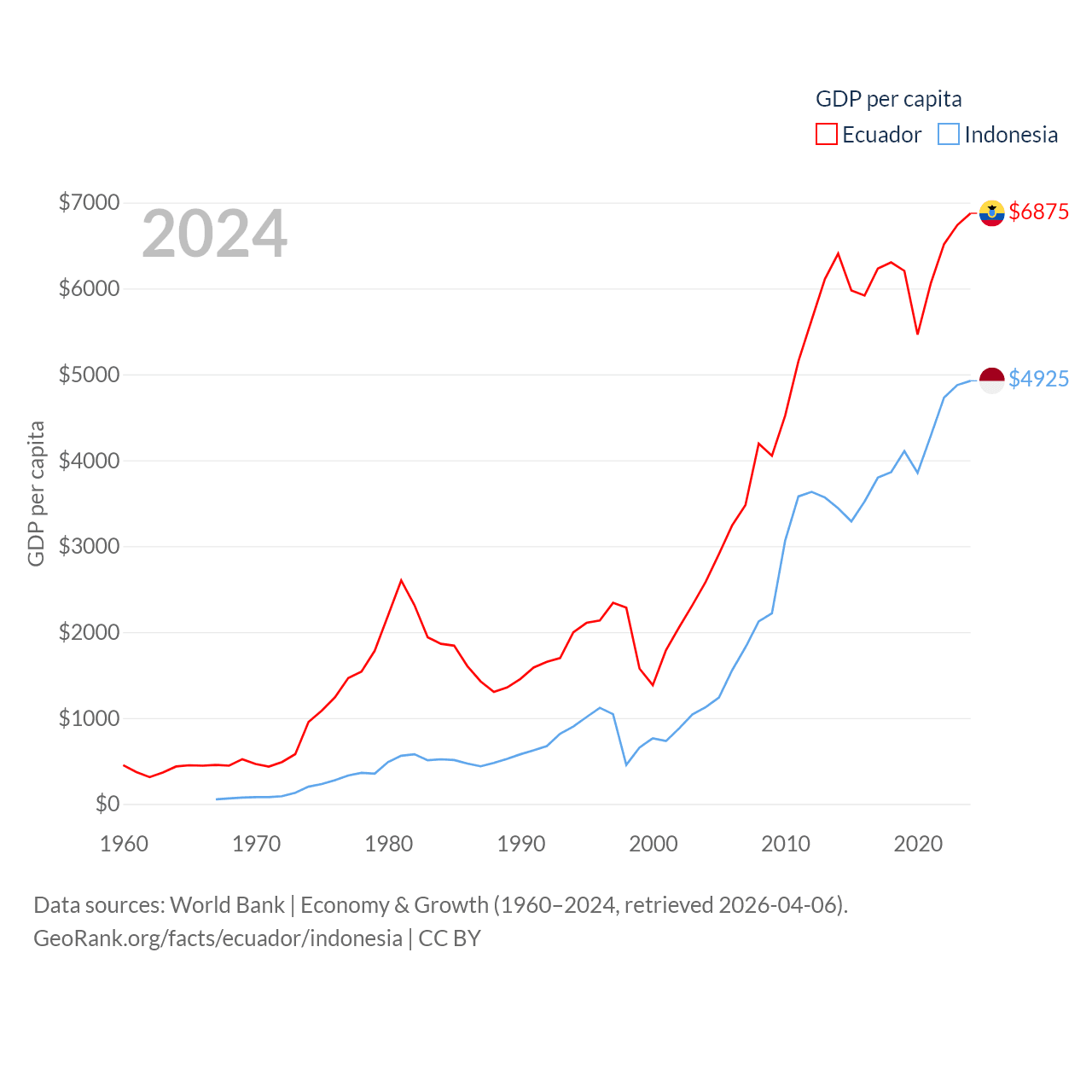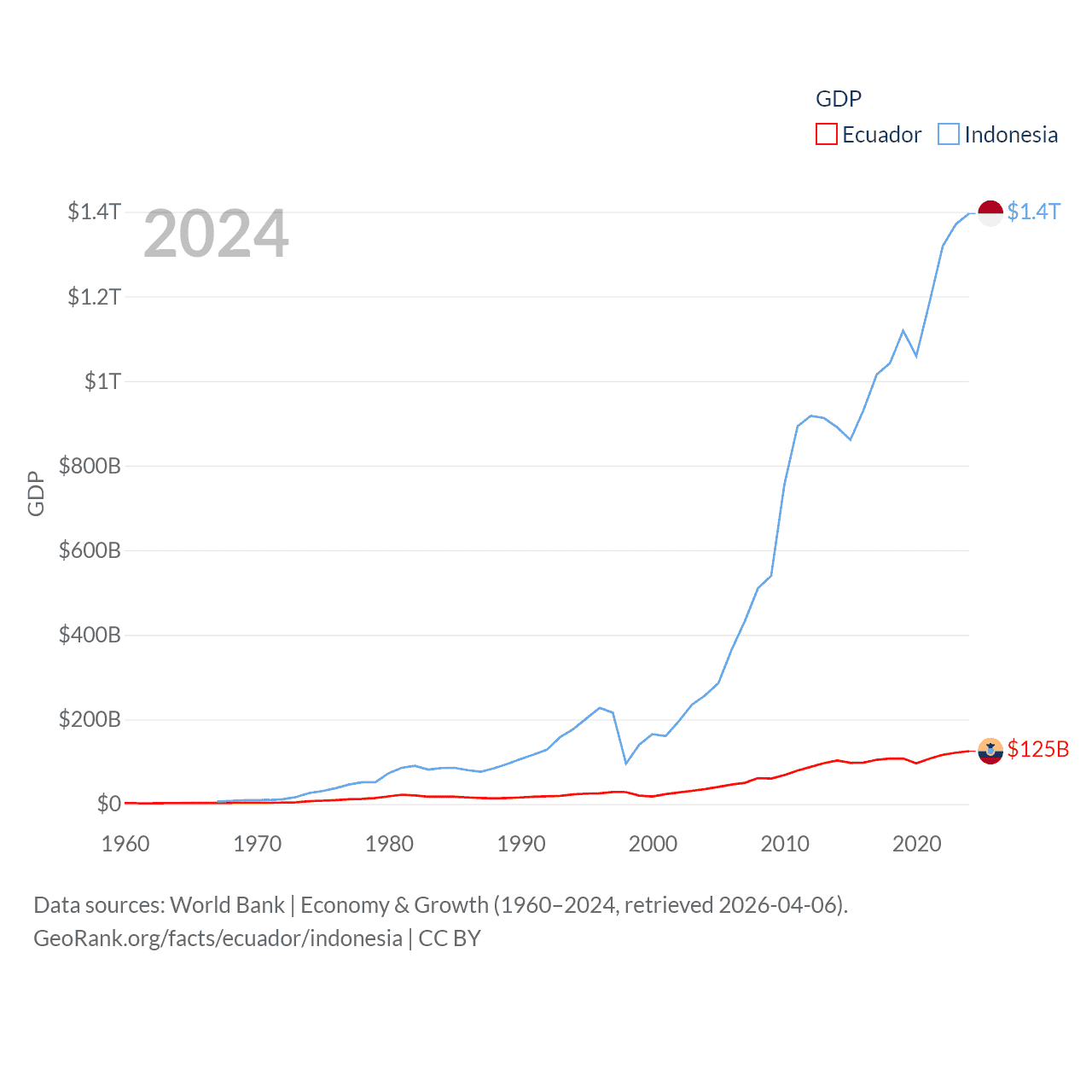 By GDP, Ecuador ranks 62/197 ($125B) and Indonesia ranks 16/197 ($1.4T). By GDP per capita, Ecuador ranks 103/197 ($6,875), while Indonesia ranks 121/197 ($4,925).