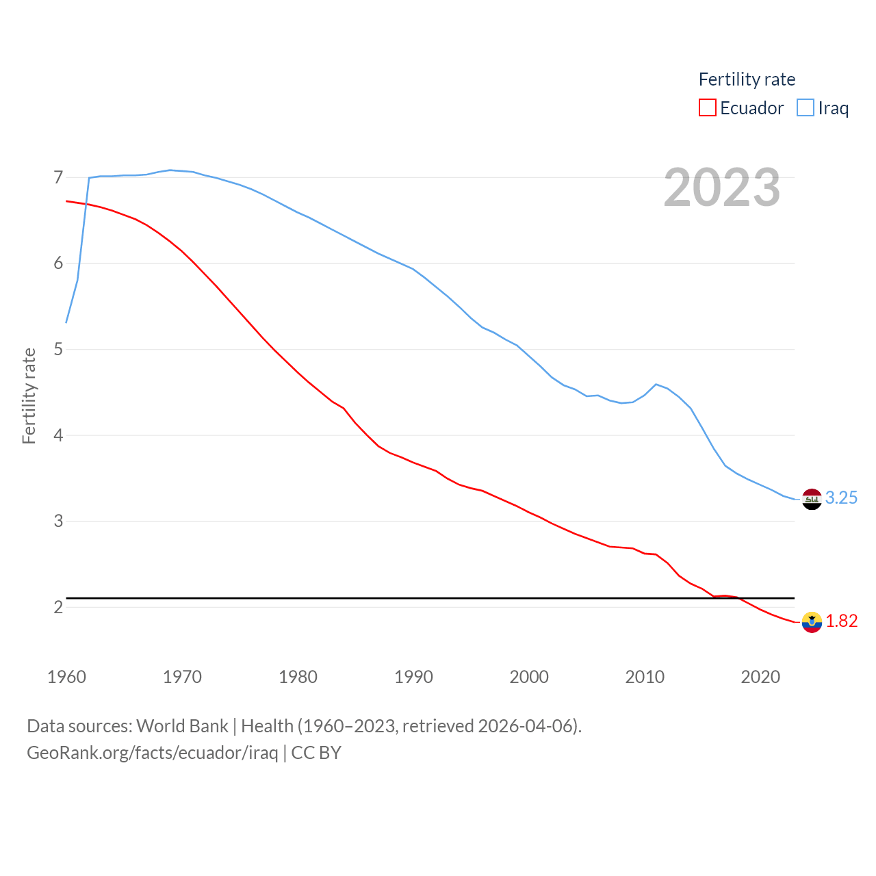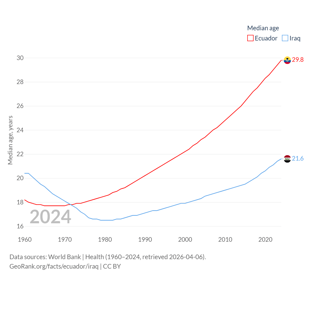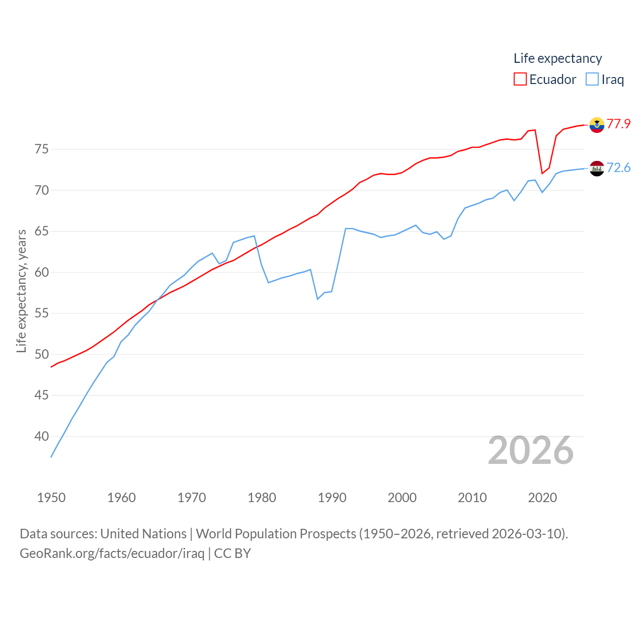 Ecuador has a population of 18.1M (ranked 71/197), compared with 46M in Iraq (ranked 34/197). Ecuador's land area is 95,892 sq mi versus 167,619 sq mi for Iraq (ranked 76th vs. 57th).