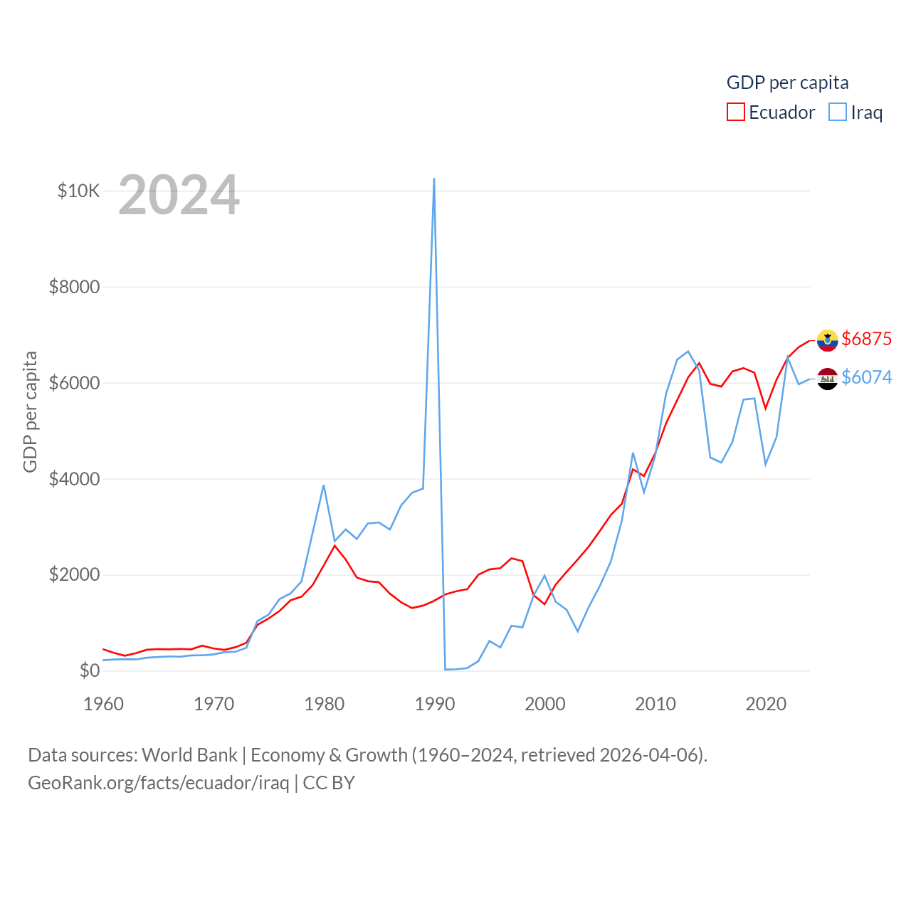 By GDP, Ecuador ranks 62/197 ($125B) and Iraq ranks 50/197 ($280B). By GDP per capita, Ecuador ranks 103/197 ($6,875), while Iraq ranks 113/197 ($6,074).
