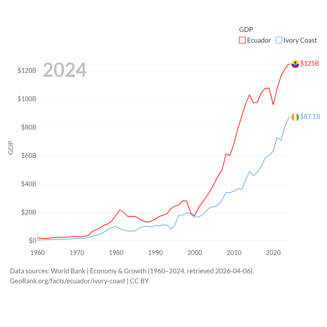 By GDP, Ecuador ranks 62/197 ($125B) and Ivory Coast ranks 77/197 ($87.1B). By GDP per capita, Ecuador ranks 103/197 ($6,875), while Ivory Coast ranks 142/197 ($2,728).