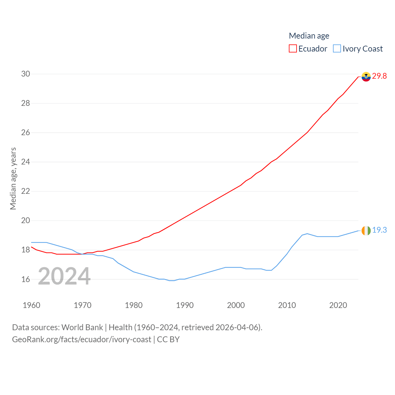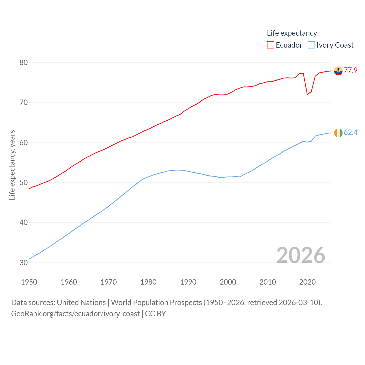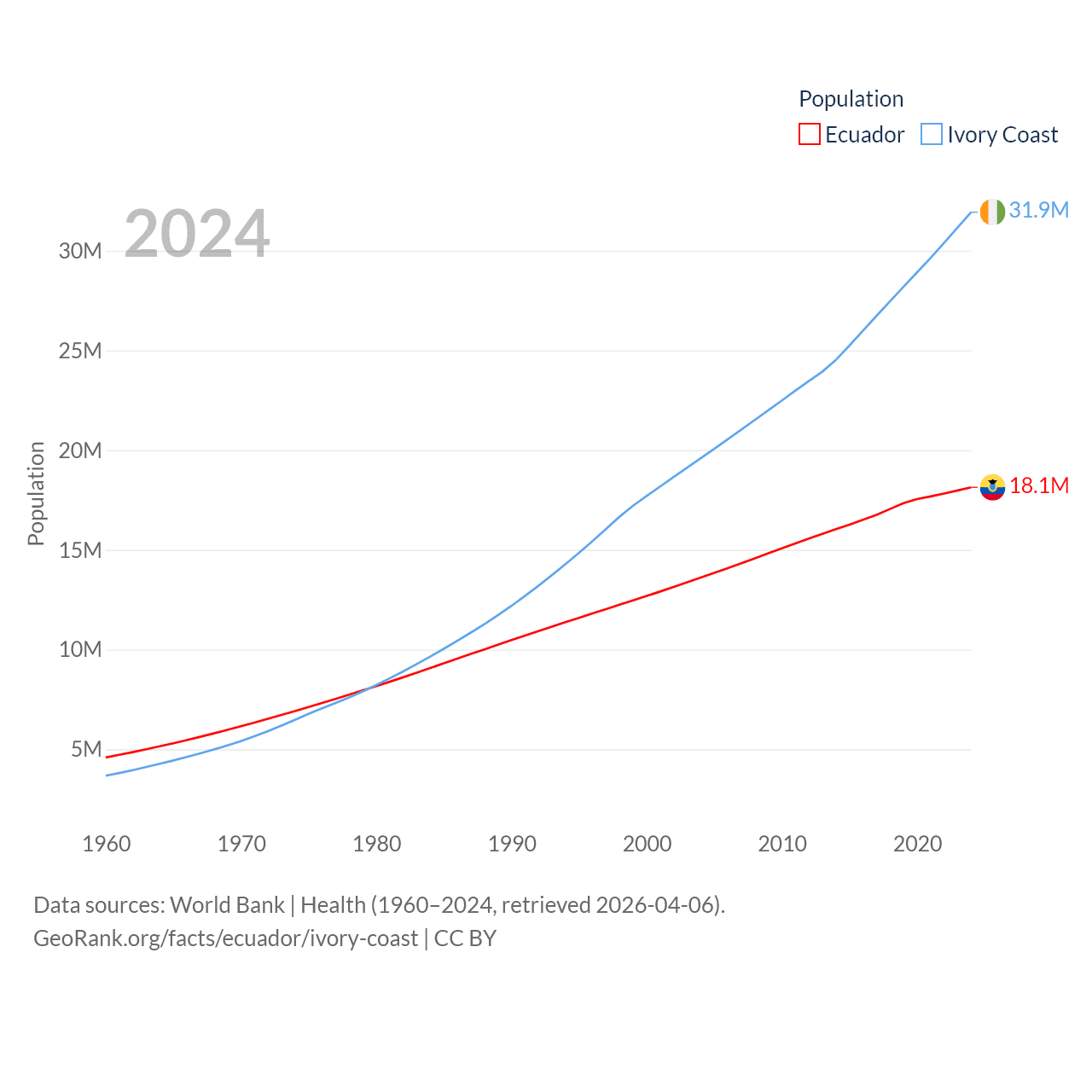 Ecuador has a population of 18.1M (ranked 71/197), compared with 31.9M in Ivory Coast (ranked 50/197). Ecuador's land area is 95,892 sq mi versus 122,780 sq mi for Ivory Coast (ranked 76th vs. 66th).