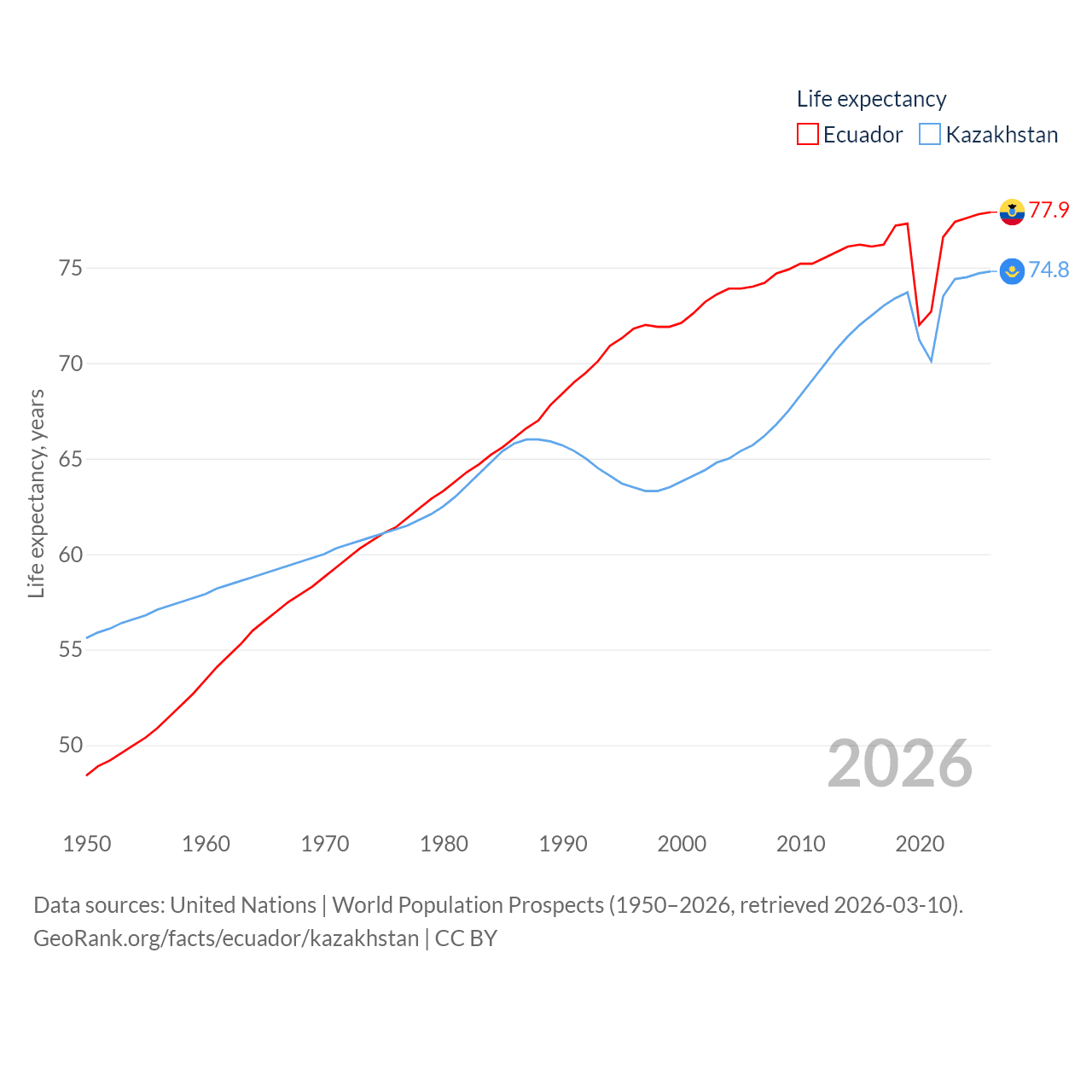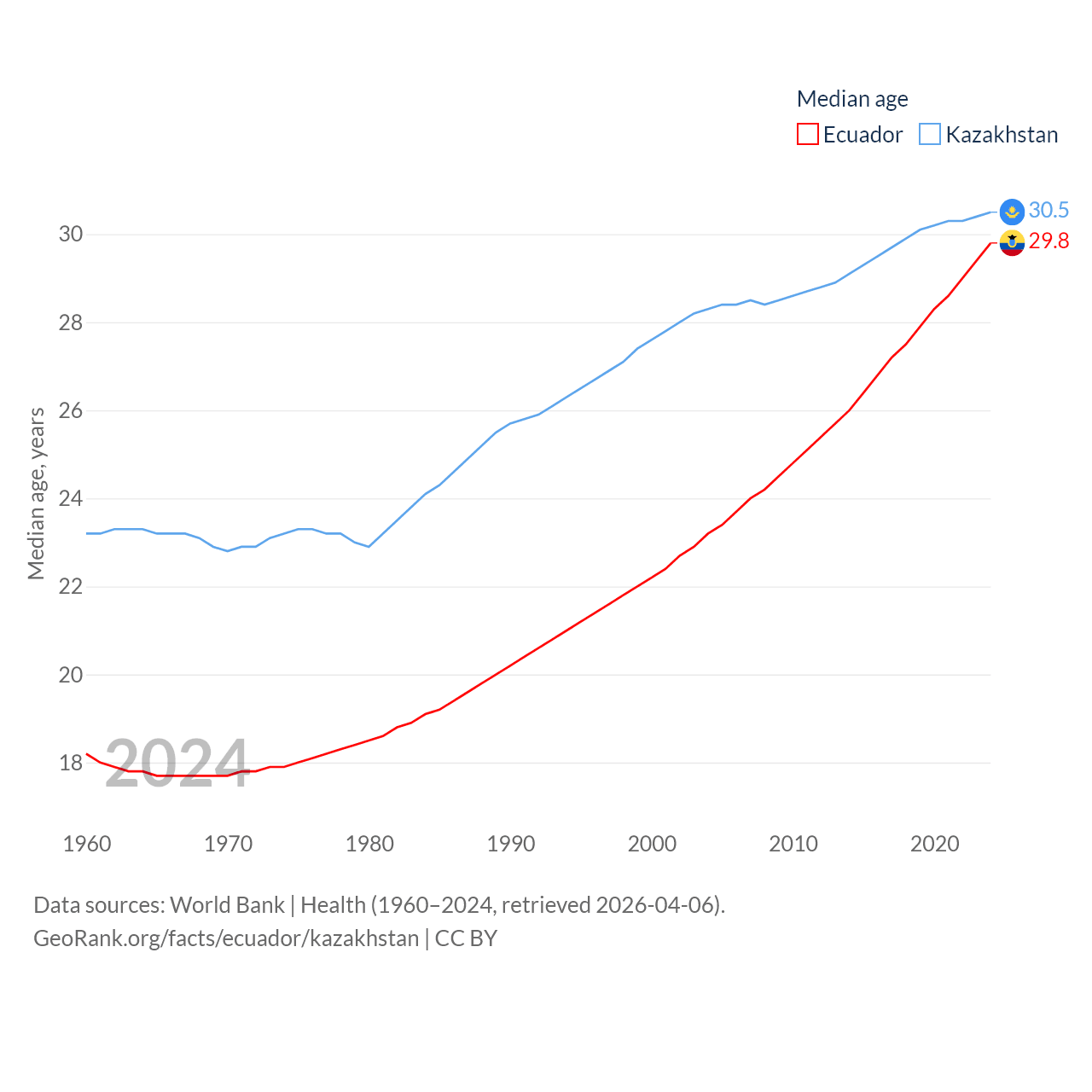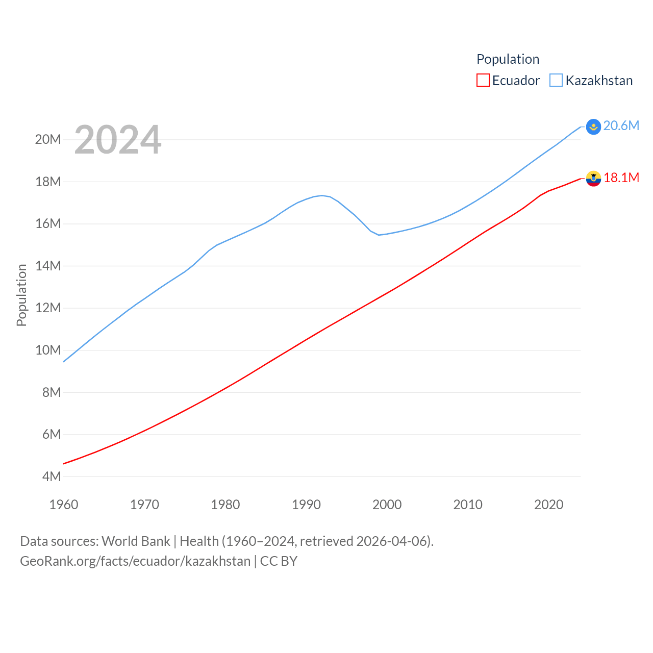 Ecuador has a population of 18.1M (ranked 71/197), compared with 20.6M in Kazakhstan (ranked 64/197). Ecuador's land area is 95,892 sq mi versus 1,042,360 sq mi for Kazakhstan (ranked 76th vs. 9th).