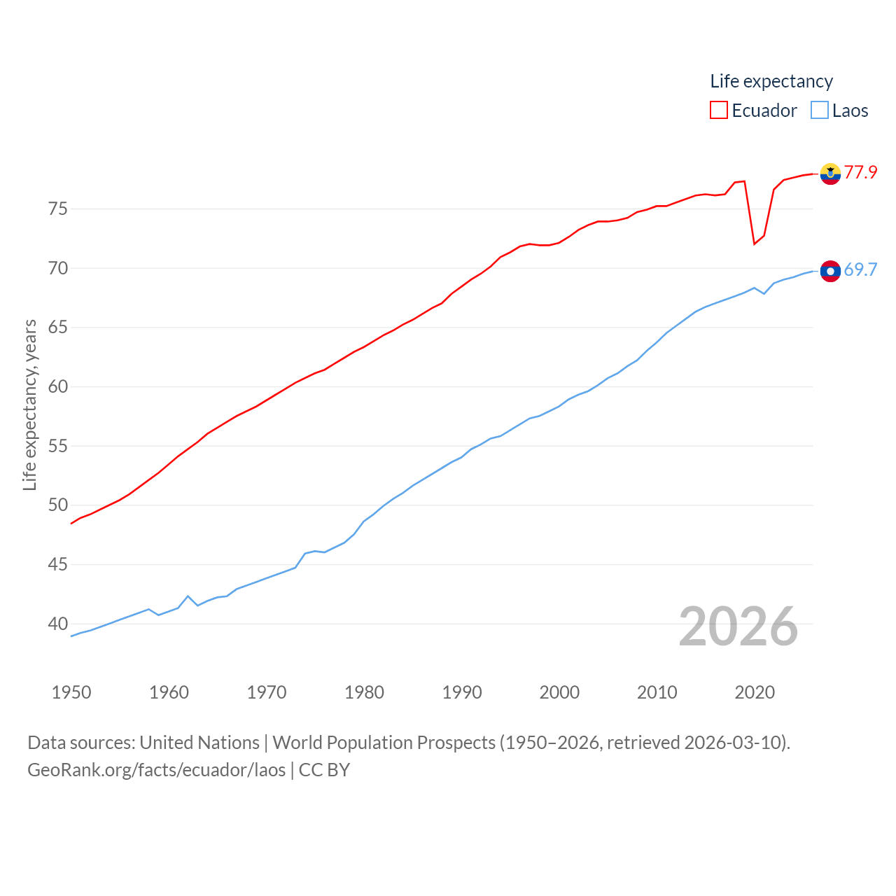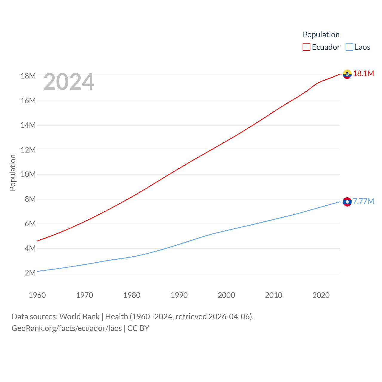 Ecuador has a population of 18.1M (ranked 71/197), compared with 7.77M in Laos (ranked 103/197). Ecuador's land area is 95,892 sq mi versus 89,112 sq mi for Laos (ranked 76th vs. 79th).