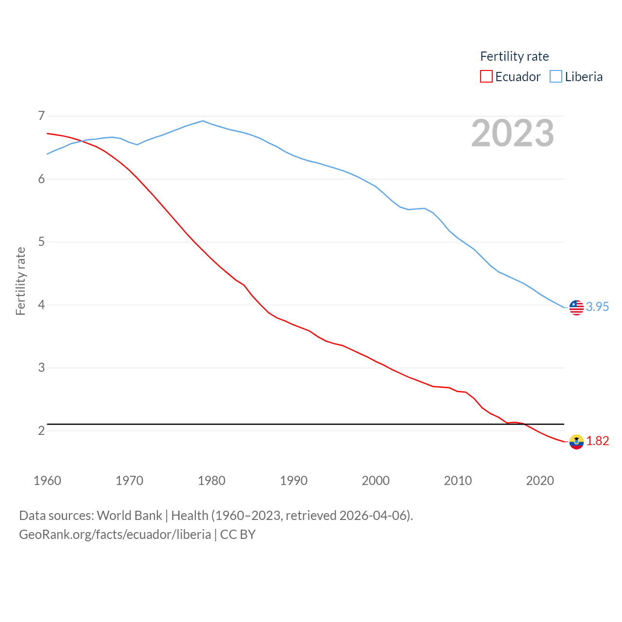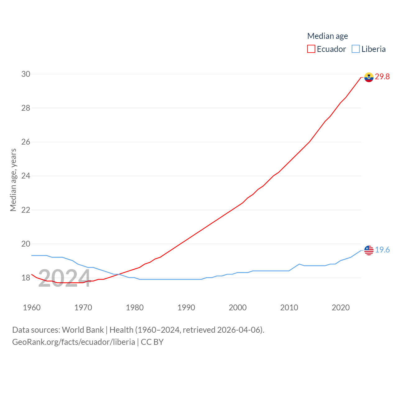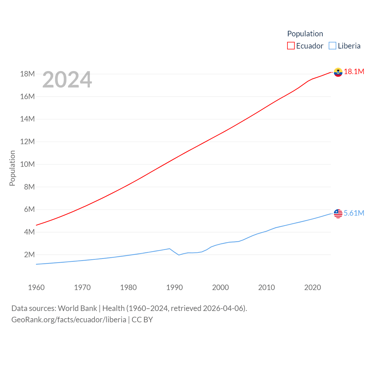 Ecuador has a population of 18.1M (ranked 71/197), compared with 5.61M in Liberia (ranked 117/197). Ecuador's land area is 95,892 sq mi versus 37,189 sq mi for Liberia (ranked 76th vs. 106th).