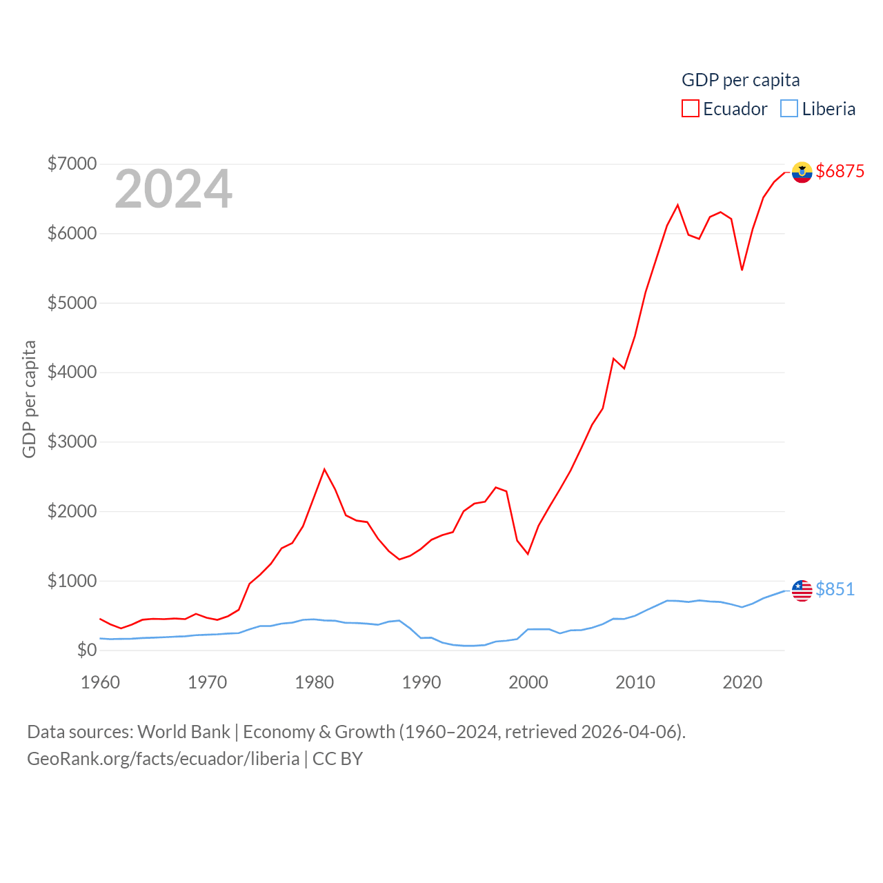 By GDP, Ecuador ranks 62/197 ($125B) and Liberia ranks 163/197 ($4.78B). By GDP per capita, Ecuador ranks 103/197 ($6,875), while Liberia ranks 184/197 ($851).