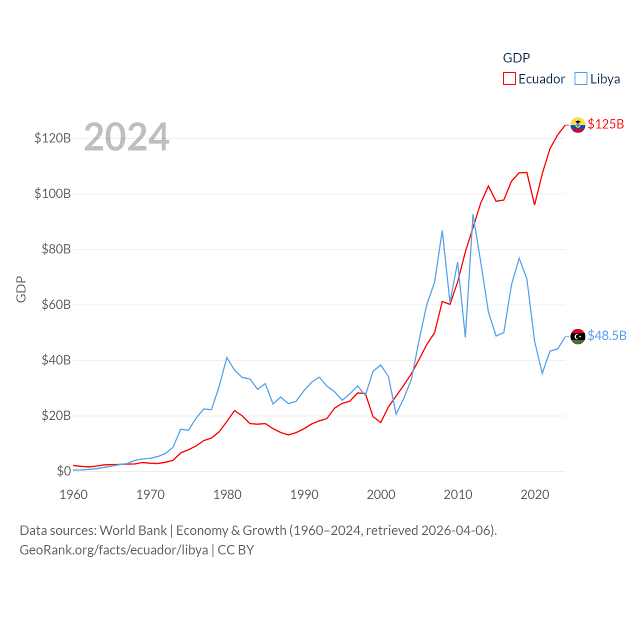 By GDP, Ecuador ranks 62/197 ($125B) and Libya ranks 95/197 ($48.5B). By GDP per capita, Ecuador ranks 103/197 ($6,875), while Libya ranks 107/197 ($6,569).