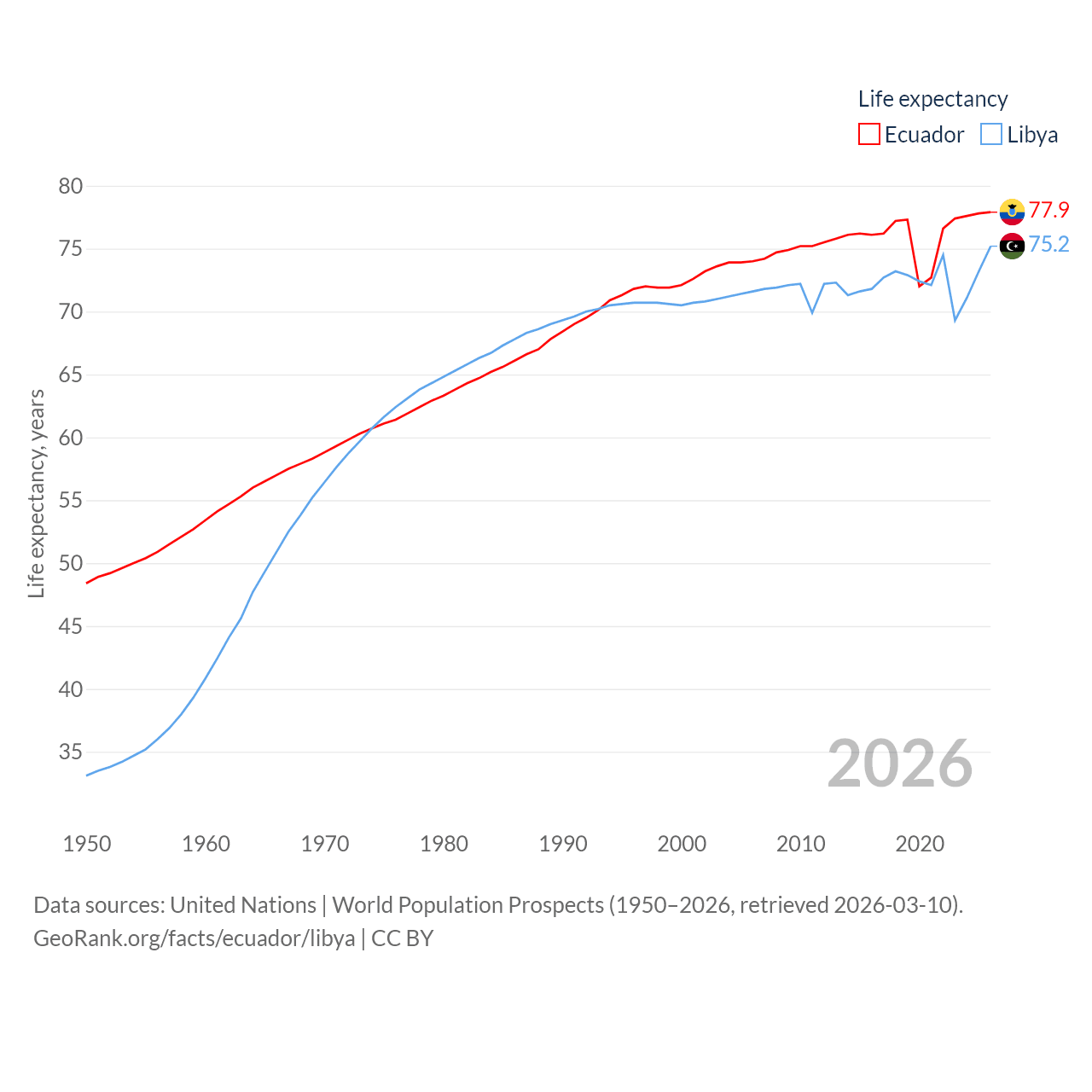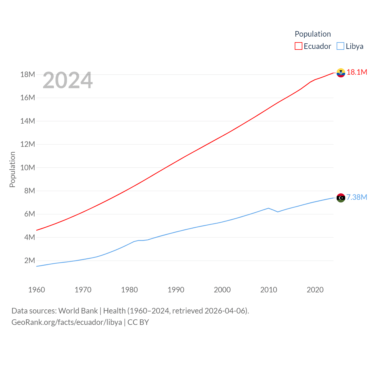 Ecuador has a population of 18.1M (ranked 71/197), compared with 7.38M in Libya (ranked 105/197). Ecuador's land area is 95,892 sq mi versus 679,362 sq mi for Libya (ranked 76th vs. 16th).