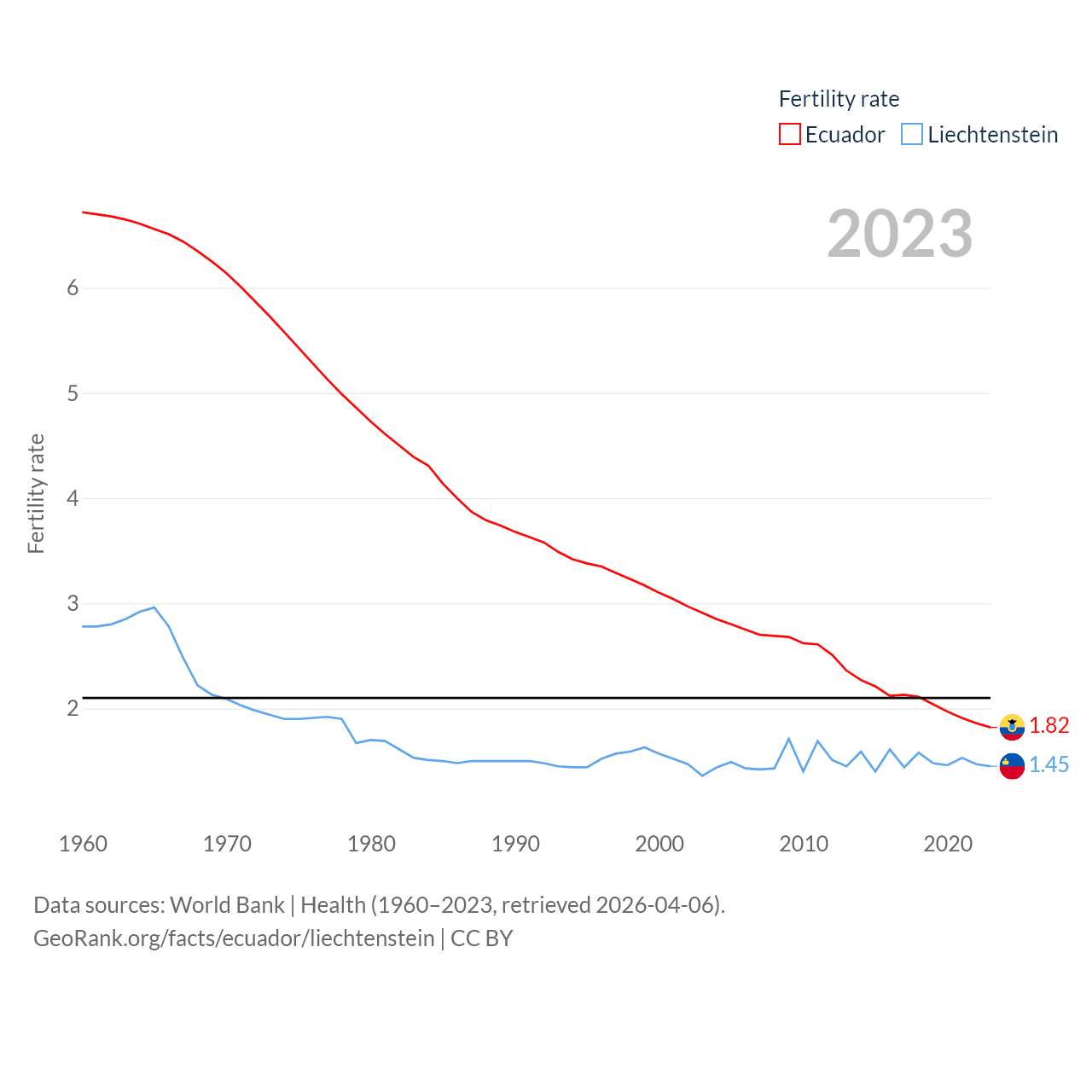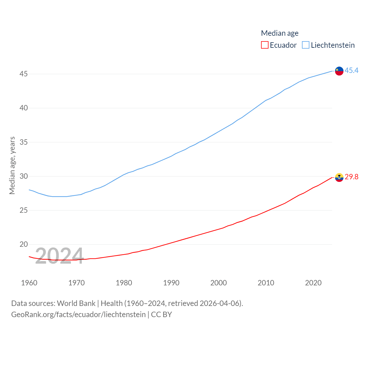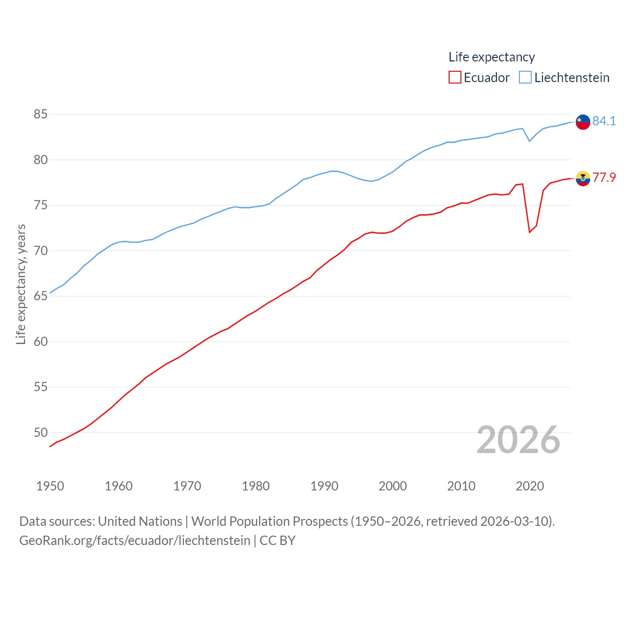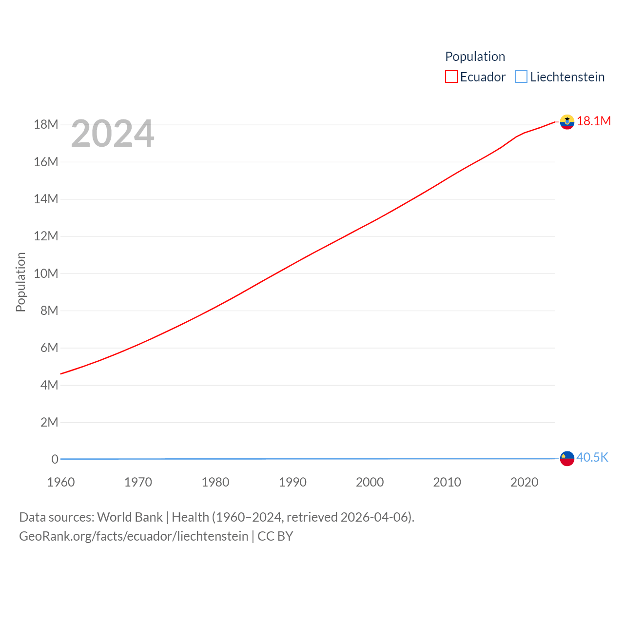 Ecuador has a population of 18.1M (ranked 71/197), compared with 40.4K in Liechtenstein (ranked 190/197). Ecuador's land area is 95,892 sq mi versus 61.8 sq mi for Liechtenstein (ranked 76th vs. 192nd).