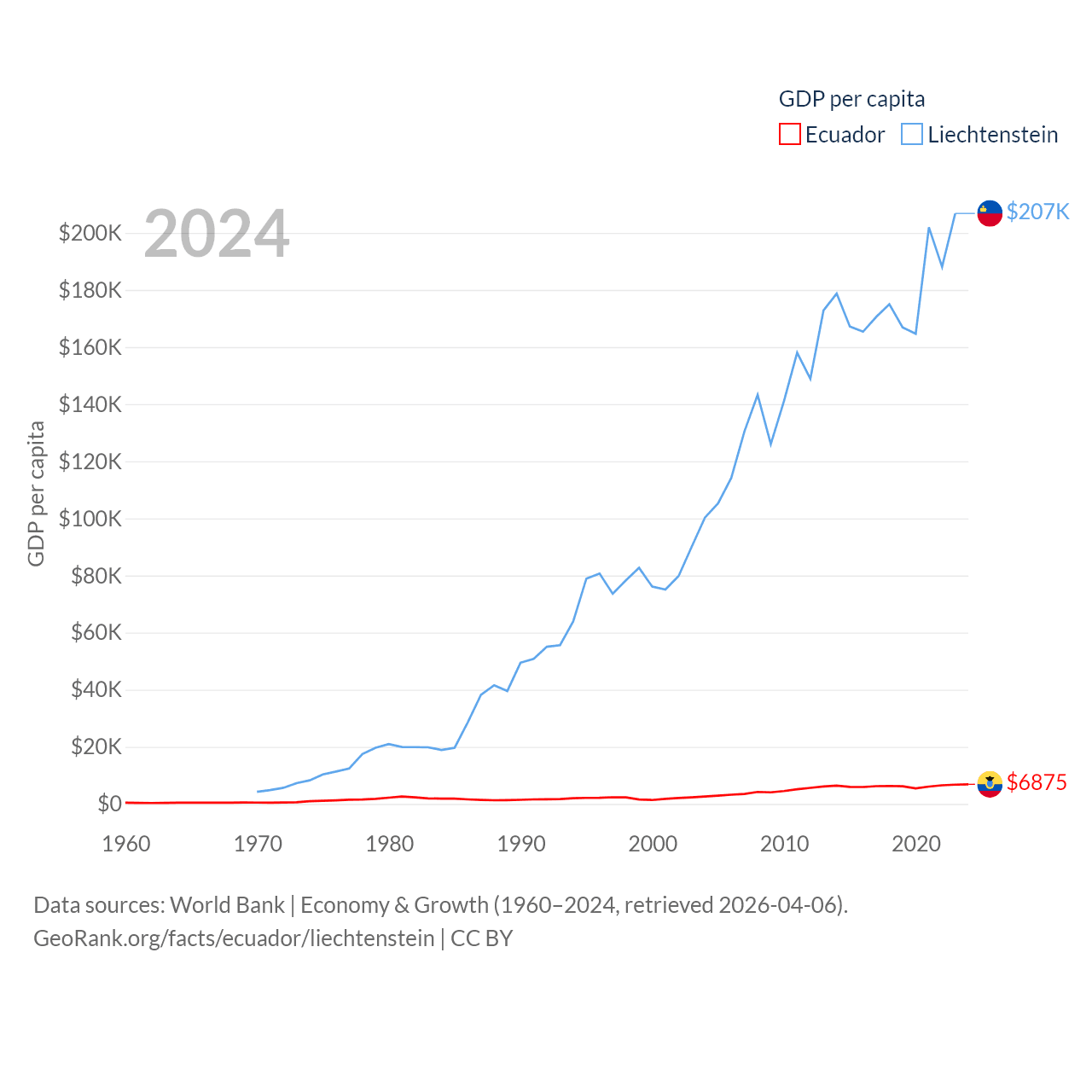 By GDP, Ecuador ranks 62/197 ($125B) and Liechtenstein ranks 156/197 ($8.24B). By GDP per capita, Ecuador ranks 103/197 ($6,875), while Liechtenstein ranks 2/197 ($206,781).
