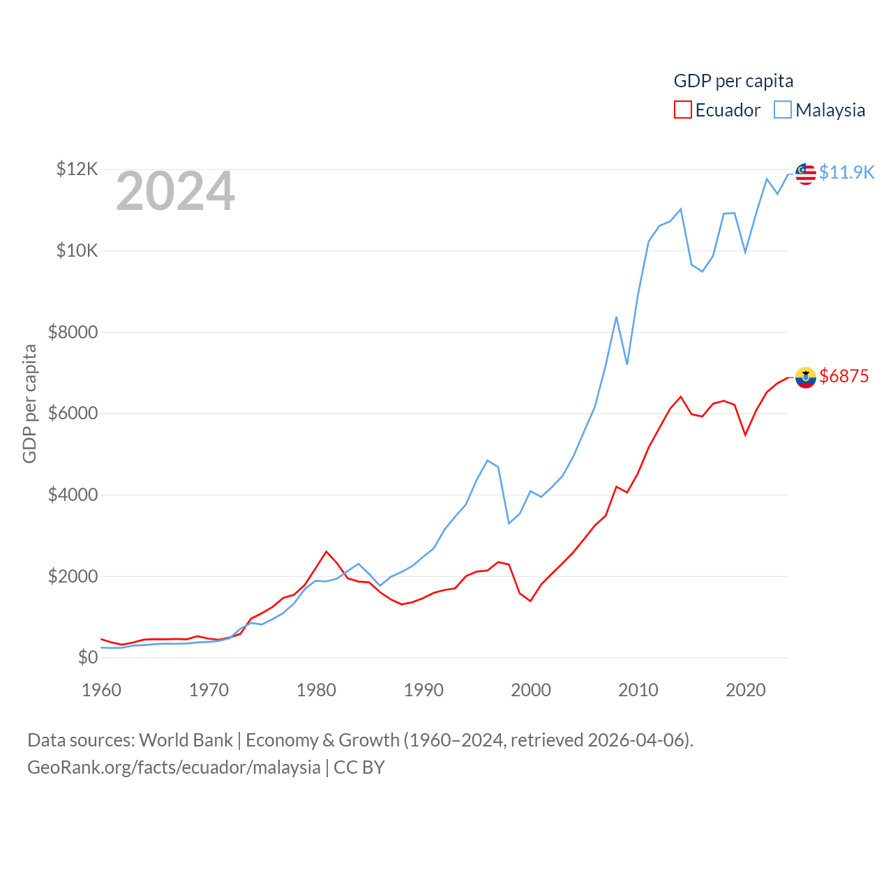 By GDP, Ecuador ranks 62/197 ($125B) and Malaysia ranks 38/197 ($422B). By GDP per capita, Ecuador ranks 103/197 ($6,875), while Malaysia ranks 79/197 ($11,874).