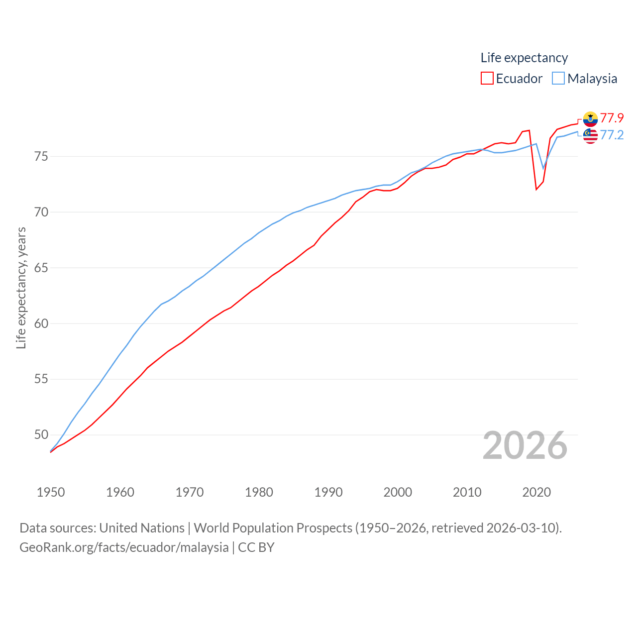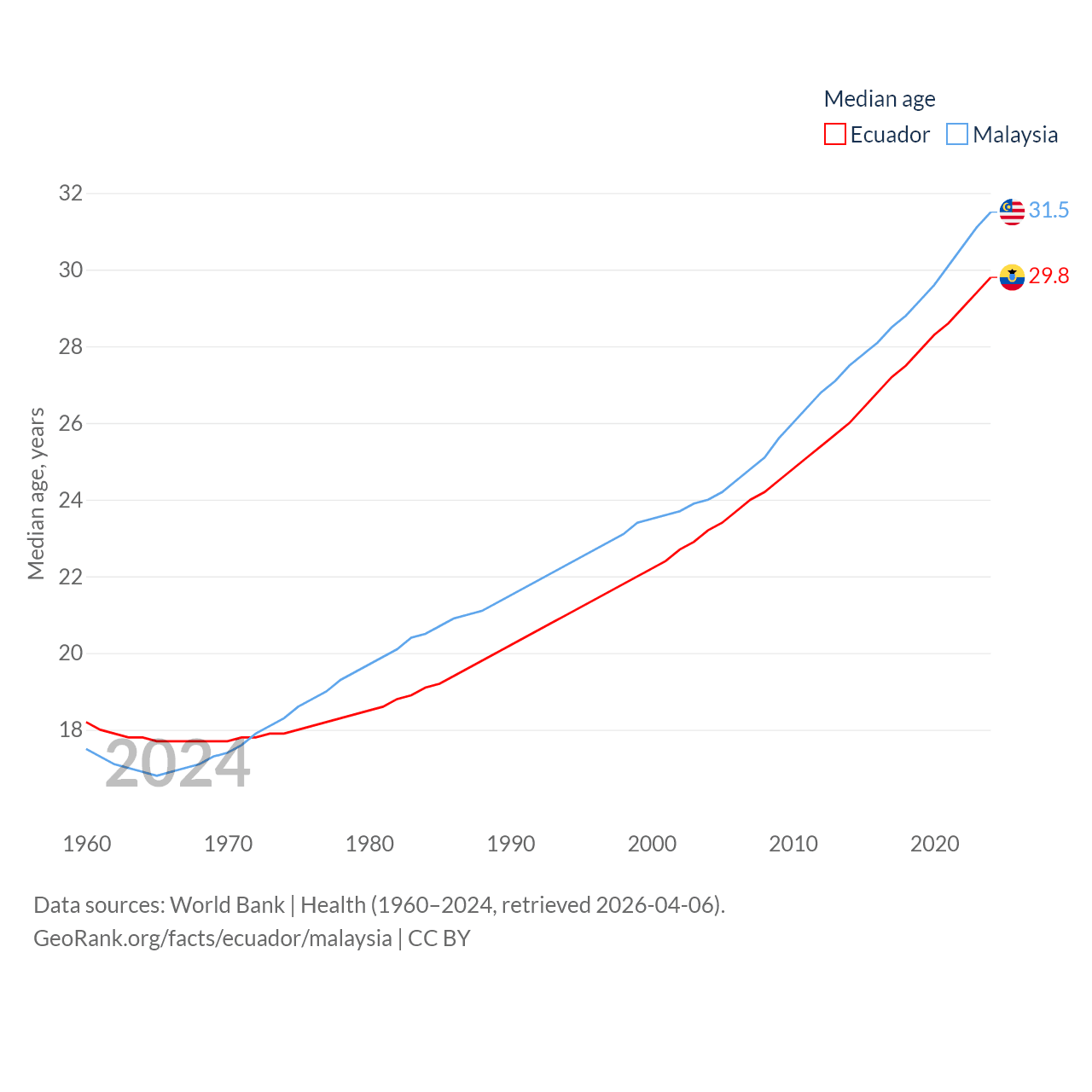 Ecuador has a population of 18.1M (ranked 71/197), compared with 35.6M in Malaysia (ranked 44/197). Ecuador's land area is 95,892 sq mi versus 126,854 sq mi for Malaysia (ranked 76th vs. 65th).