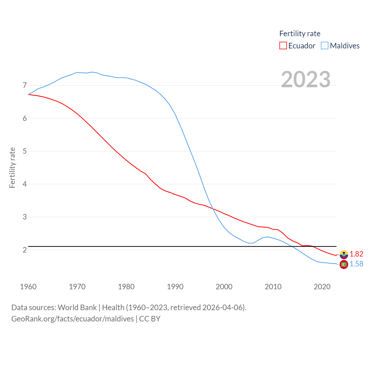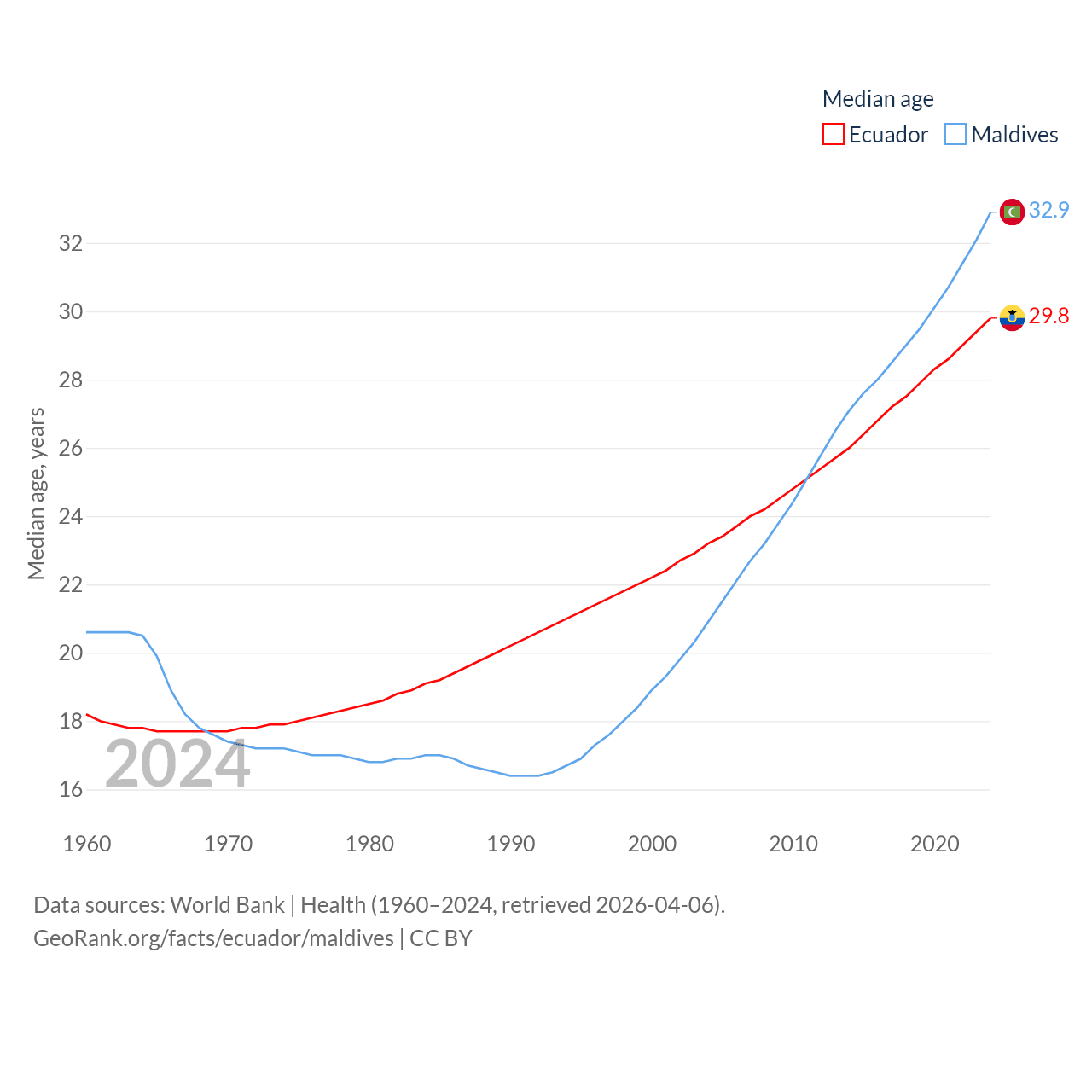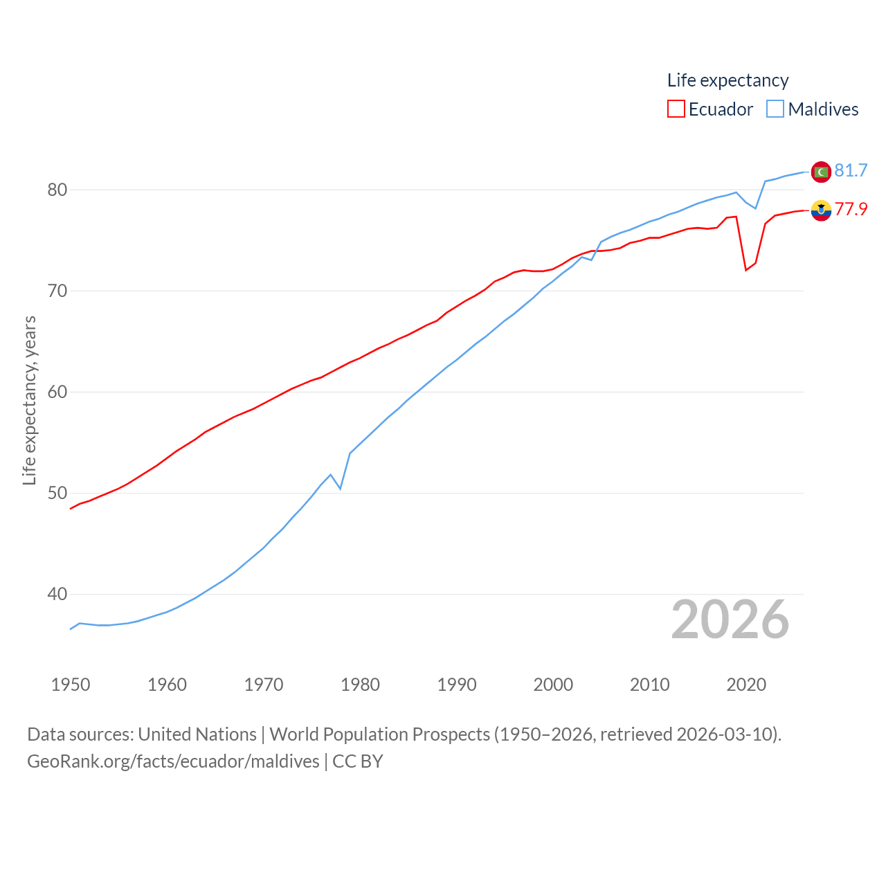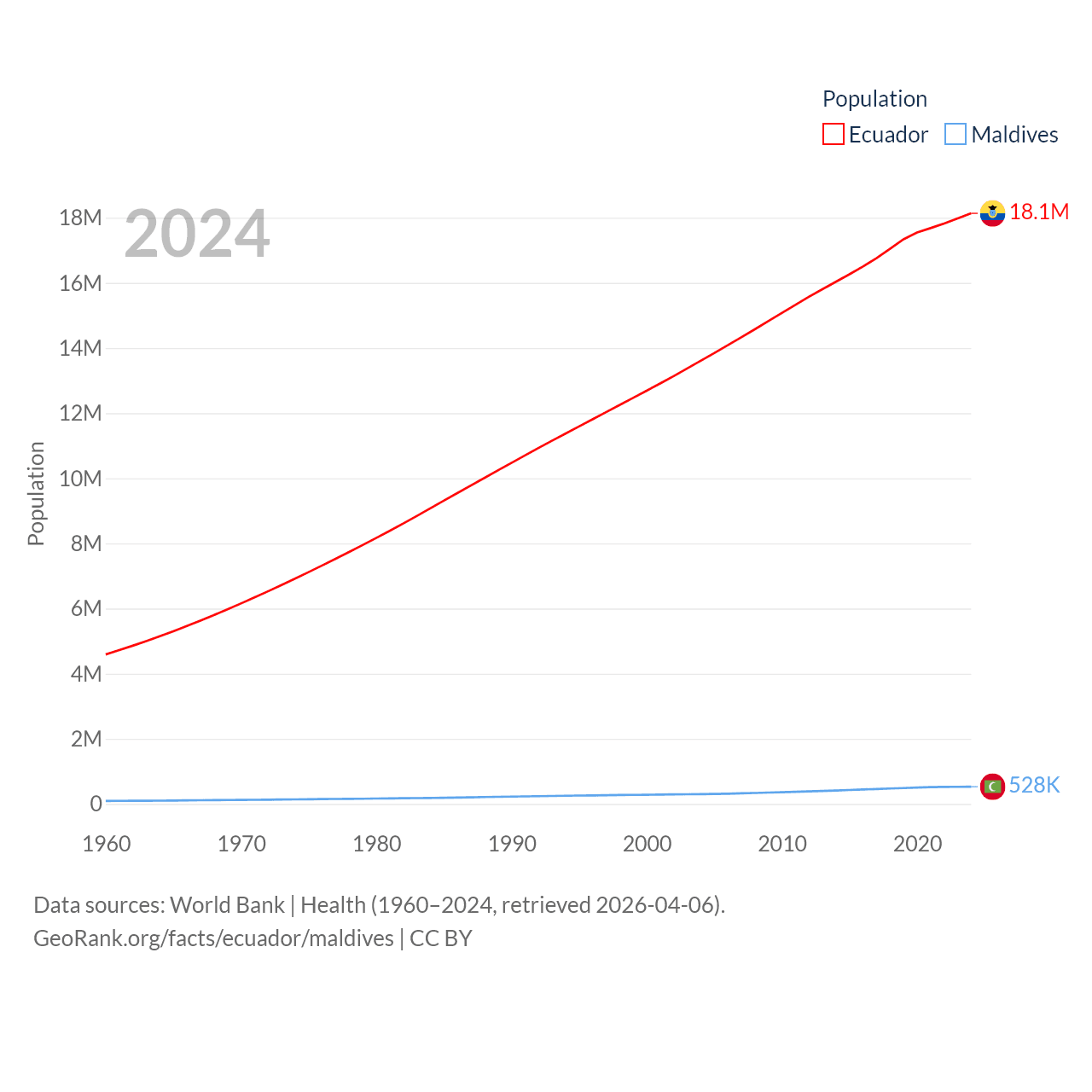 Ecuador has a population of 18.1M (ranked 71/197), compared with 528K in Maldives (ranked 168/197). Ecuador's land area is 95,892 sq mi versus 115.1 sq mi for Maldives (ranked 76th vs. 188th).