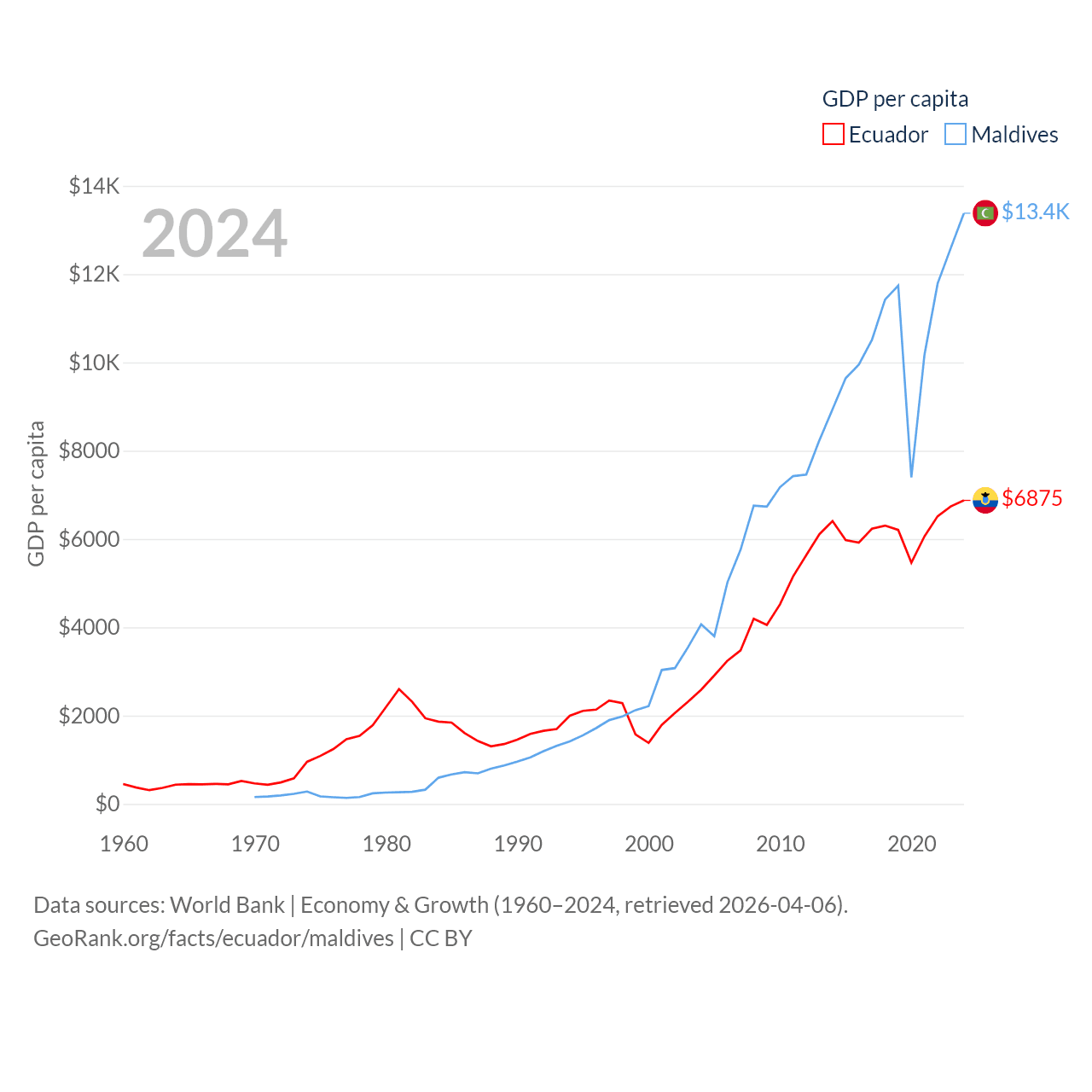 By GDP, Ecuador ranks 62/197 ($125B) and Maldives ranks 159/197 ($7.06B). By GDP per capita, Ecuador ranks 103/197 ($6,875), while Maldives ranks 75/197 ($13,379).