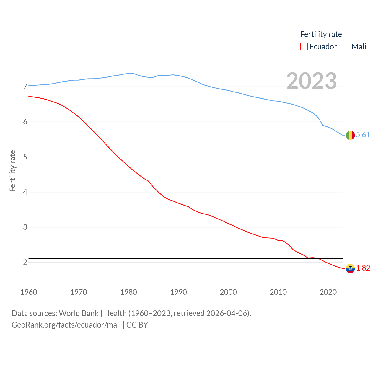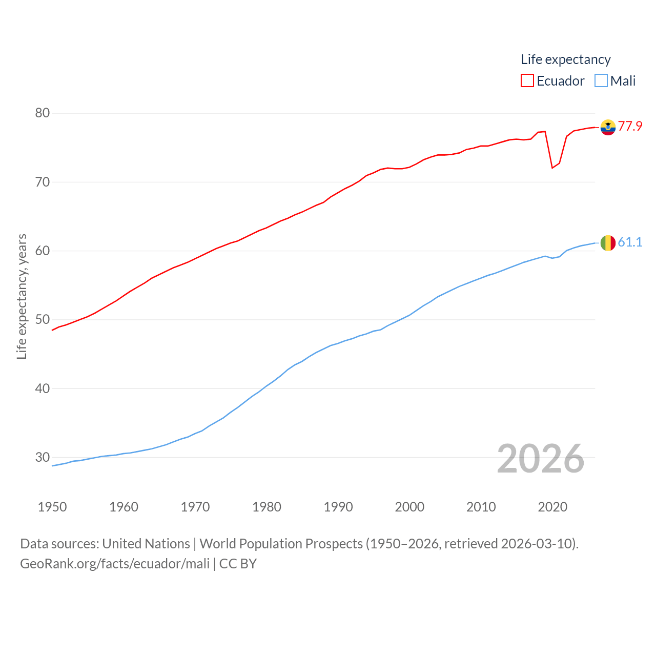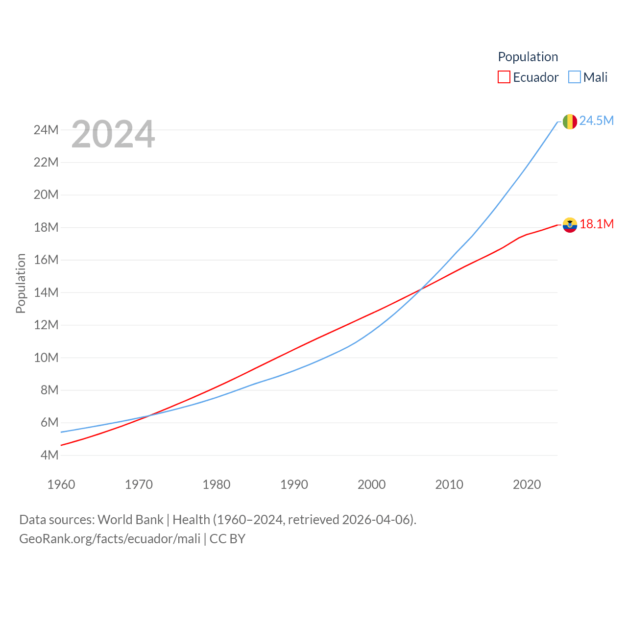 Ecuador has a population of 18.1M (ranked 71/197), compared with 24.5M in Mali (ranked 58/197). Ecuador's land area is 95,892 sq mi versus 471,118 sq mi for Mali (ranked 76th vs. 23rd).