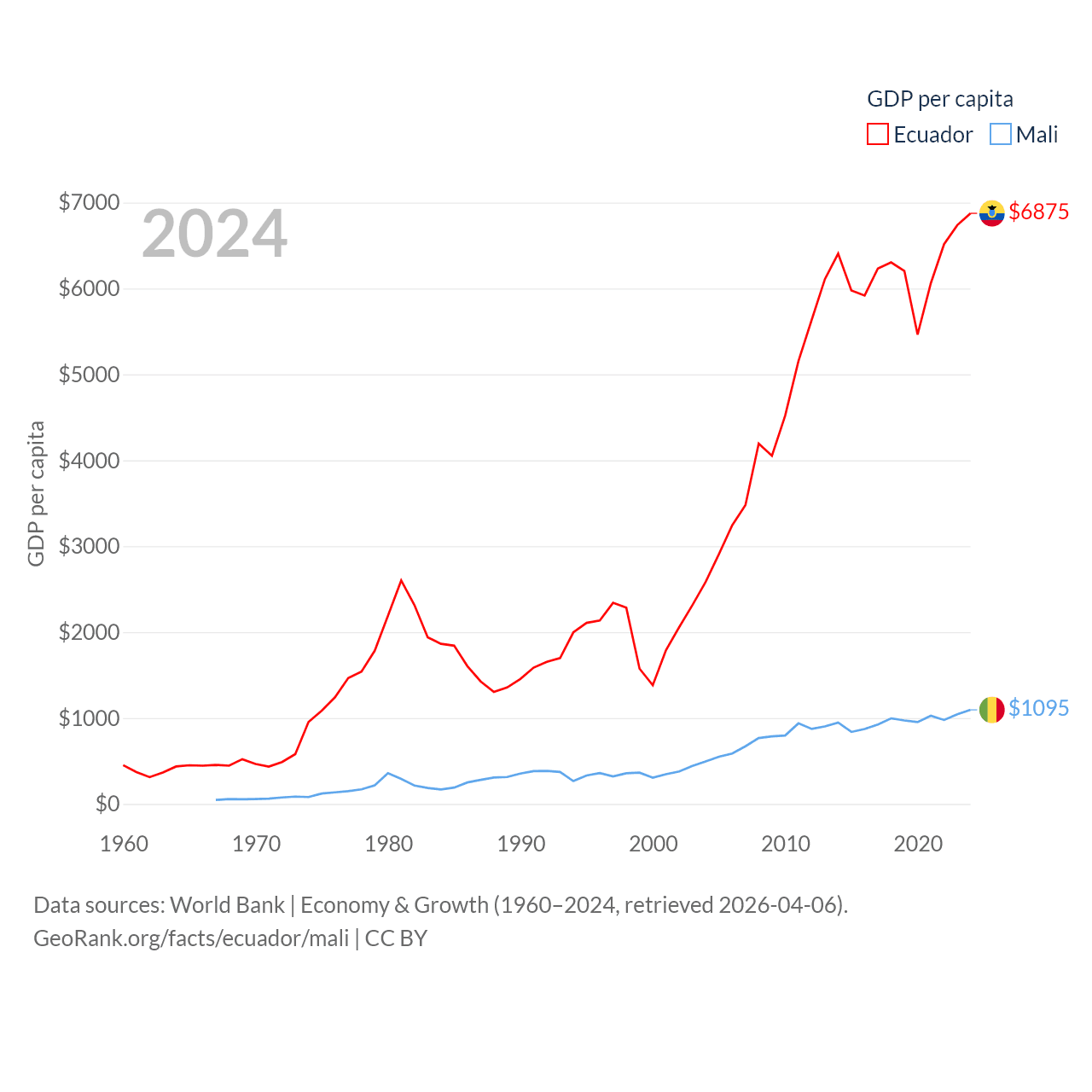 By GDP, Ecuador ranks 62/197 ($125B) and Mali ranks 113/197 ($26.8B). By GDP per capita, Ecuador ranks 103/197 ($6,875), while Mali ranks 173/197 ($1,095).