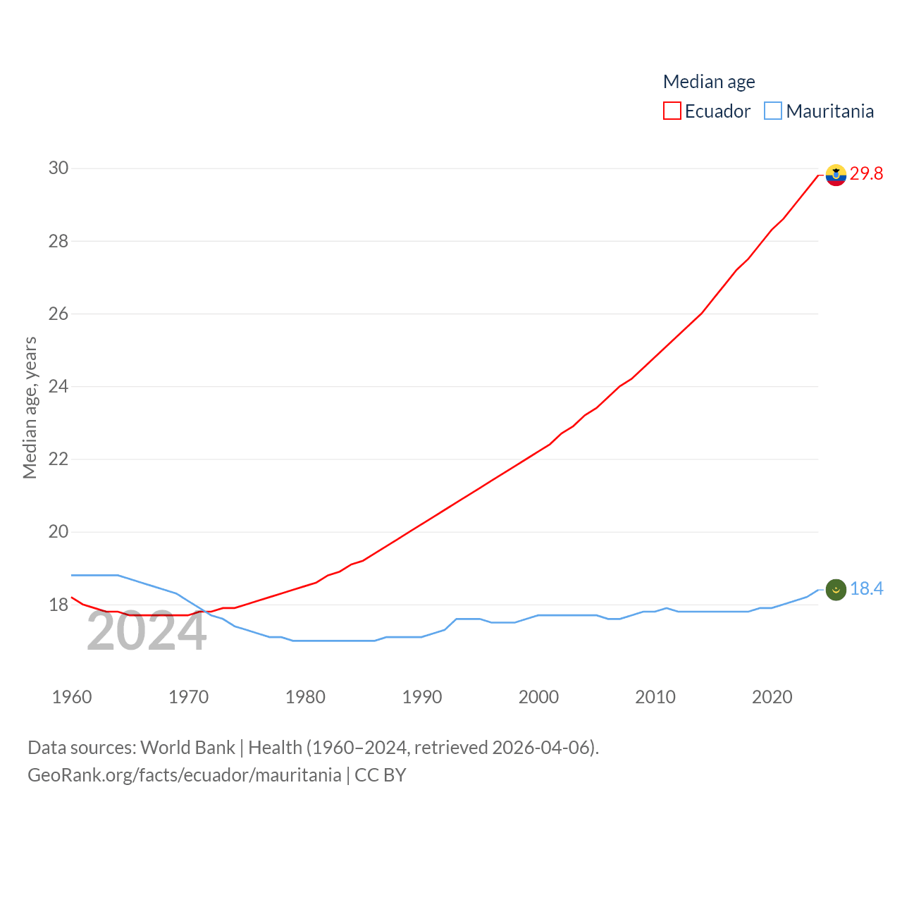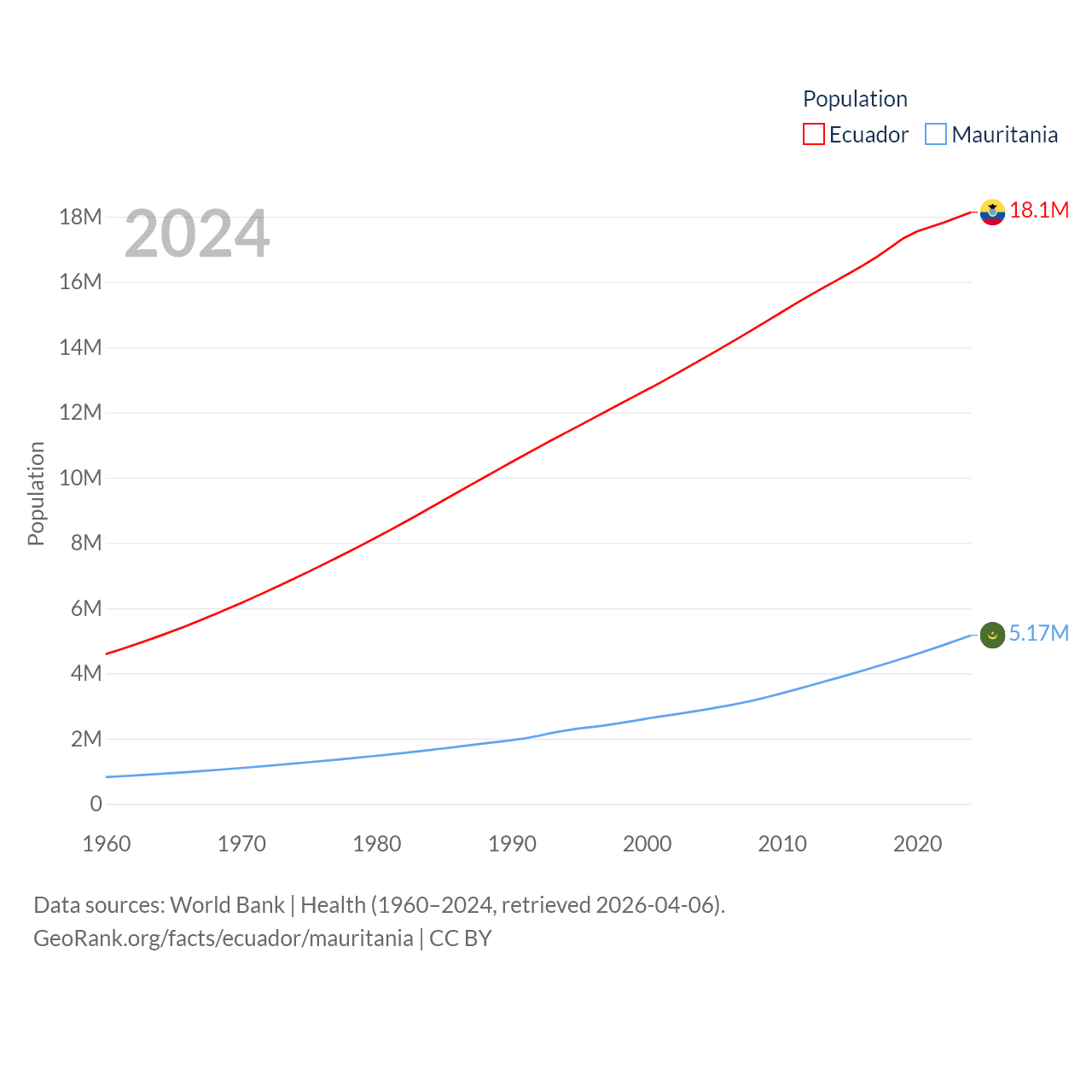 Ecuador has a population of 18.1M (ranked 71/197), compared with 5.17M in Mauritania (ranked 125/197). Ecuador's land area is 95,892 sq mi versus 397,955 sq mi for Mauritania (ranked 76th vs. 28th).