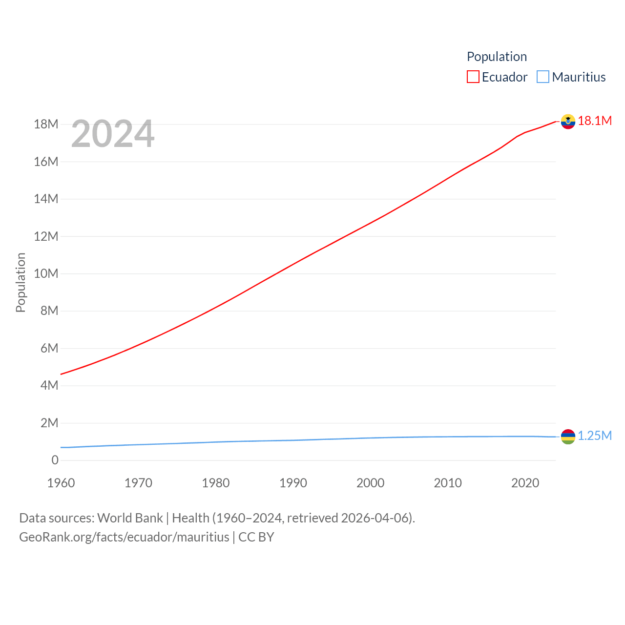 Ecuador has a population of 18.1M (ranked 71/197), compared with 1.25M in Mauritius (ranked 156/197). Ecuador's land area is 95,892 sq mi versus 771 sq mi for Mauritius (ranked 76th vs. 170th).