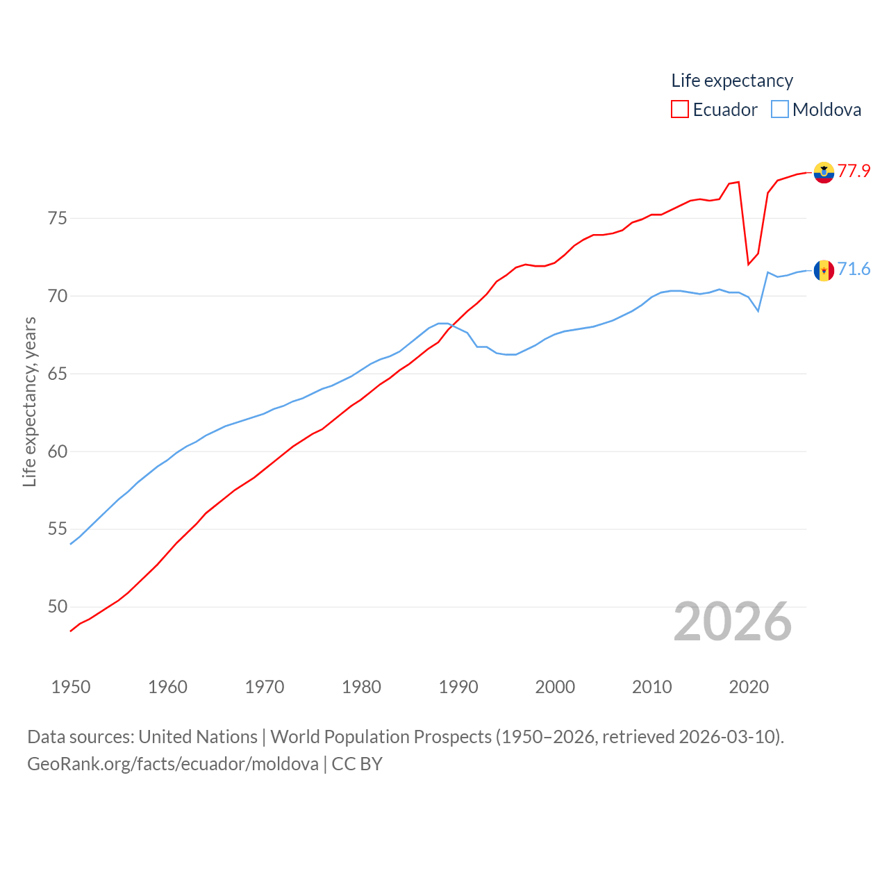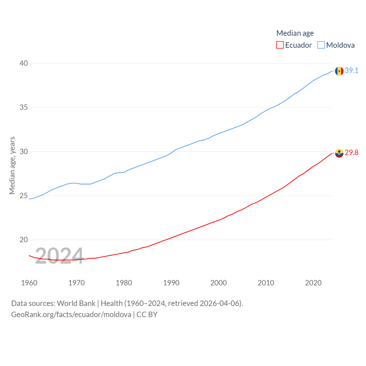 Ecuador has a population of 18.1M (ranked 71/197), compared with 2.4M in Moldova (ranked 143/197). Ecuador's land area is 95,892 sq mi versus 12,714 sq mi for Moldova (ranked 76th vs. 135th).