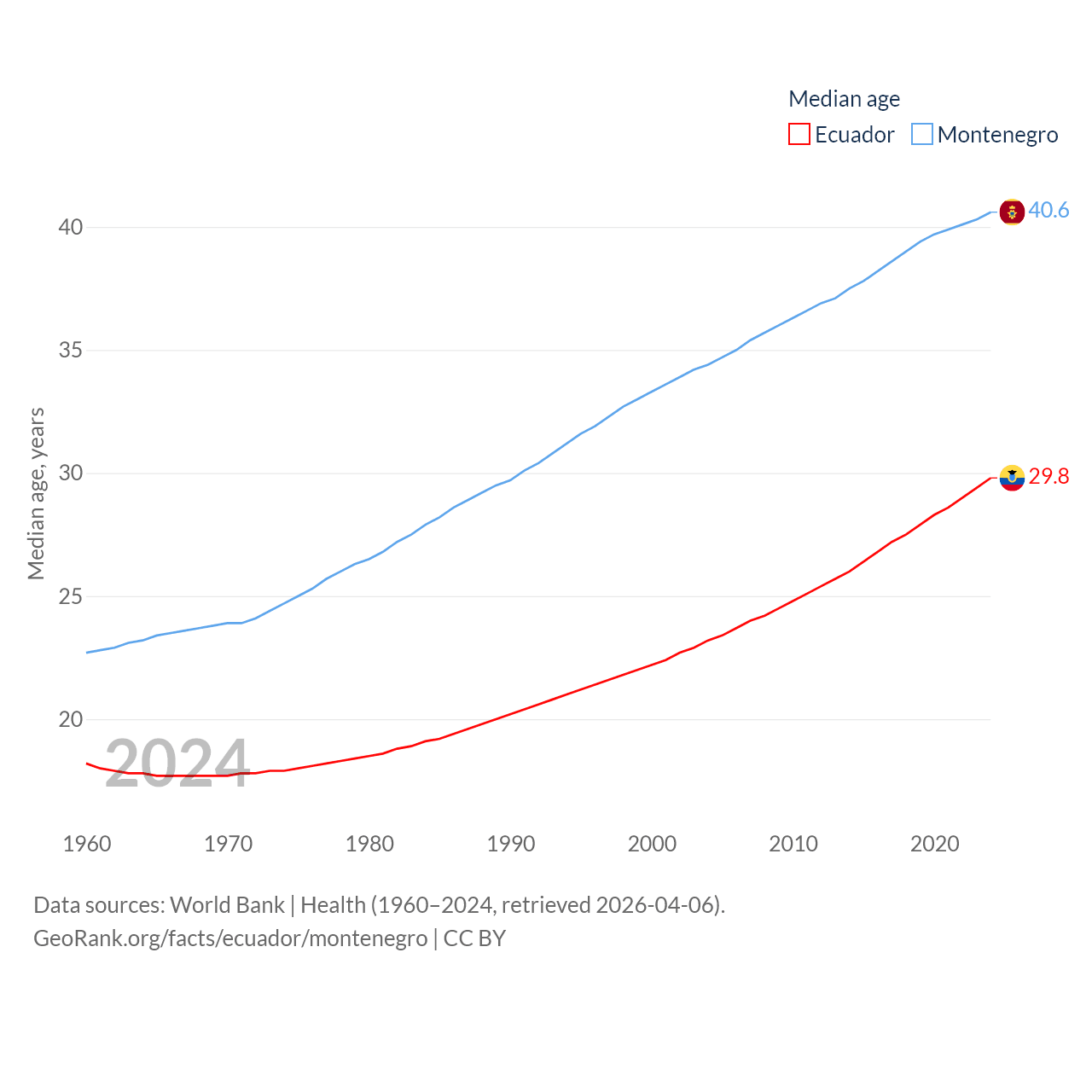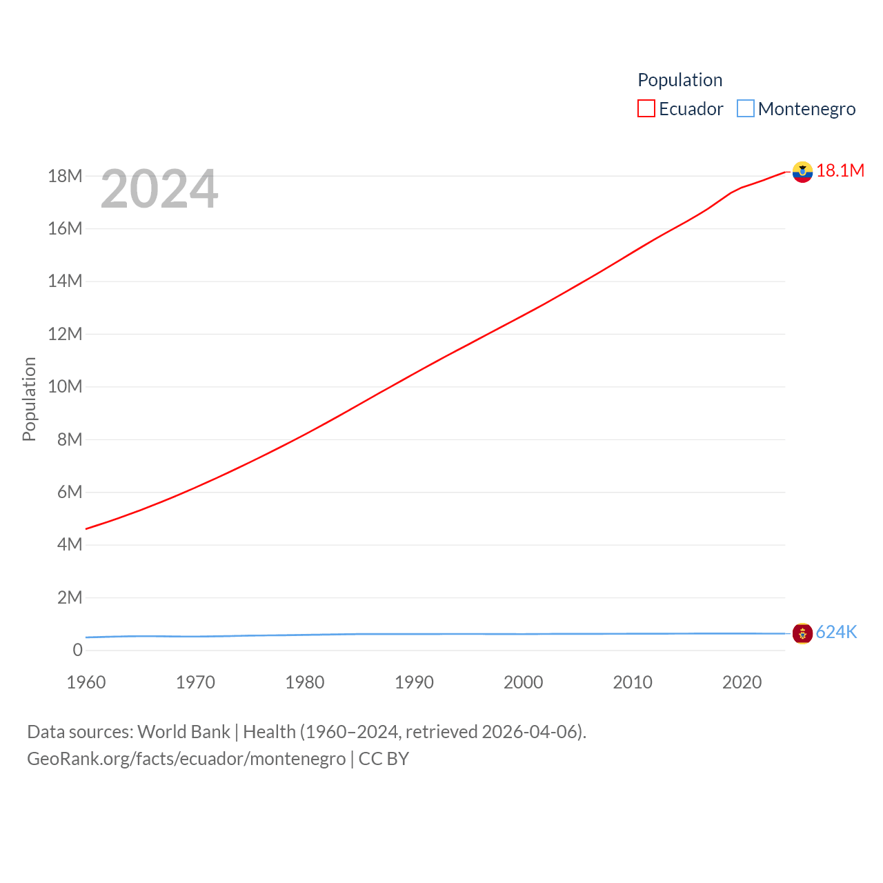 Ecuador has a population of 18.1M (ranked 71/197), compared with 624K in Montenegro (ranked 166/197). Ecuador's land area is 95,892 sq mi versus 5,193 sq mi for Montenegro (ranked 76th vs. 156th).