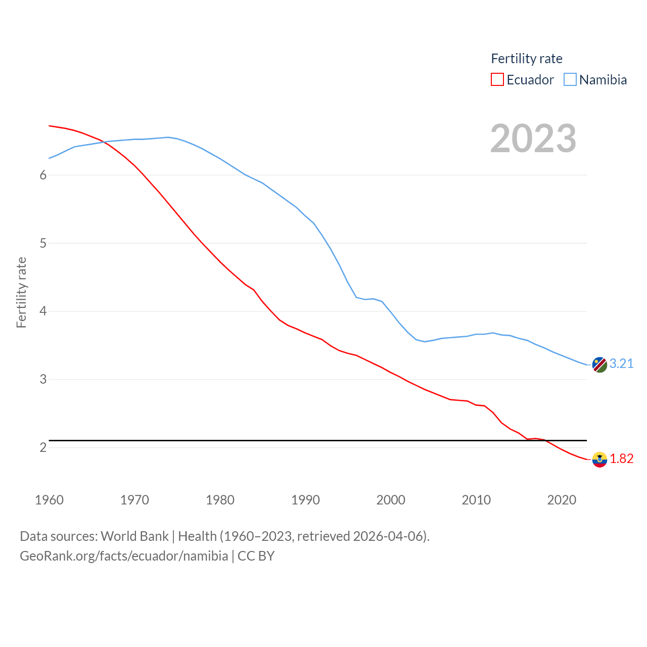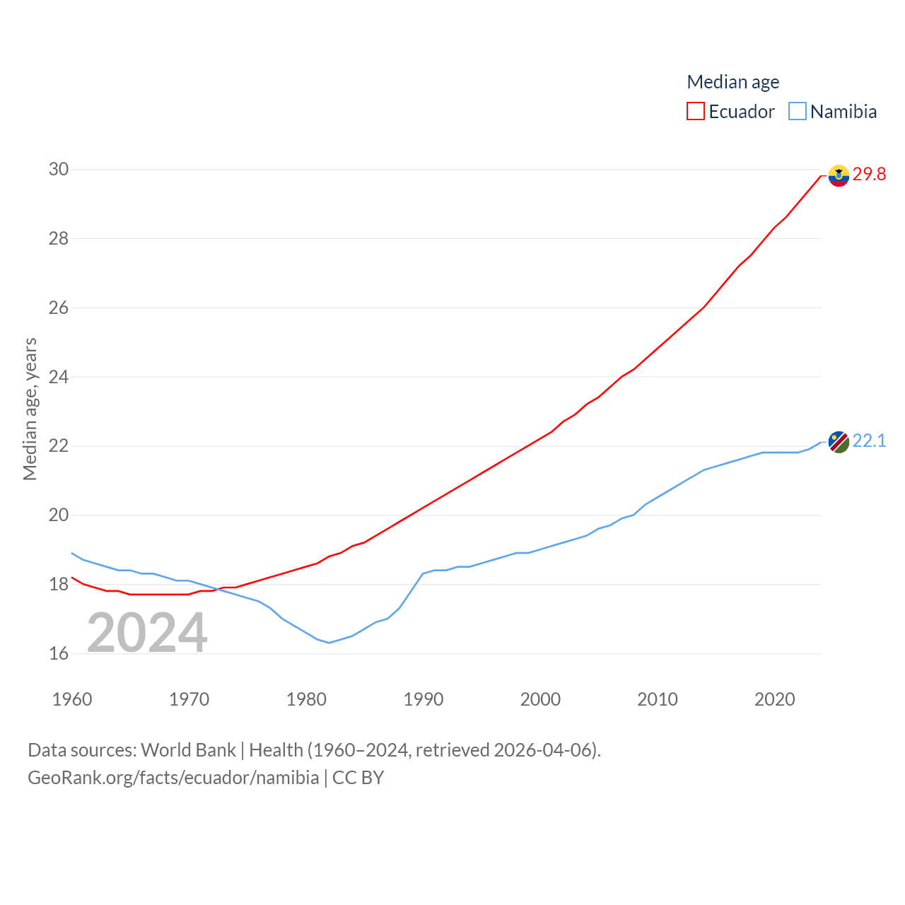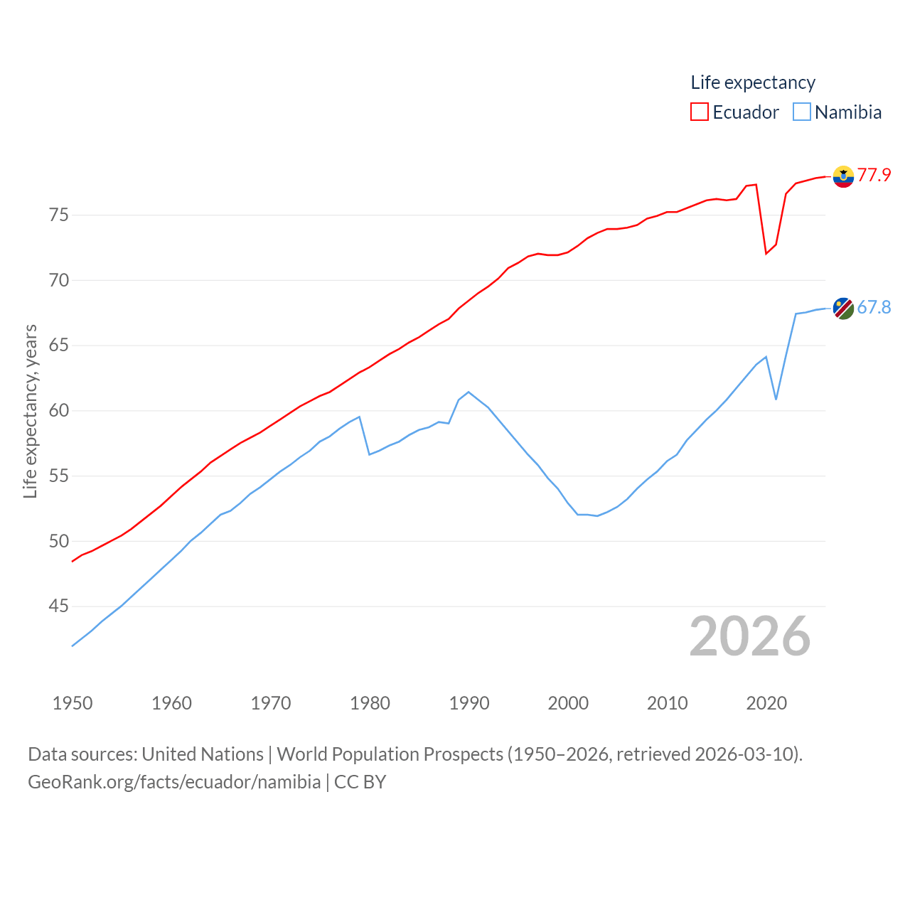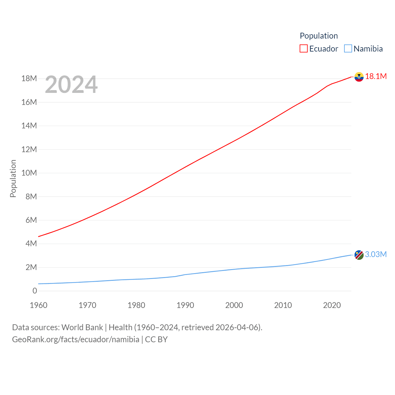 Ecuador has a population of 18.1M (ranked 71/197), compared with 3.03M in Namibia (ranked 136/197). Ecuador's land area is 95,892 sq mi versus 317,874 sq mi for Namibia (ranked 76th vs. 33rd).