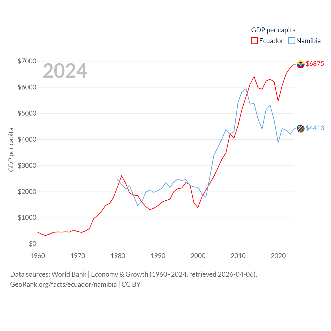 By GDP, Ecuador ranks 62/197 ($125B) and Namibia ranks 147/197 ($13.4B). By GDP per capita, Ecuador ranks 103/197 ($6,875), while Namibia ranks 126/197 ($4,413).