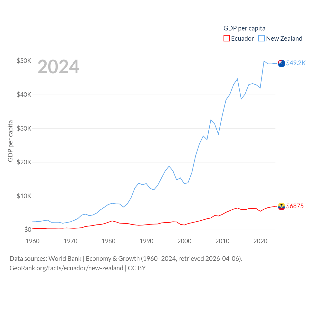 By GDP, Ecuador ranks 62/197 ($125B) and New Zealand ranks 52/197 ($260B). By GDP per capita, Ecuador ranks 103/197 ($6,875), while New Zealand ranks 26/197 ($49,205).