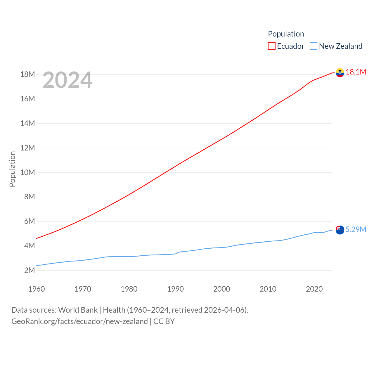 Ecuador has a population of 18.1M (ranked 71/197), compared with 5.29M in New Zealand (ranked 123/197). Ecuador's land area is 95,892 sq mi versus 101,665 sq mi for New Zealand (ranked 76th vs. 74th).
