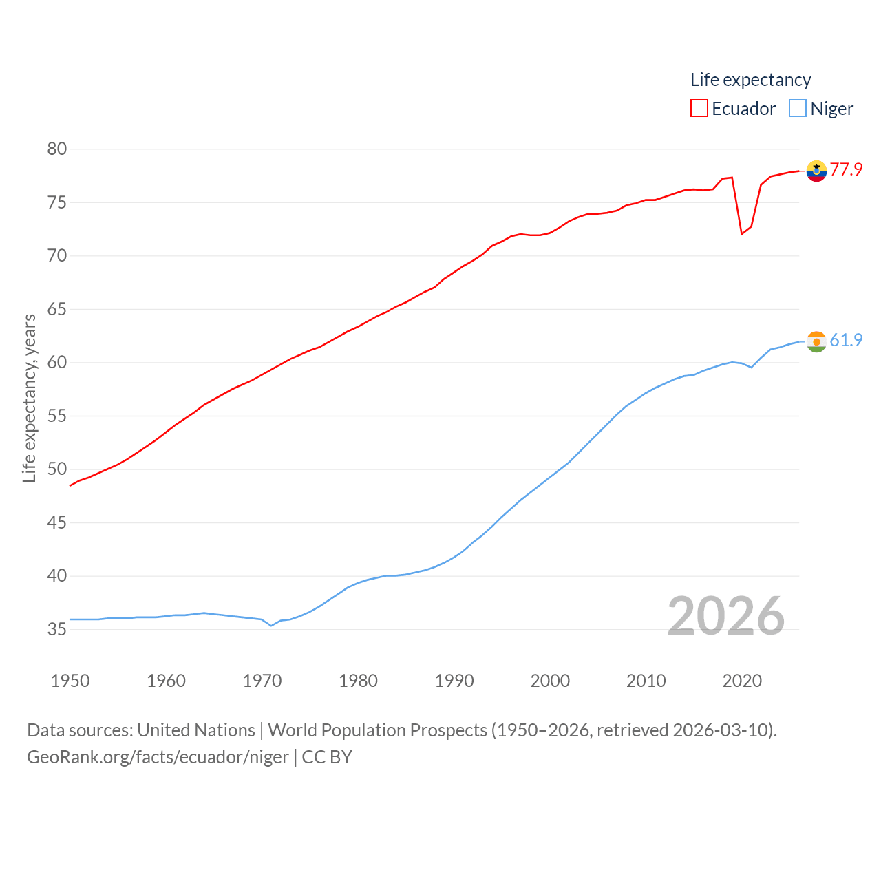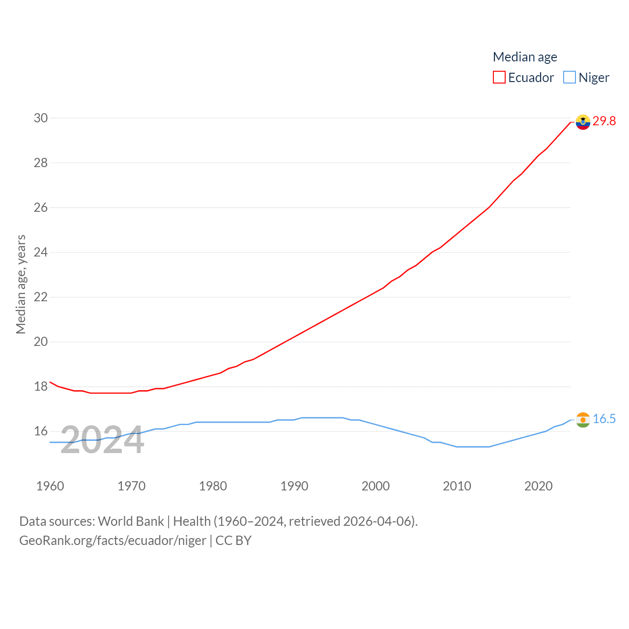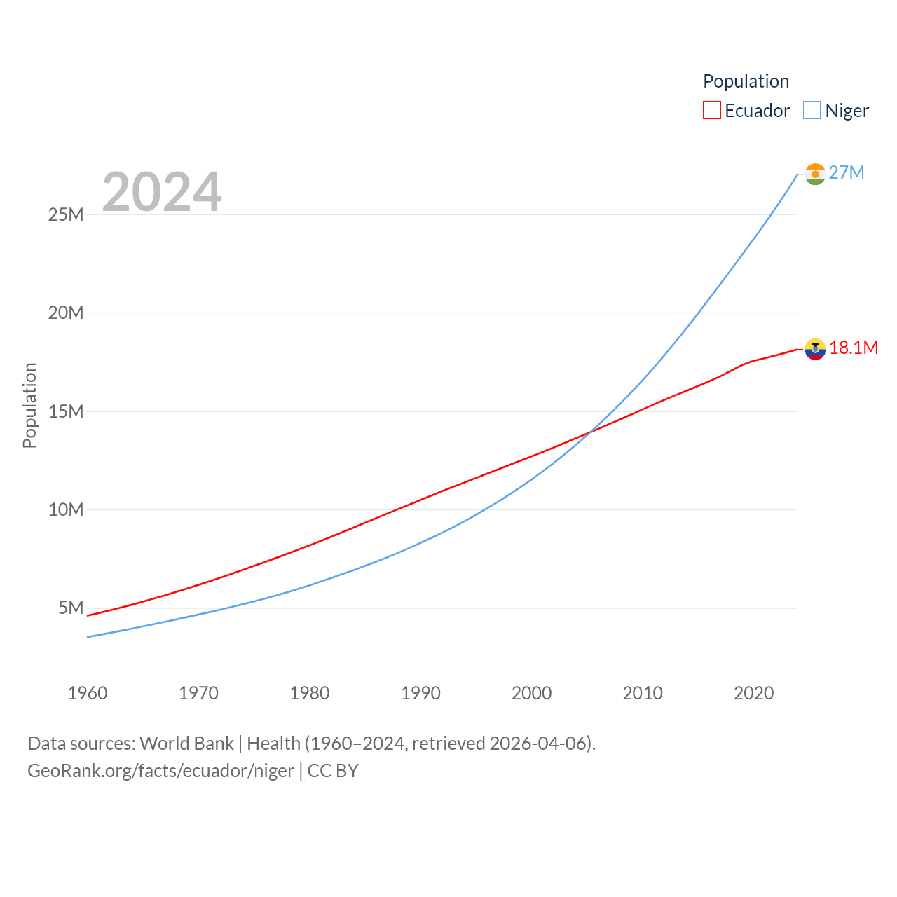 Ecuador has a population of 18.1M (ranked 71/197), compared with 27M in Niger (ranked 55/197). Ecuador's land area is 95,892 sq mi versus 489,076 sq mi for Niger (ranked 76th vs. 20th).