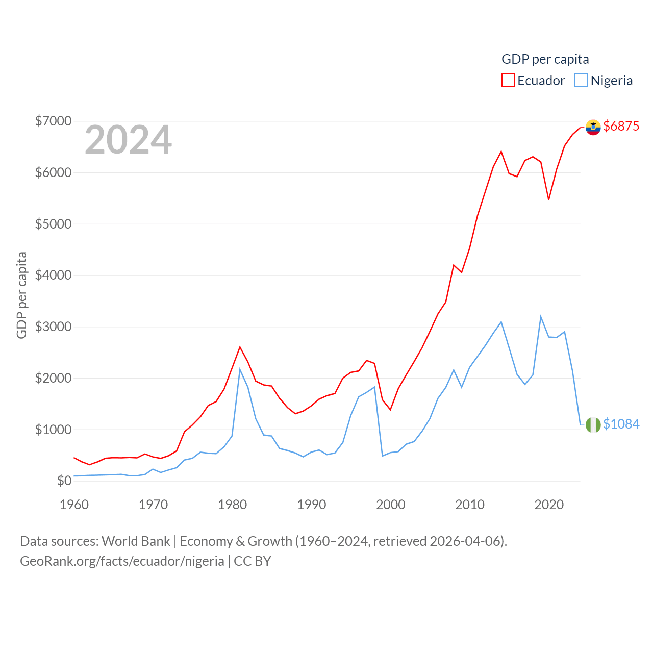 By GDP, Ecuador ranks 62/197 ($125B) and Nigeria ranks 54/197 ($252B). By GDP per capita, Ecuador ranks 103/197 ($6,875), while Nigeria ranks 174/197 ($1,084).