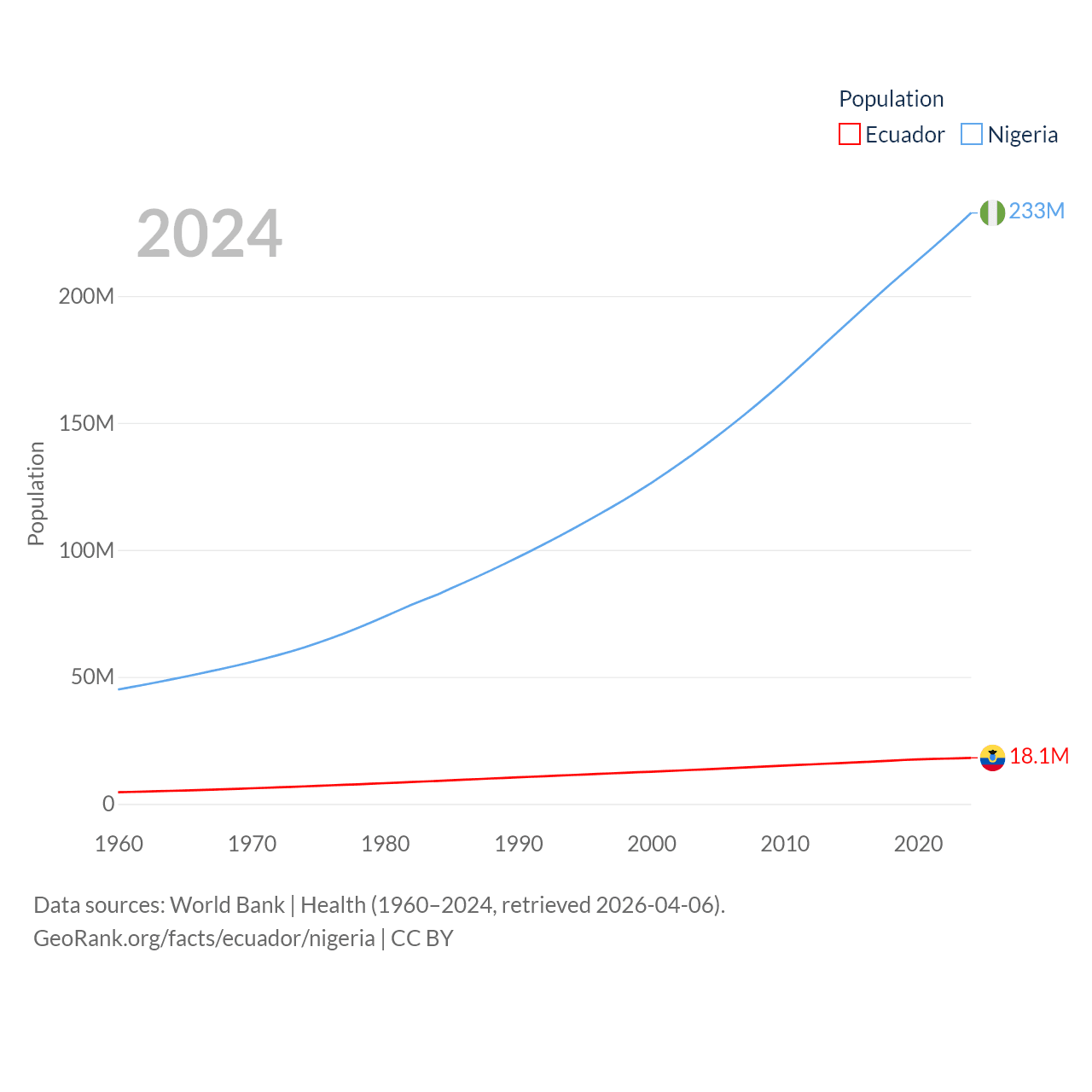 Ecuador has a population of 18.1M (ranked 71/197), compared with 233M in Nigeria (ranked 6/197). Ecuador's land area is 95,892 sq mi versus 351,650 sq mi for Nigeria (ranked 76th vs. 30th).