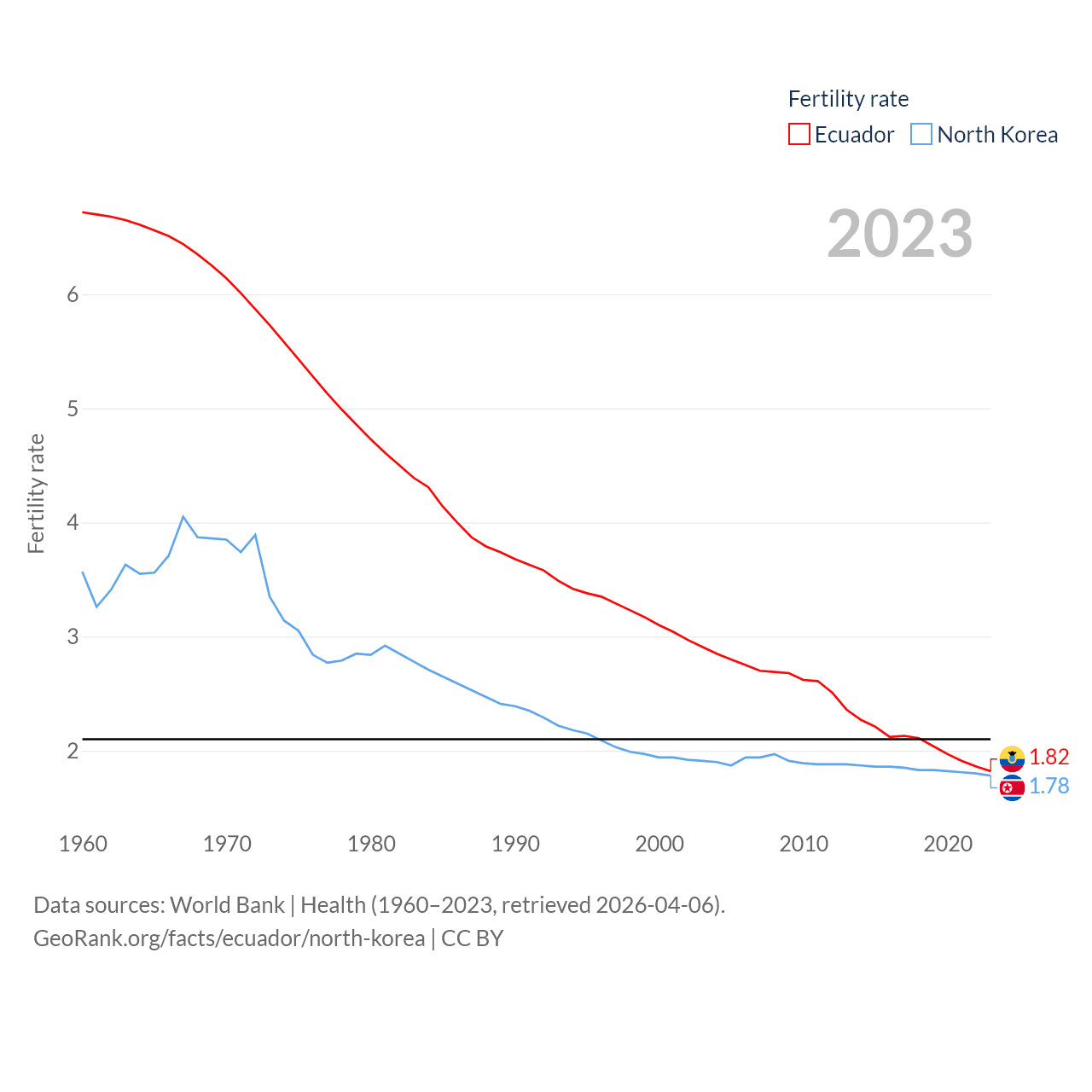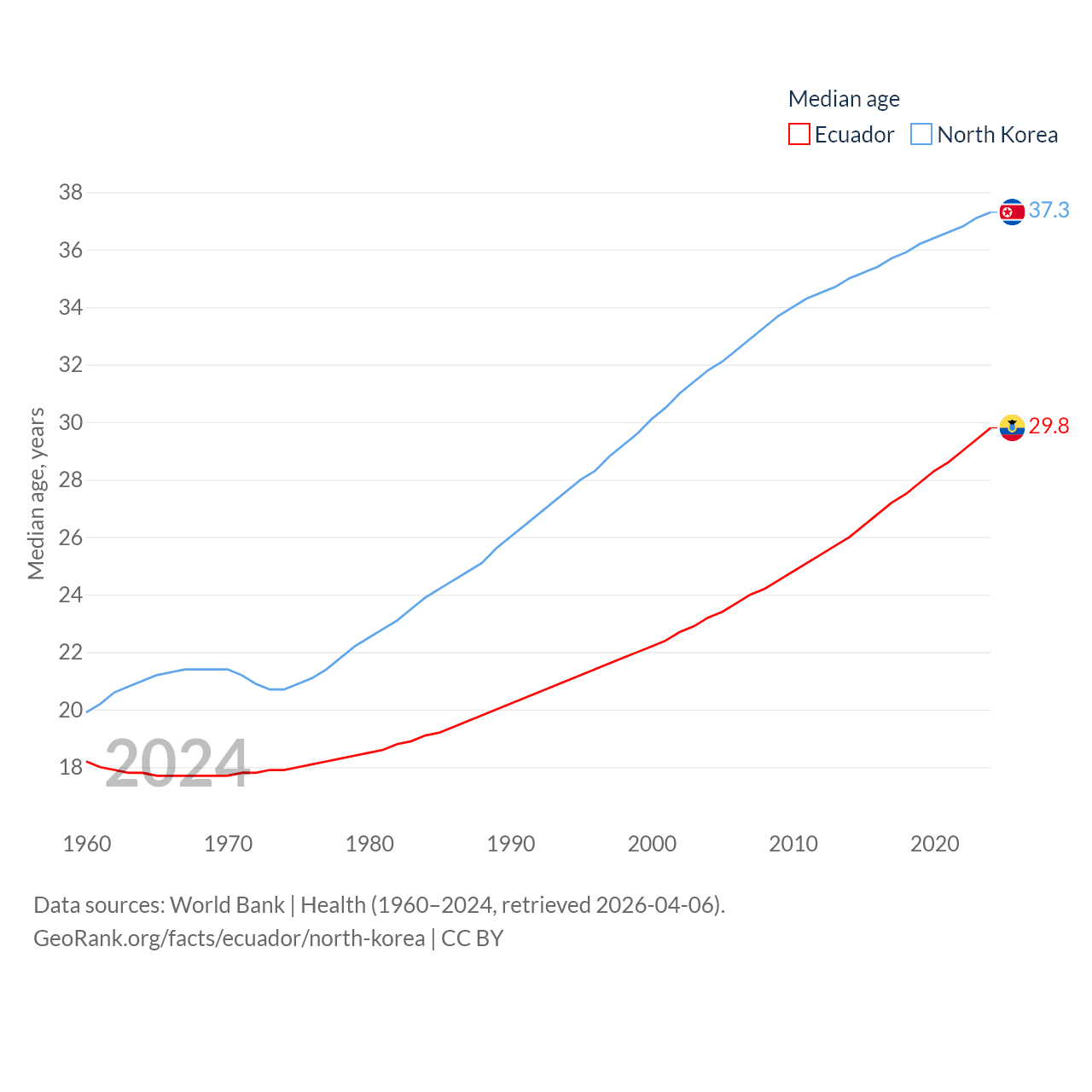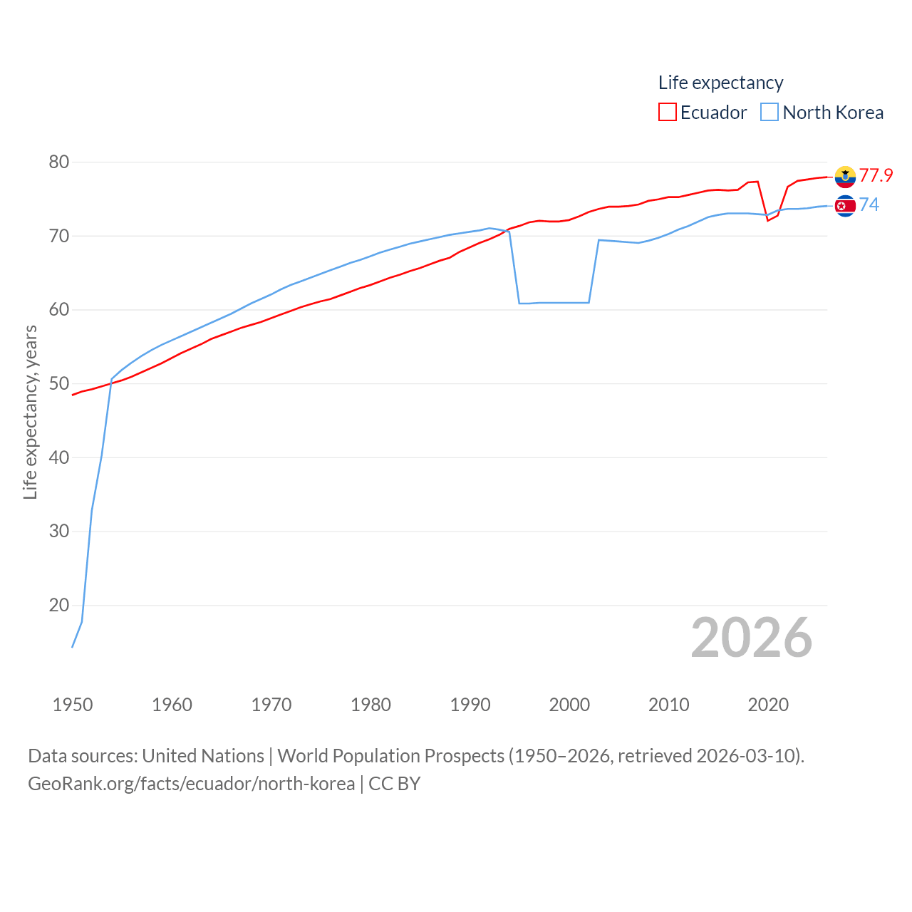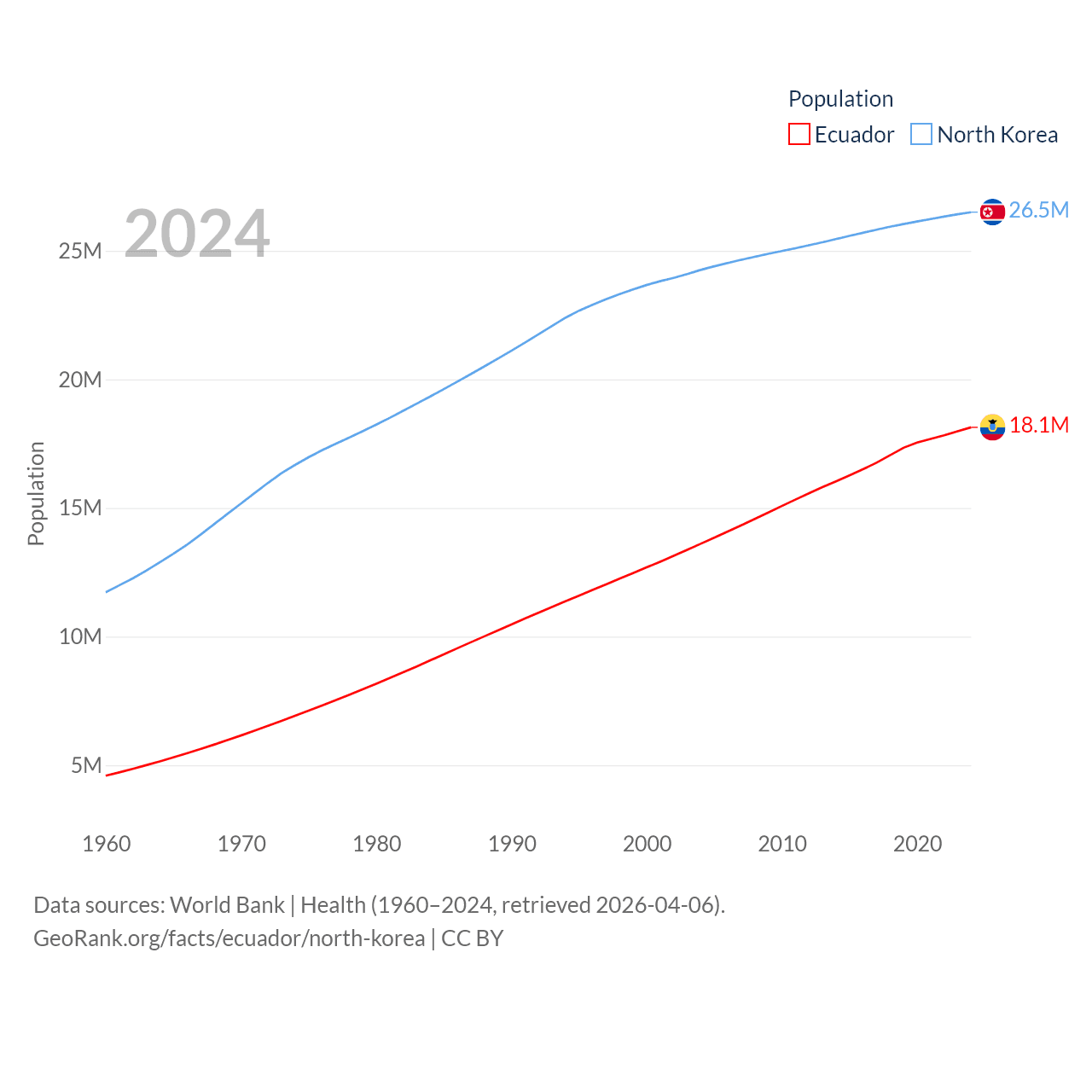 Ecuador has a population of 18.1M (ranked 71/197), compared with 26.5M in North Korea (ranked 56/197). Ecuador's land area is 95,892 sq mi versus 46,491 sq mi for North Korea (ranked 76th vs. 97th).