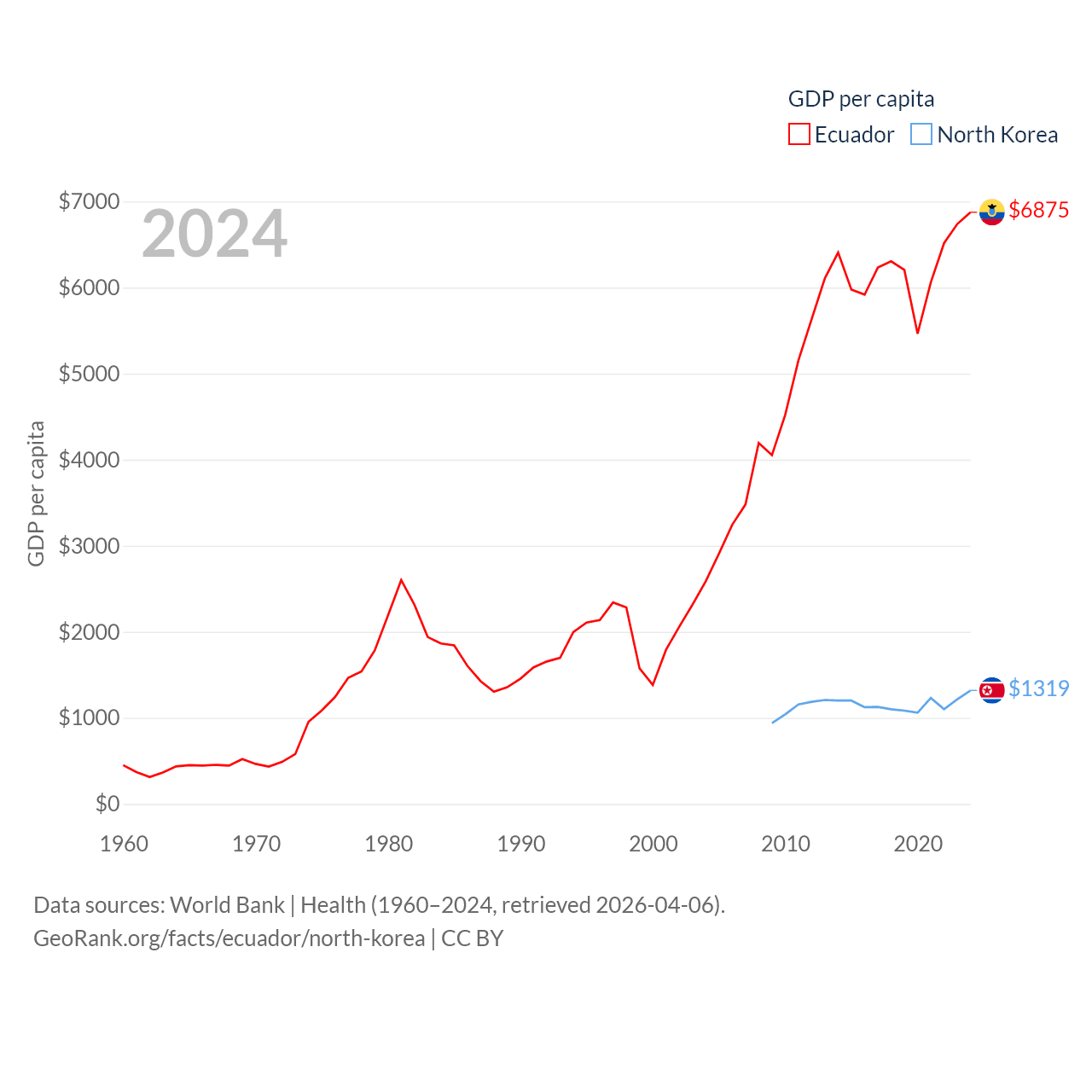 By GDP, Ecuador ranks 62/197 ($125B) and North Korea ranks 106/197 ($34.9B). By GDP per capita, Ecuador ranks 103/197 ($6,875), while North Korea ranks 168/197 ($1,319).
