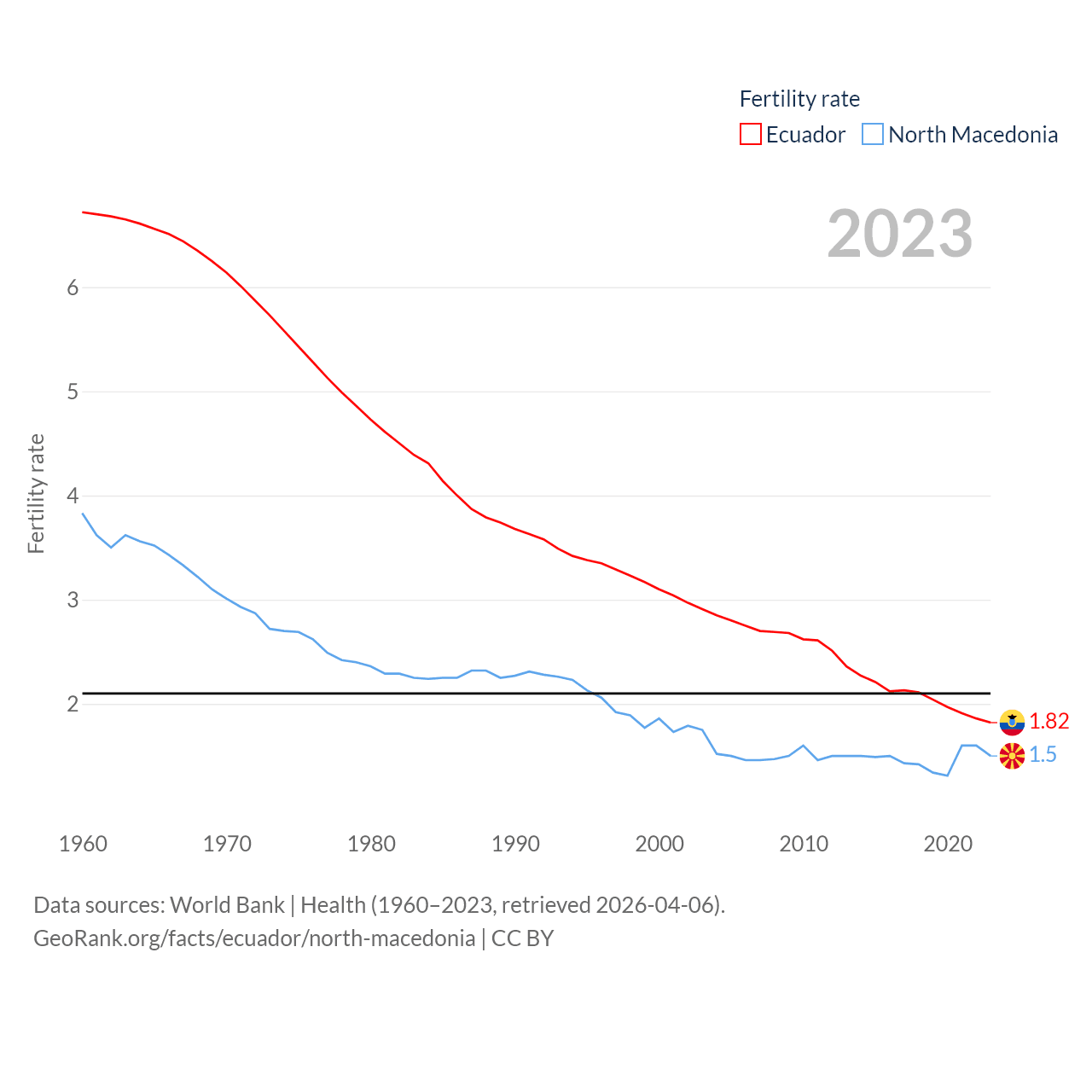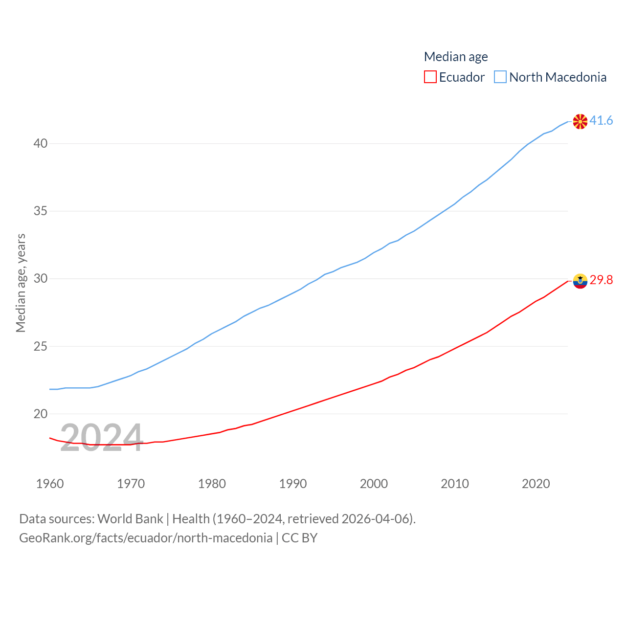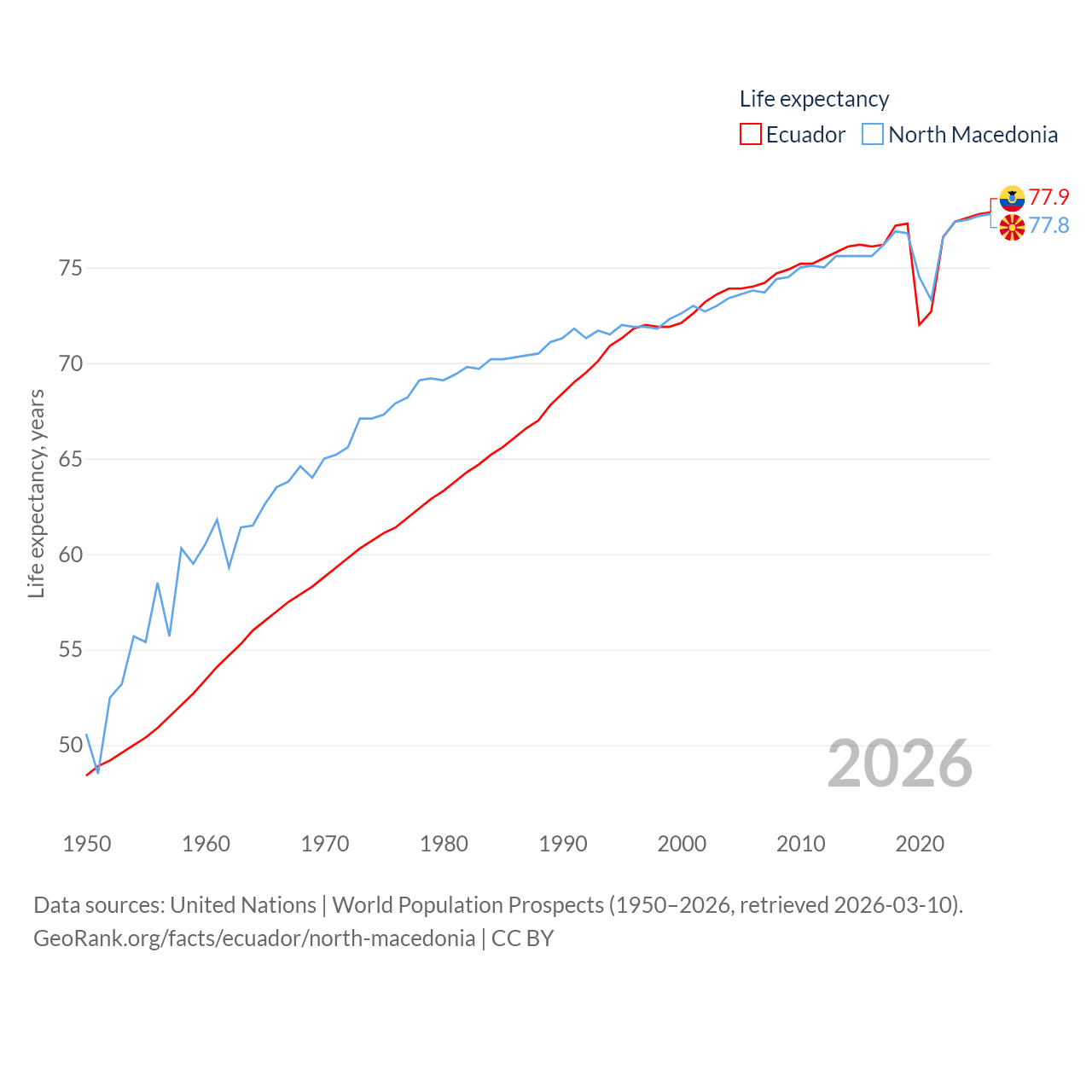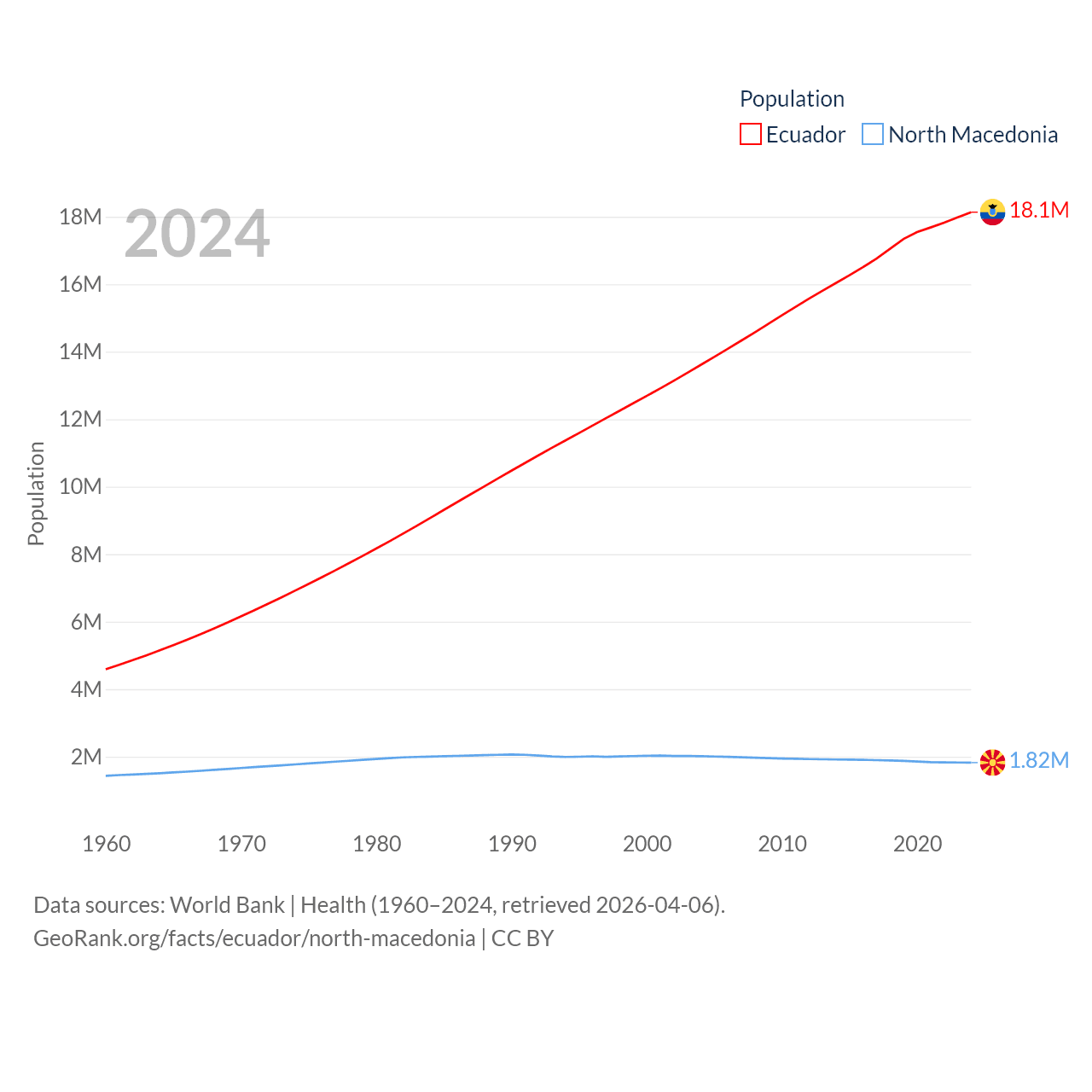 Ecuador has a population of 18.1M (ranked 71/197), compared with 1.82M in North Macedonia (ranked 150/197). Ecuador's land area is 95,892 sq mi versus 9,737 sq mi for North Macedonia (ranked 76th vs. 145th).