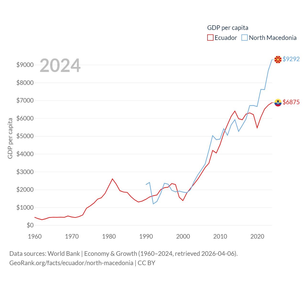 By GDP, Ecuador ranks 62/197 ($125B) and North Macedonia ranks 138/197 ($17B). By GDP per capita, Ecuador ranks 103/197 ($6,875), while North Macedonia ranks 88/197 ($9,292).