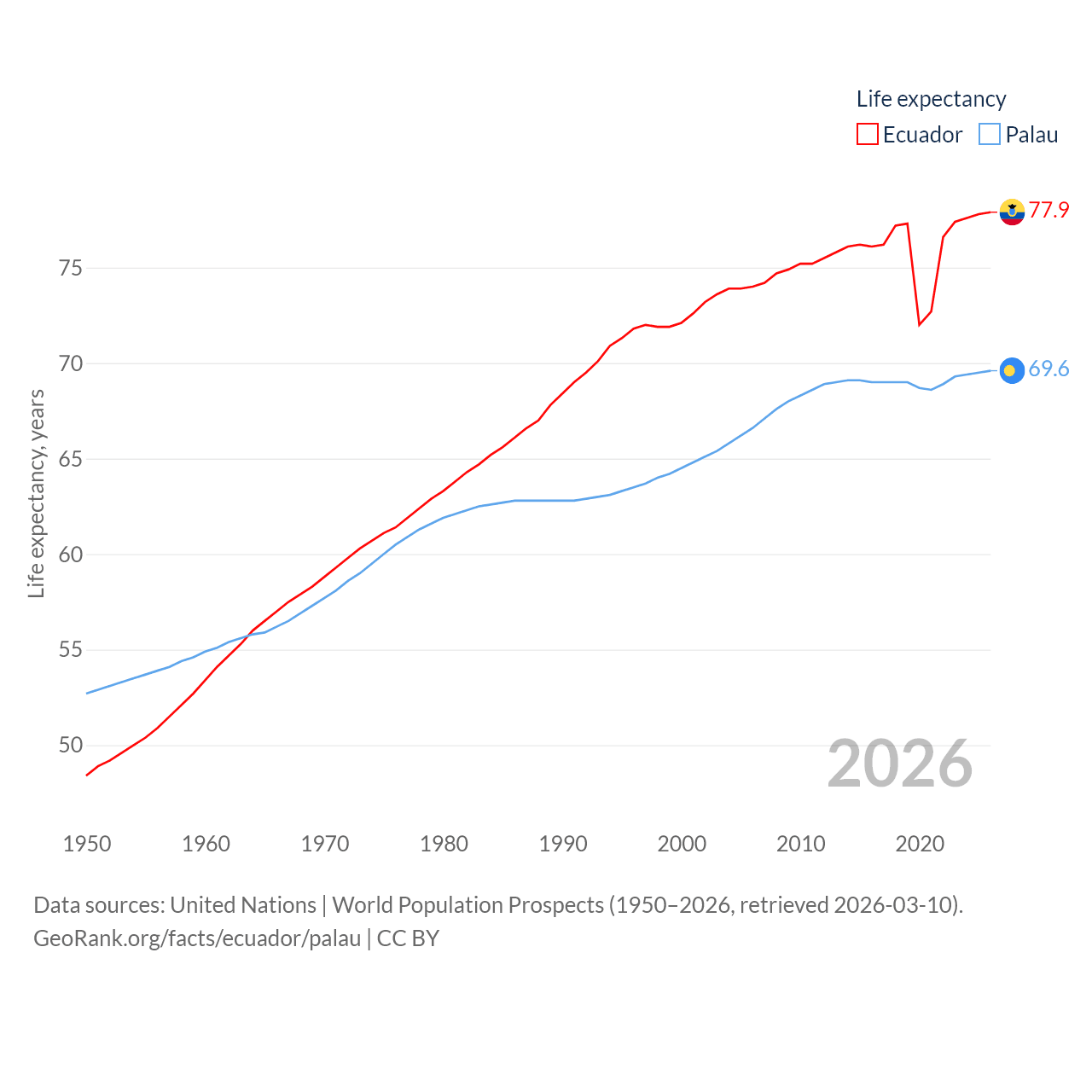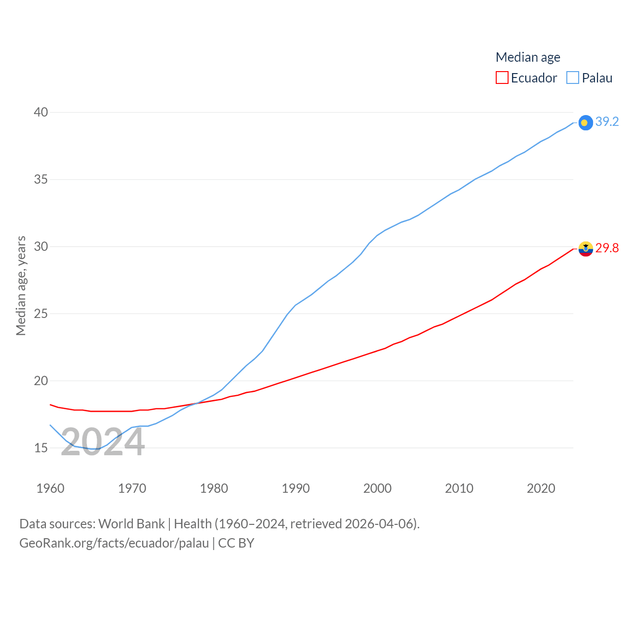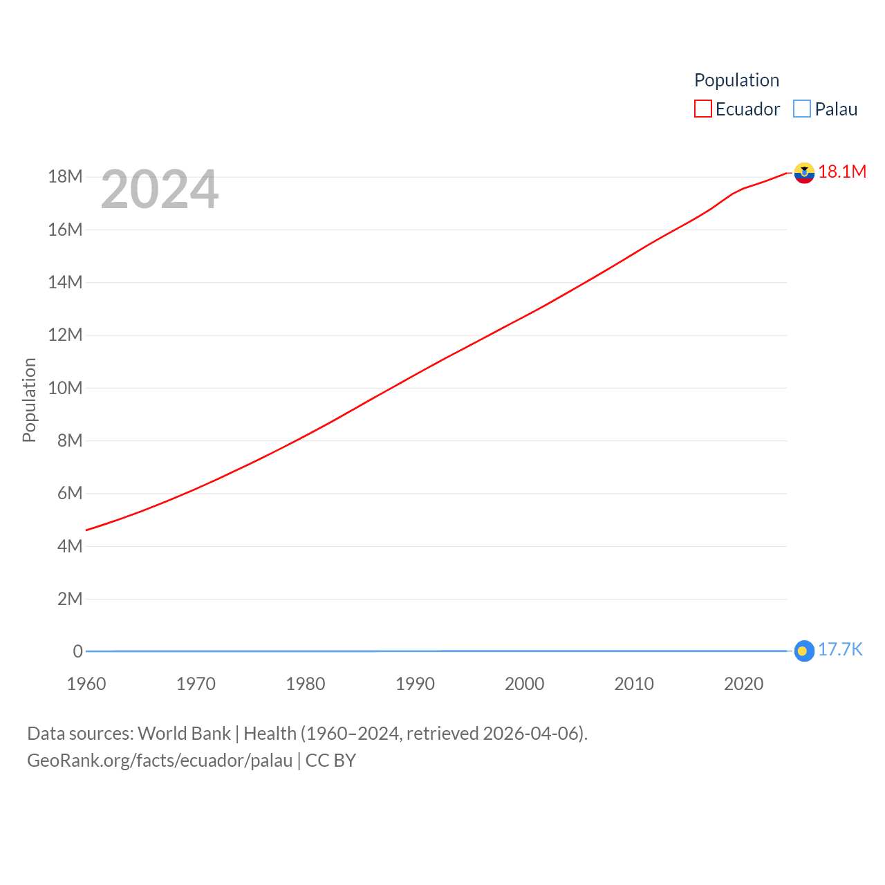 Ecuador has a population of 18.1M (ranked 71/197), compared with 17.7K in Palau (ranked 194/197). Ecuador's land area is 95,892 sq mi versus 177.6 sq mi for Palau (ranked 76th vs. 180th).
