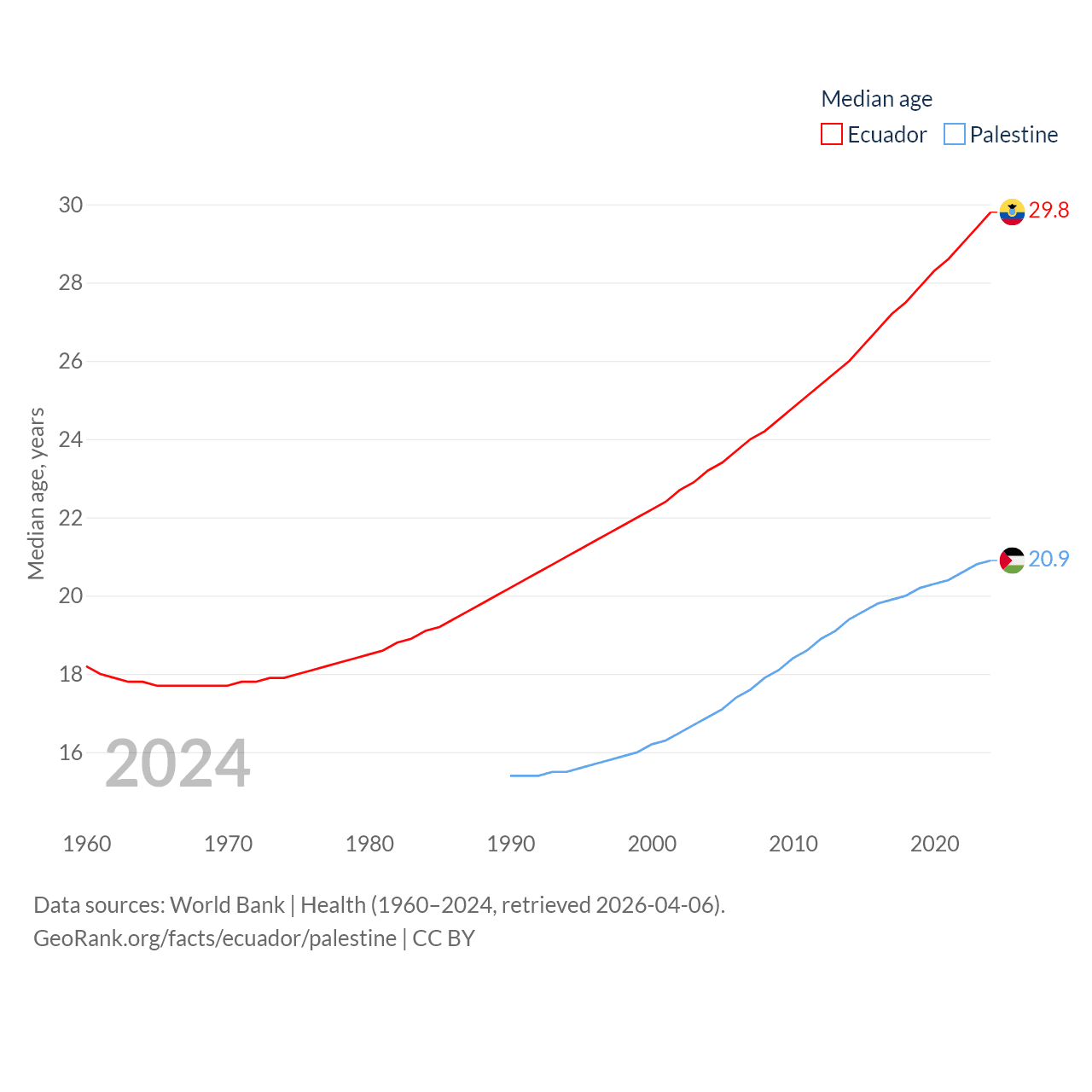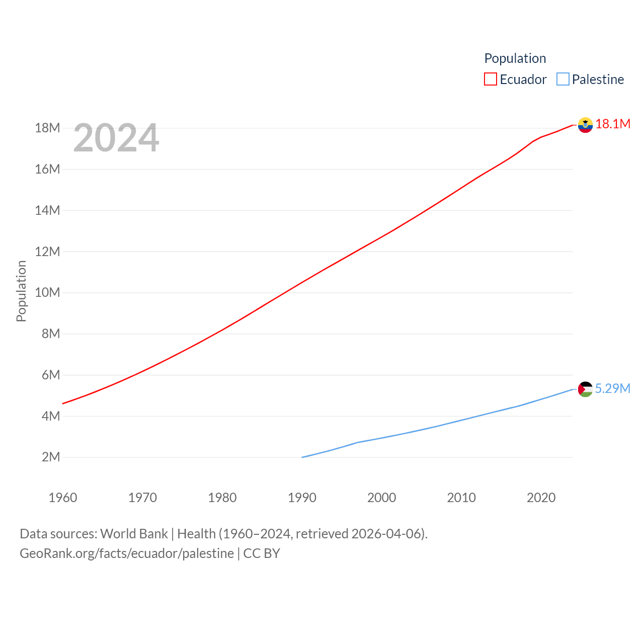 Ecuador has a population of 18.1M (ranked 71/197), compared with 5.29M in Palestine (ranked 122/197). Ecuador's land area is 95,892 sq mi versus 2,326 sq mi for Palestine (ranked 76th vs. 164th).
