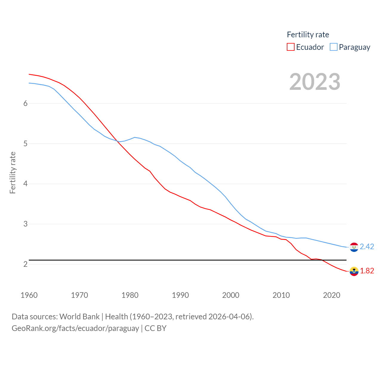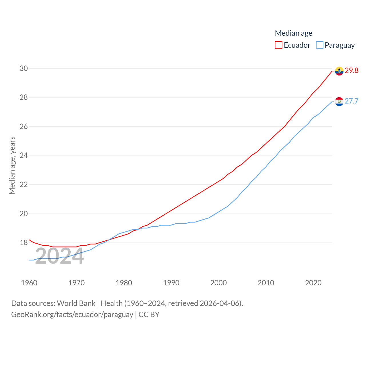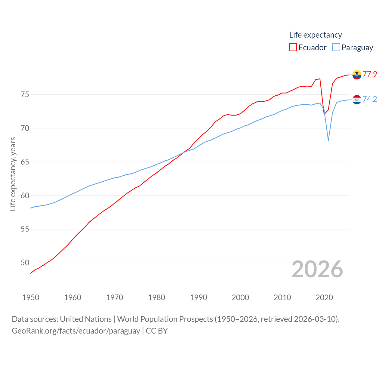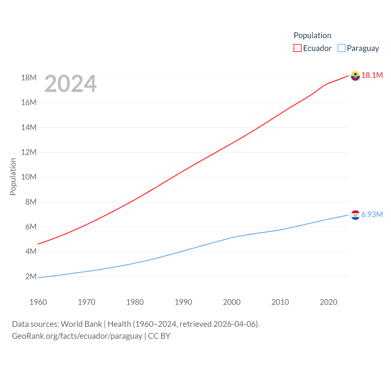 Ecuador has a population of 18.1M (ranked 71/197), compared with 6.93M in Paraguay (ranked 107/197). Ecuador's land area is 95,892 sq mi versus 152,901 sq mi for Paraguay (ranked 76th vs. 59th).