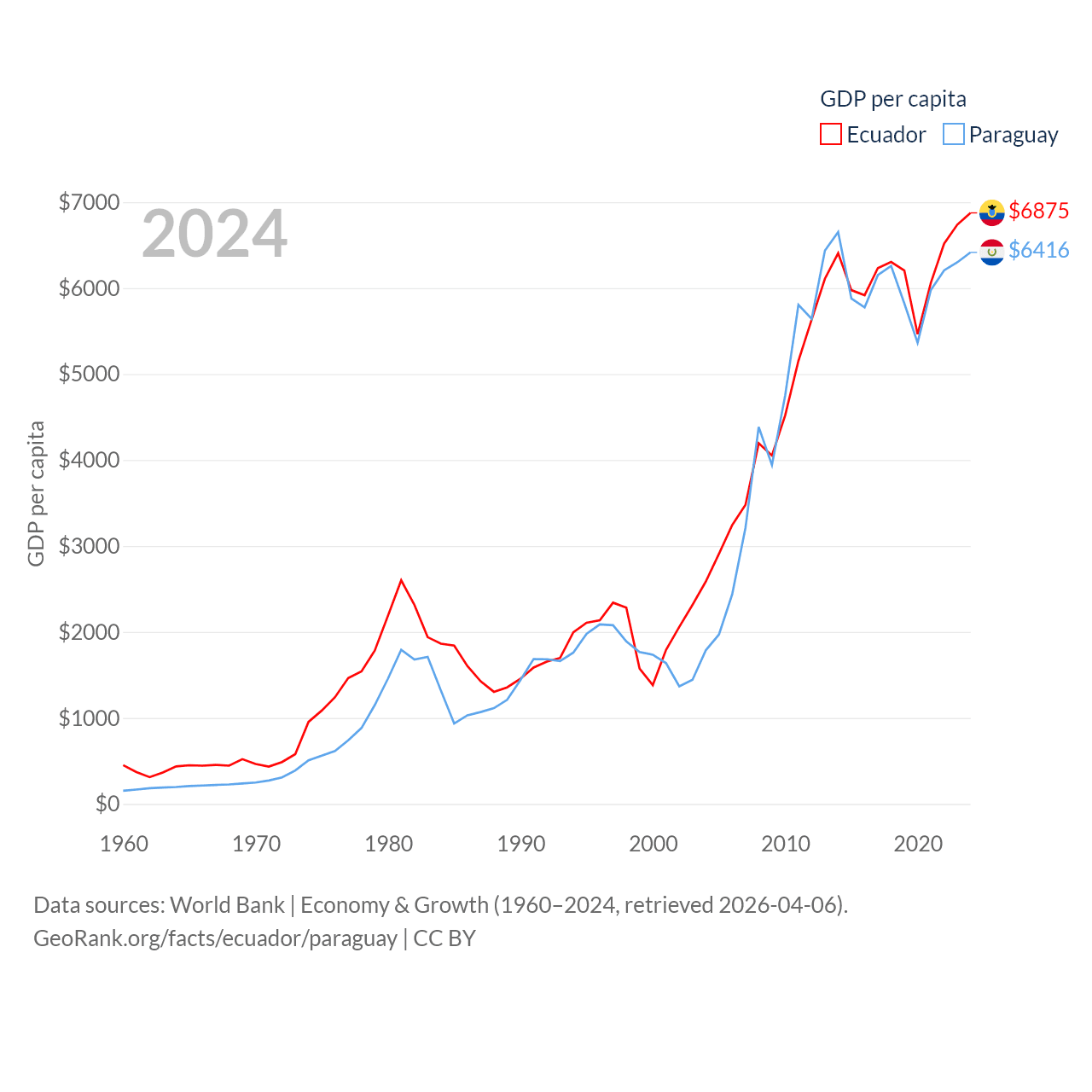 By GDP, Ecuador ranks 62/197 ($125B) and Paraguay ranks 98/197 ($44.5B). By GDP per capita, Ecuador ranks 103/197 ($6,875), while Paraguay ranks 109/197 ($6,416).