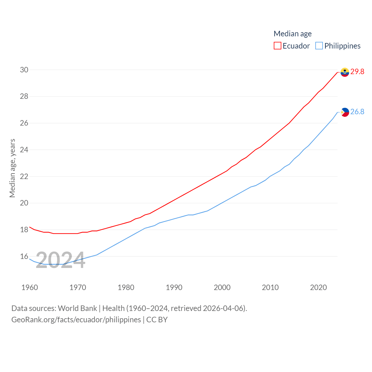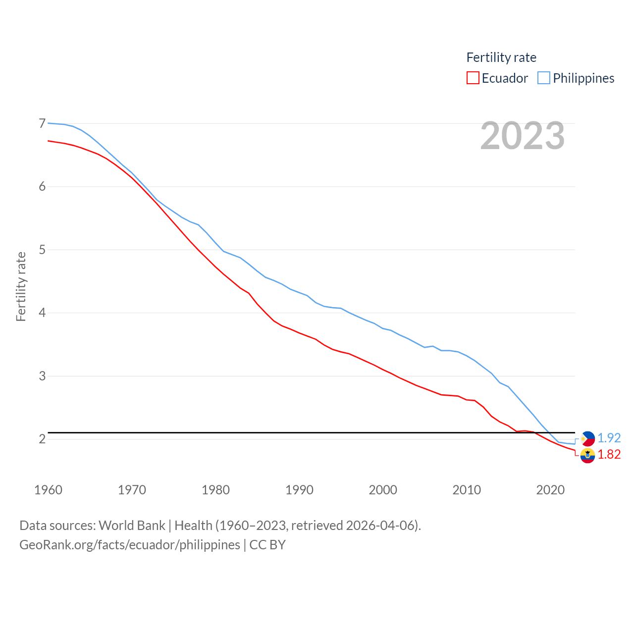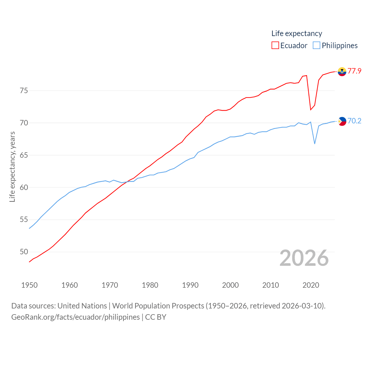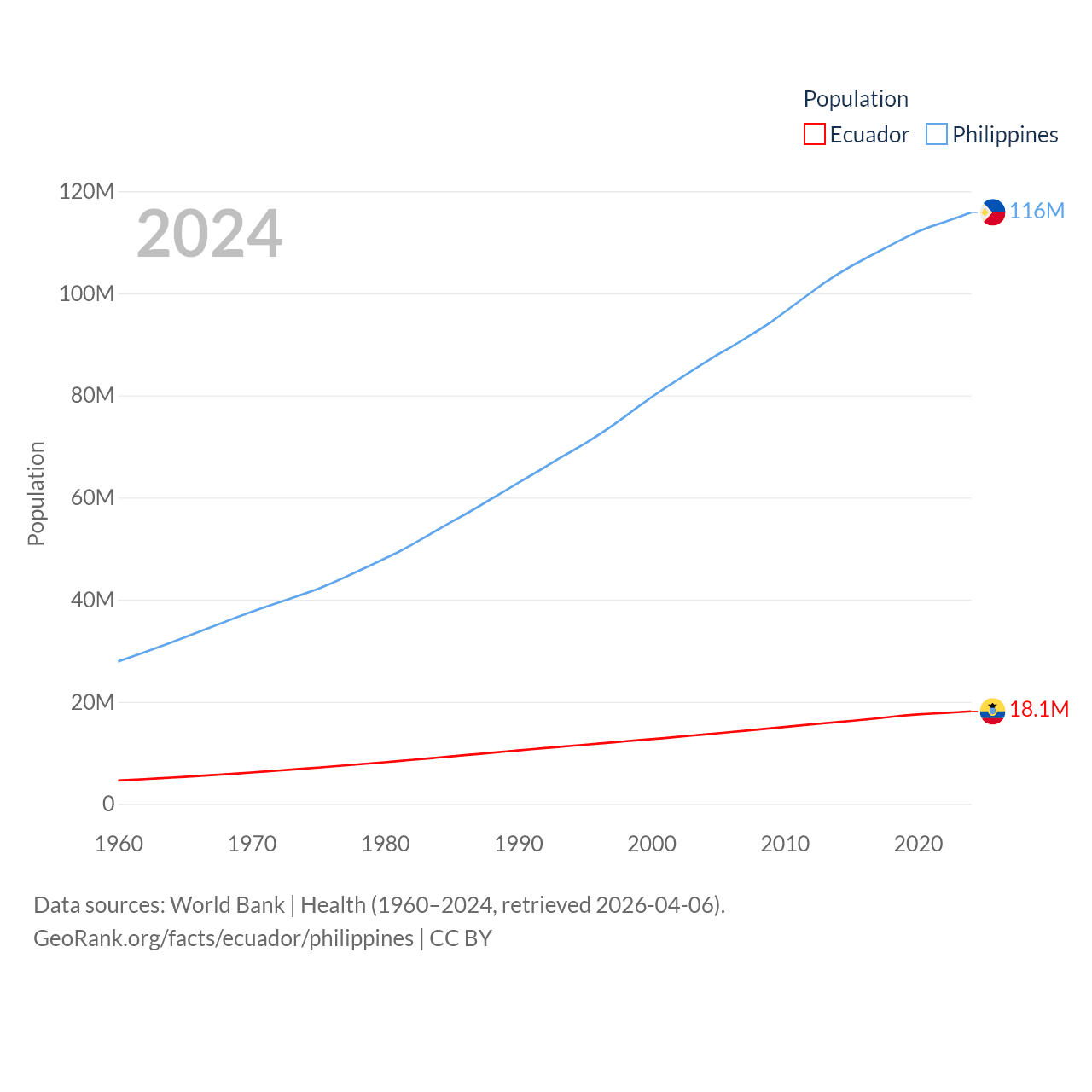 Ecuador has a population of 18.1M (ranked 71/197), compared with 116M in The Philippines (ranked 14/197). Ecuador's land area is 95,892 sq mi versus 115,124 sq mi for The Philippines (ranked 76th vs. 71st).