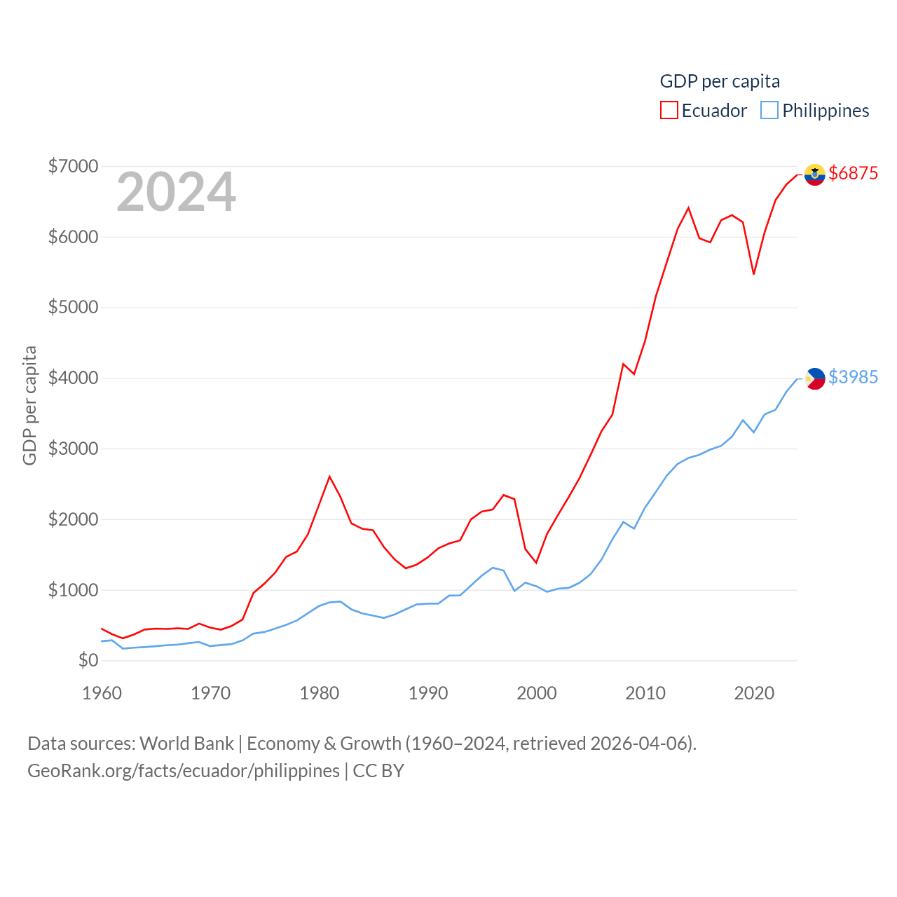 By GDP, Ecuador ranks 62/197 ($125B) and The Philippines ranks 35/197 ($462B). By GDP per capita, Ecuador ranks 103/197 ($6,875), while The Philippines ranks 130/197 ($3,985).