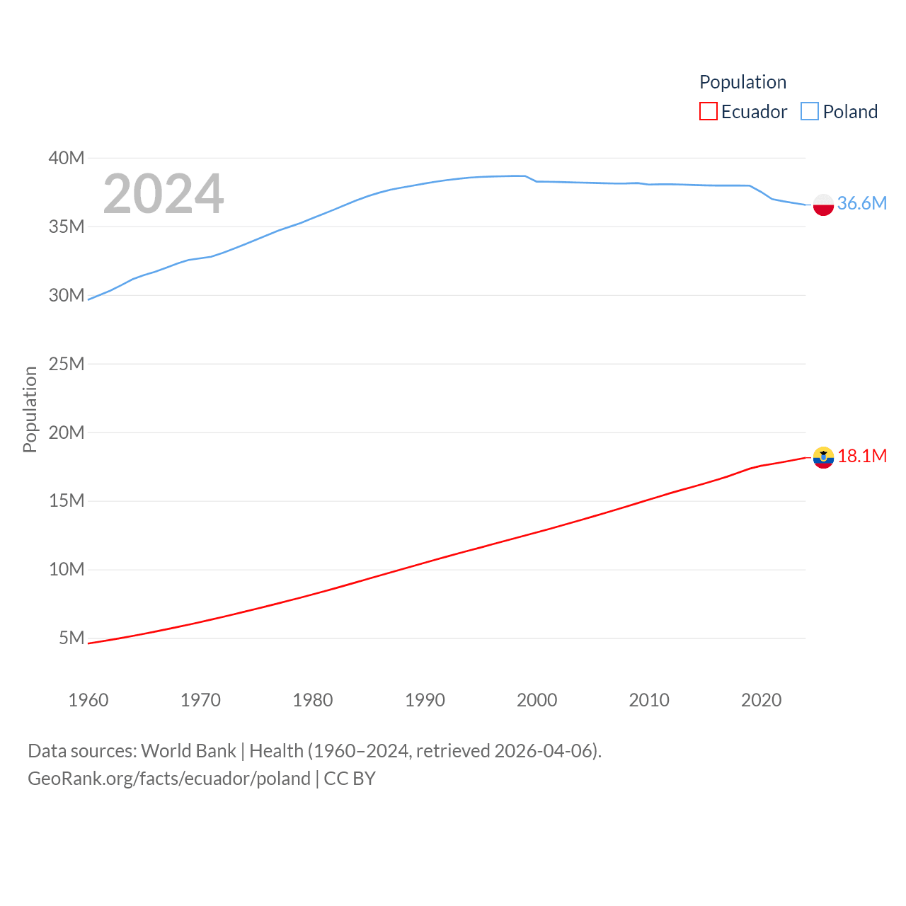 Ecuador has a population of 18.1M (ranked 71/197), compared with 36.6M in Poland (ranked 42/197). Ecuador's land area is 95,892 sq mi versus 118,252 sq mi for Poland (ranked 76th vs. 69th).