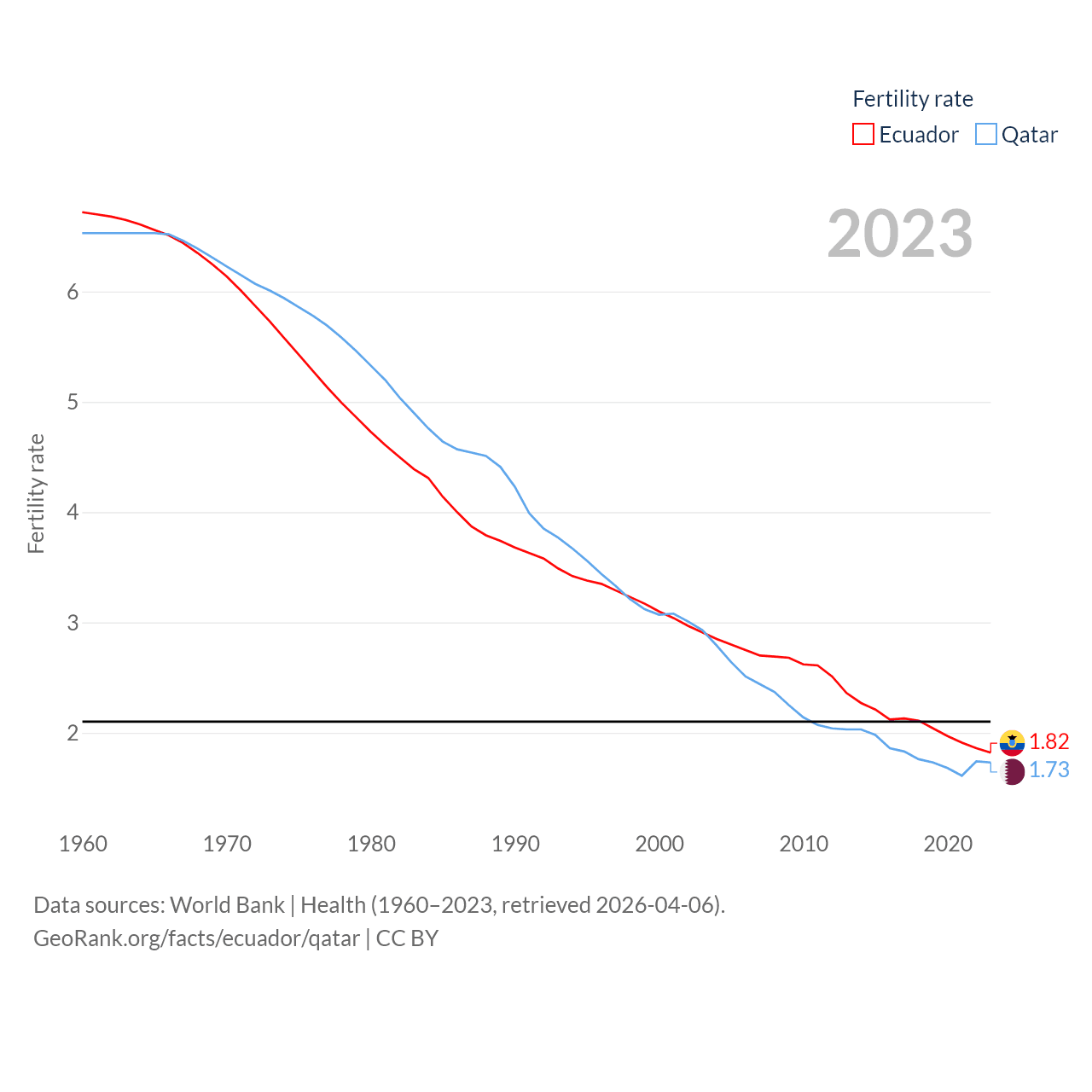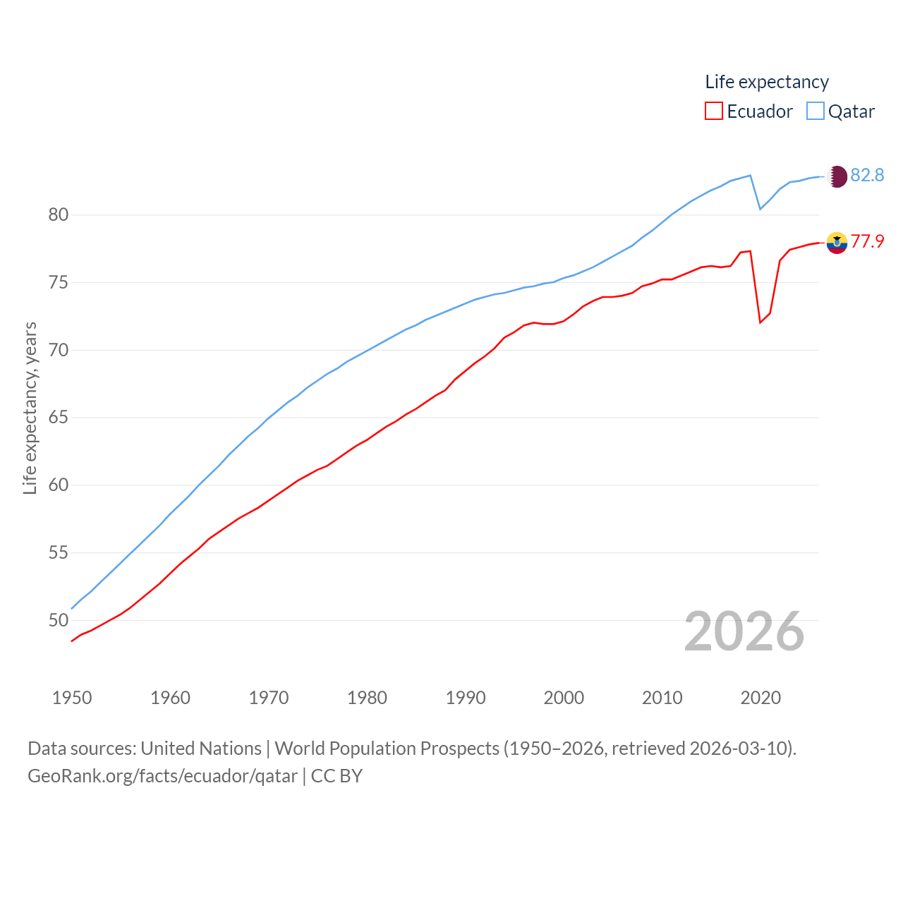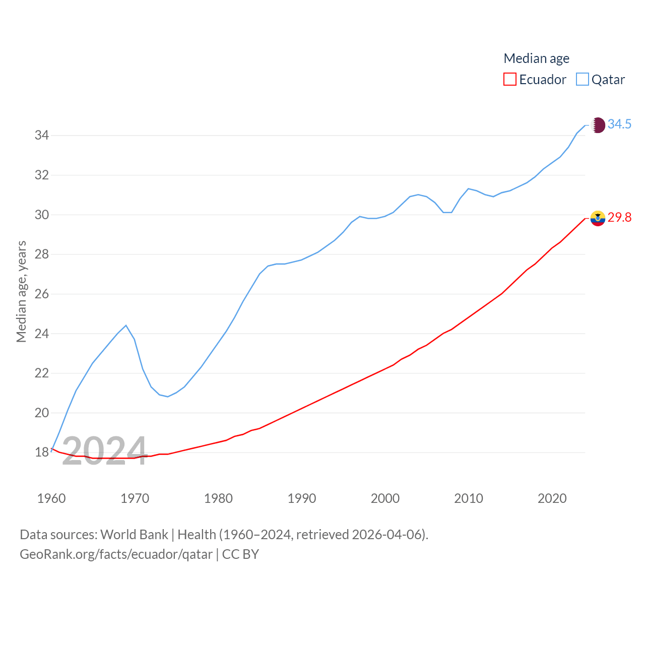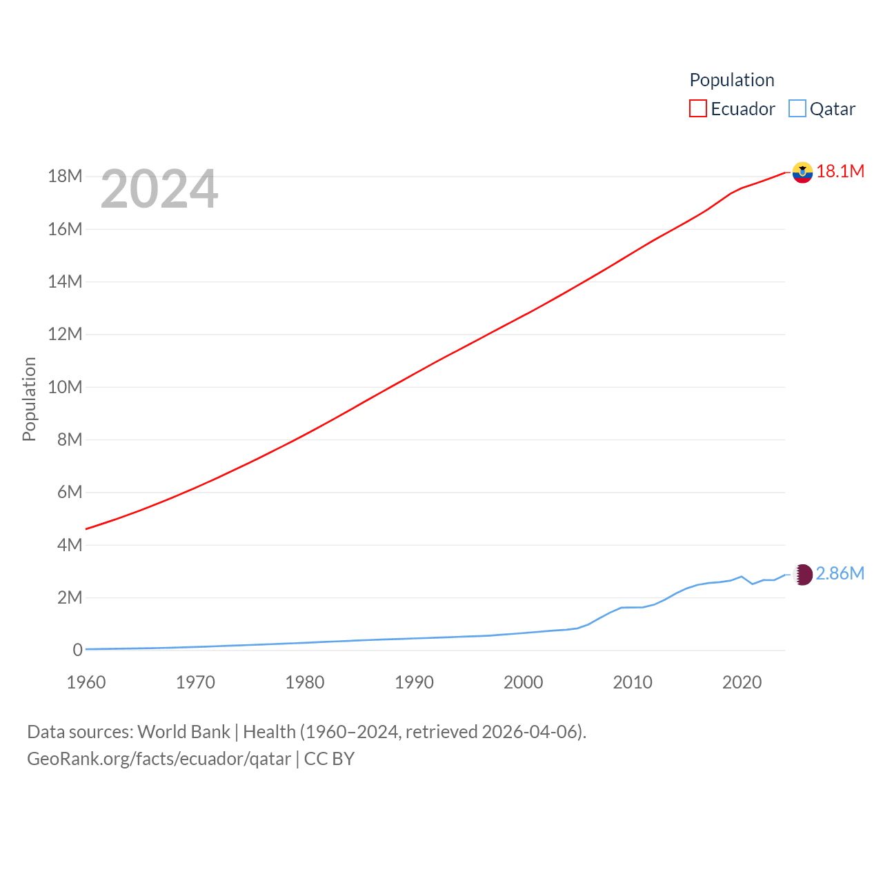 Ecuador has a population of 18.1M (ranked 71/197), compared with 2.86M in Qatar (ranked 138/197). Ecuador's land area is 95,892 sq mi versus 4,436 sq mi for Qatar (ranked 76th vs. 158th).