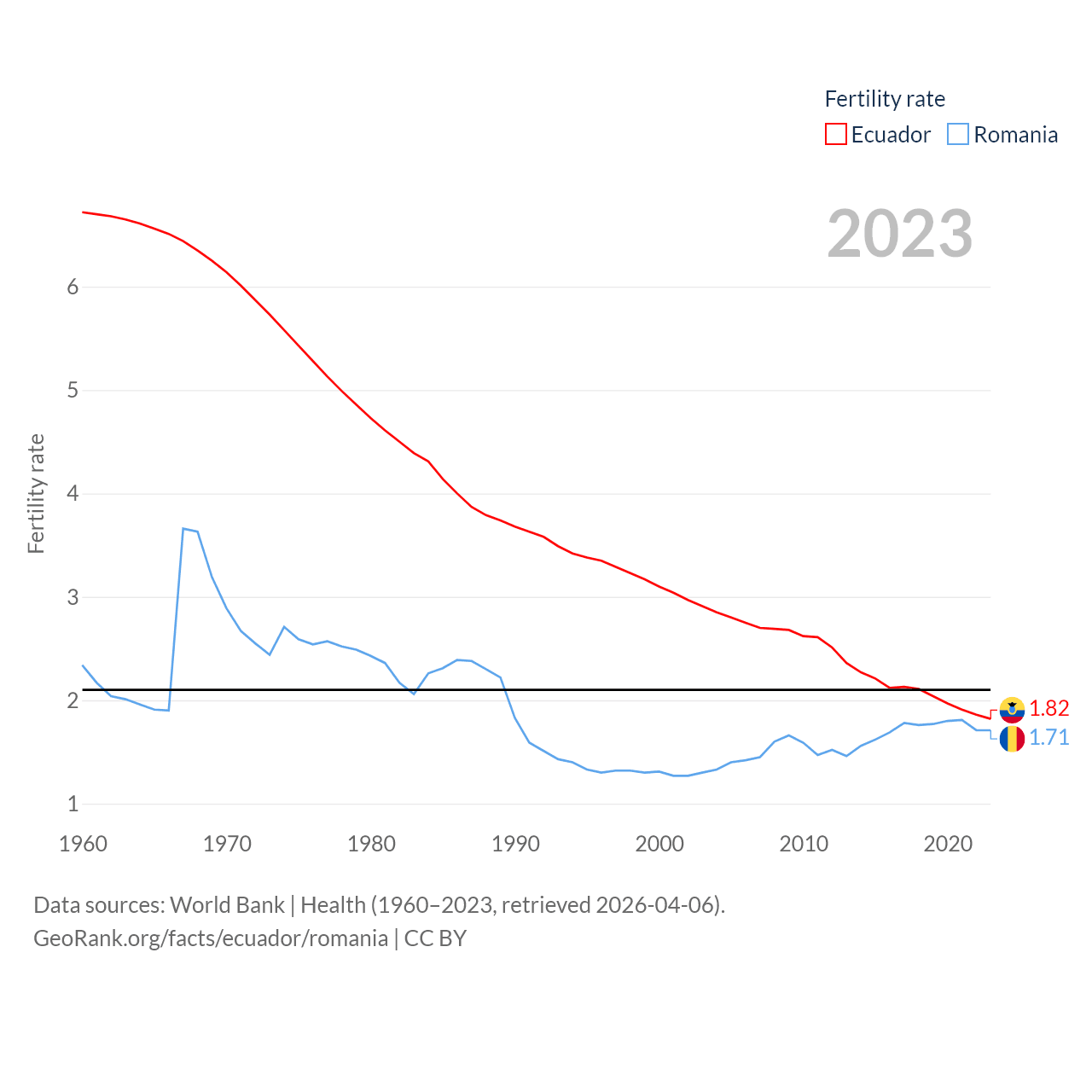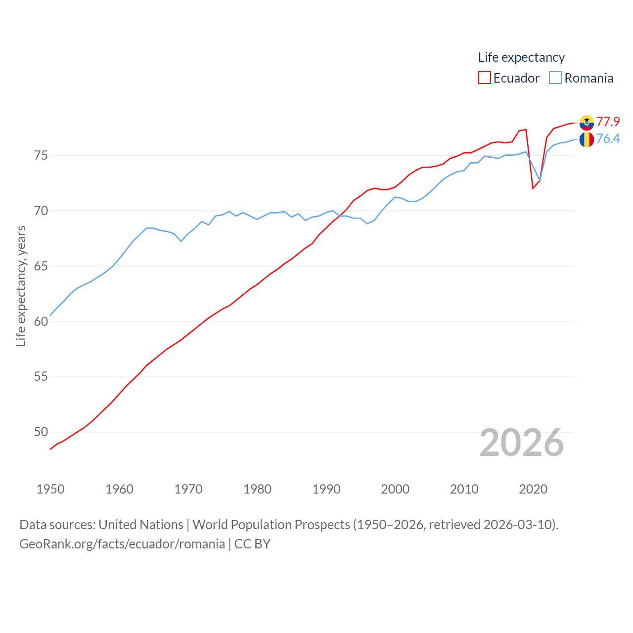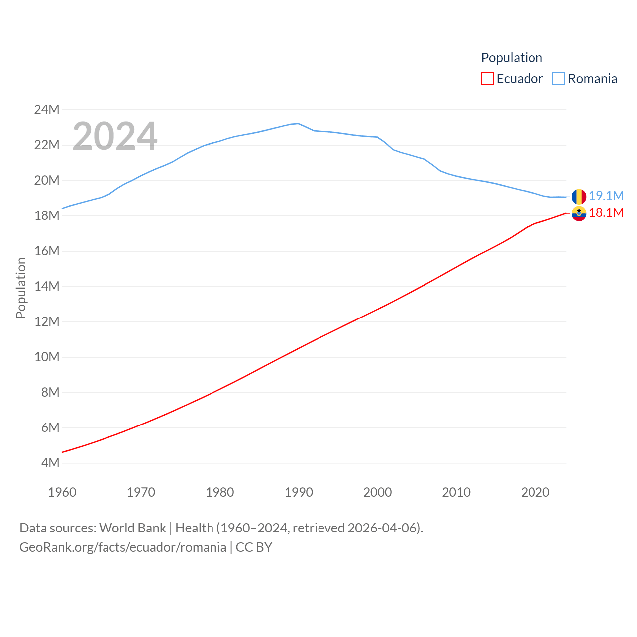 Ecuador has a population of 18.1M (ranked 71/197), compared with 19.1M in Romania (ranked 67/197). Ecuador's land area is 95,892 sq mi versus 88,834 sq mi for Romania (ranked 76th vs. 80th).
