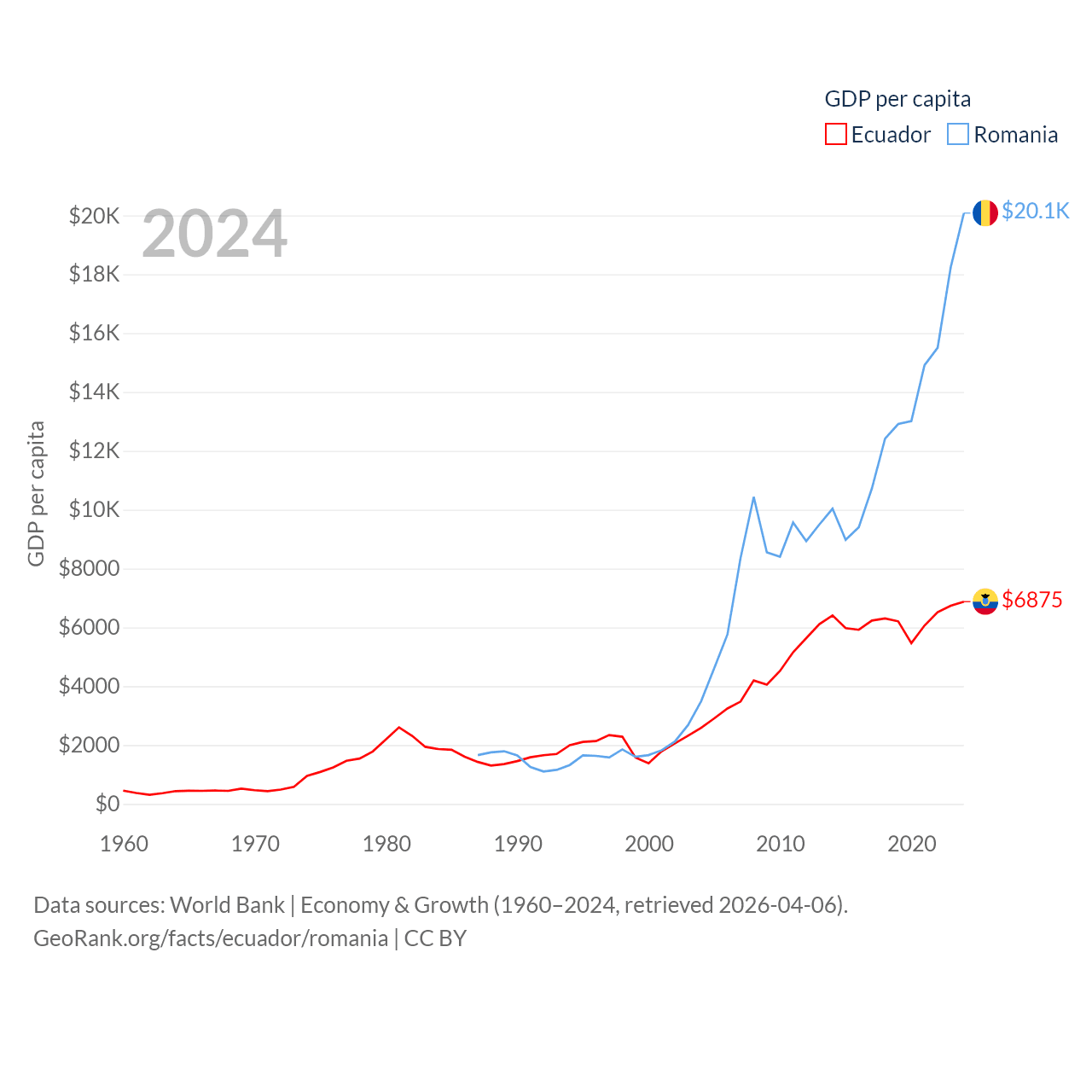 By GDP, Ecuador ranks 62/197 ($125B) and Romania ranks 42/197 ($383B). By GDP per capita, Ecuador ranks 103/197 ($6,875), while Romania ranks 58/197 ($20,080).
